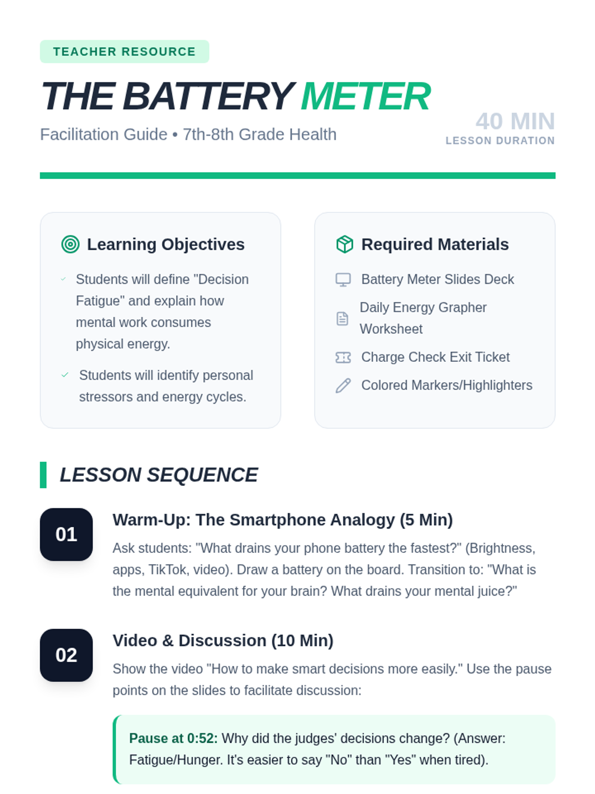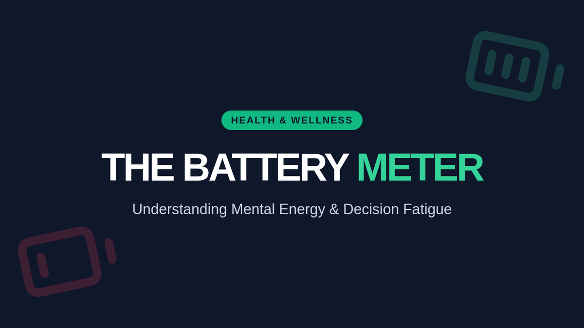 A health lesson for 7th-8th graders exploring the concept of decision fatigue and mental energy through the metaphor of a battery meter. Students will analyze their own daily energy levels and learn strategies to align high-stakes decisions with peak energy times.
