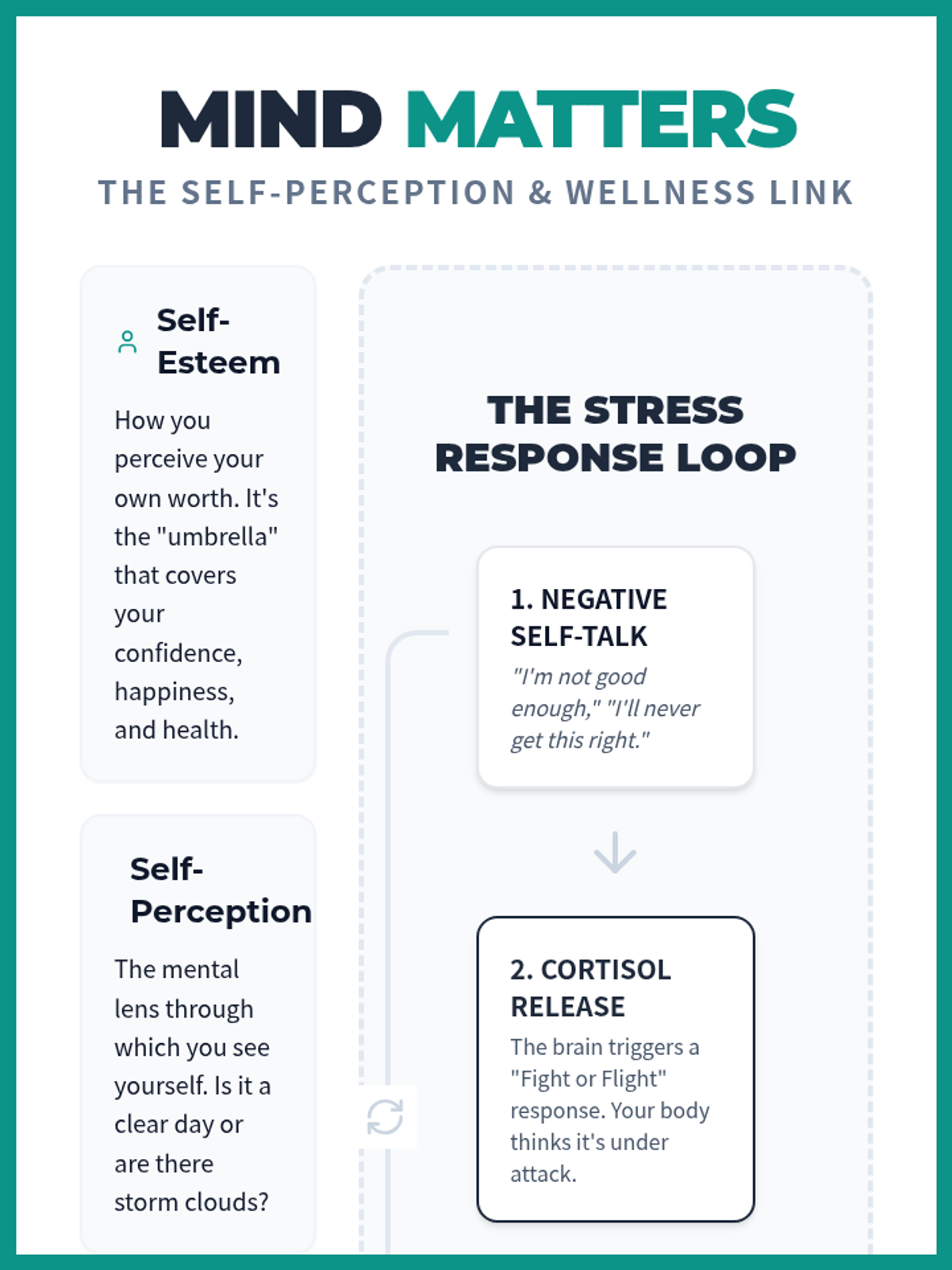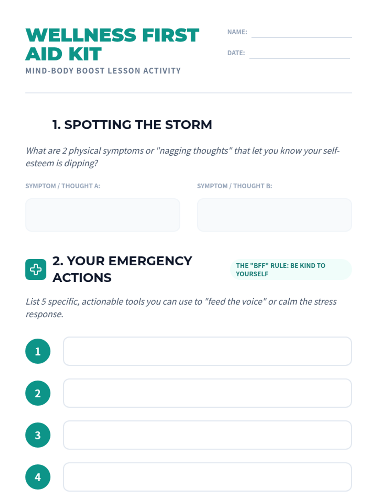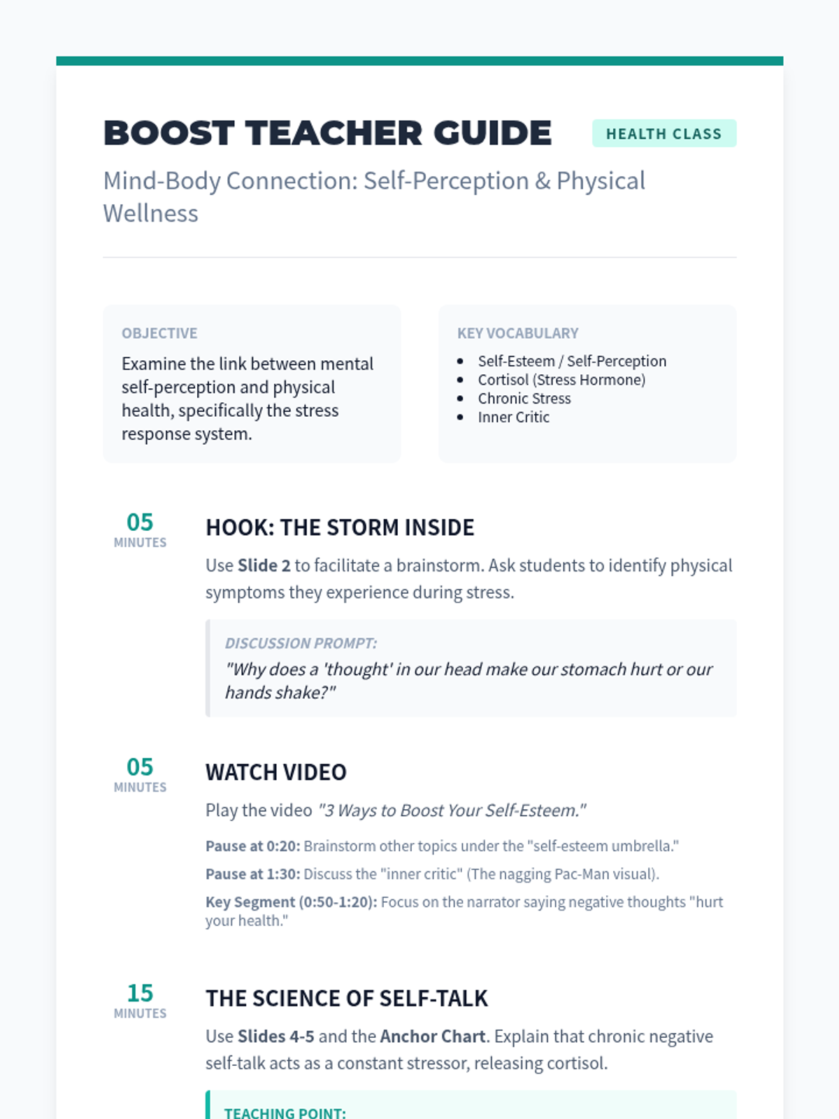 A lesson for health class examining how mental self-perception and negative self-talk trigger the body's stress response, impacting physical wellness. Students learn about cortisol and create a personal 'First Aid Kit' of actionable self-esteem boosters.