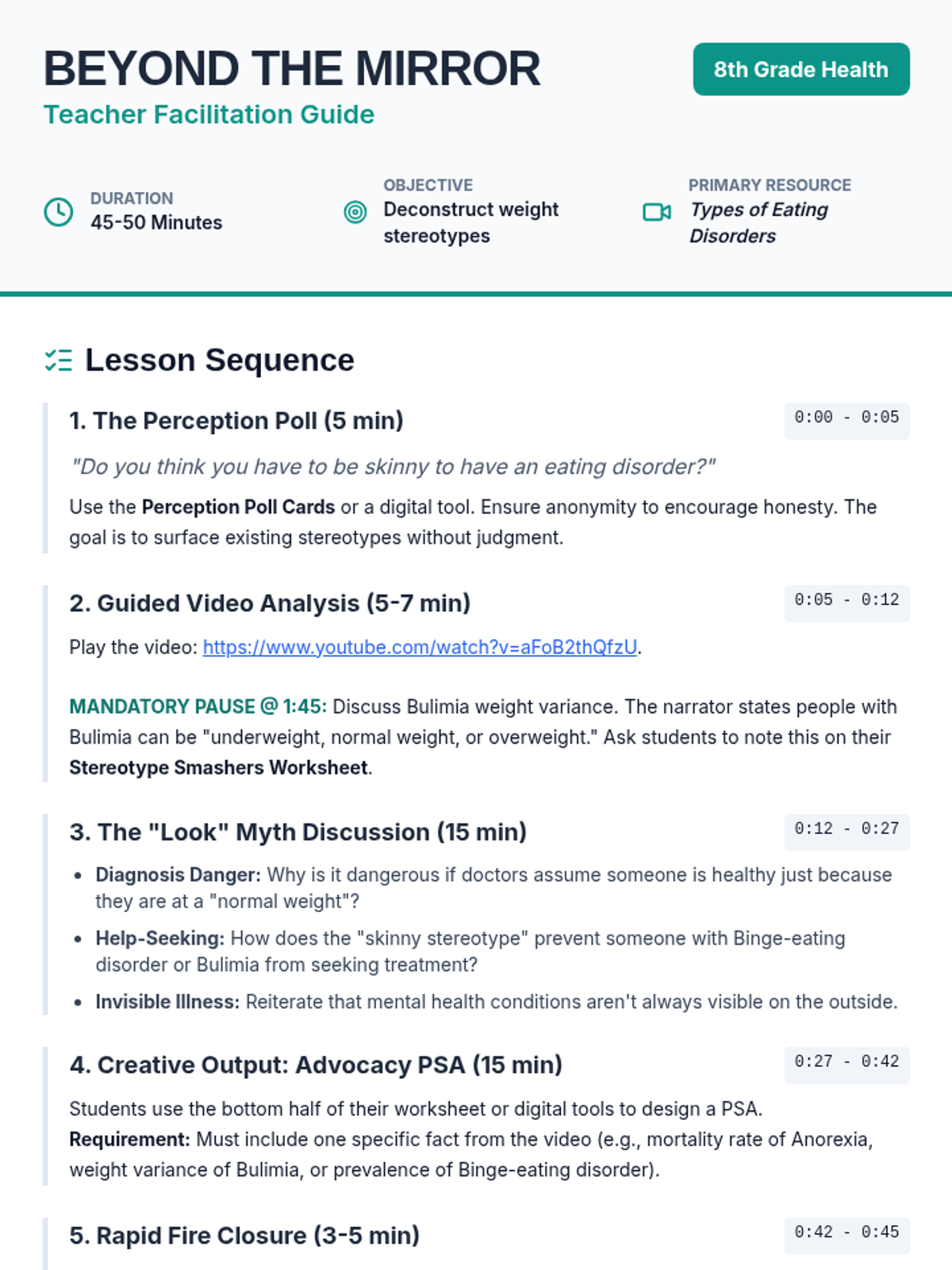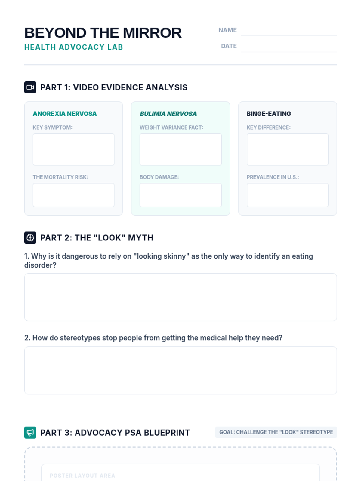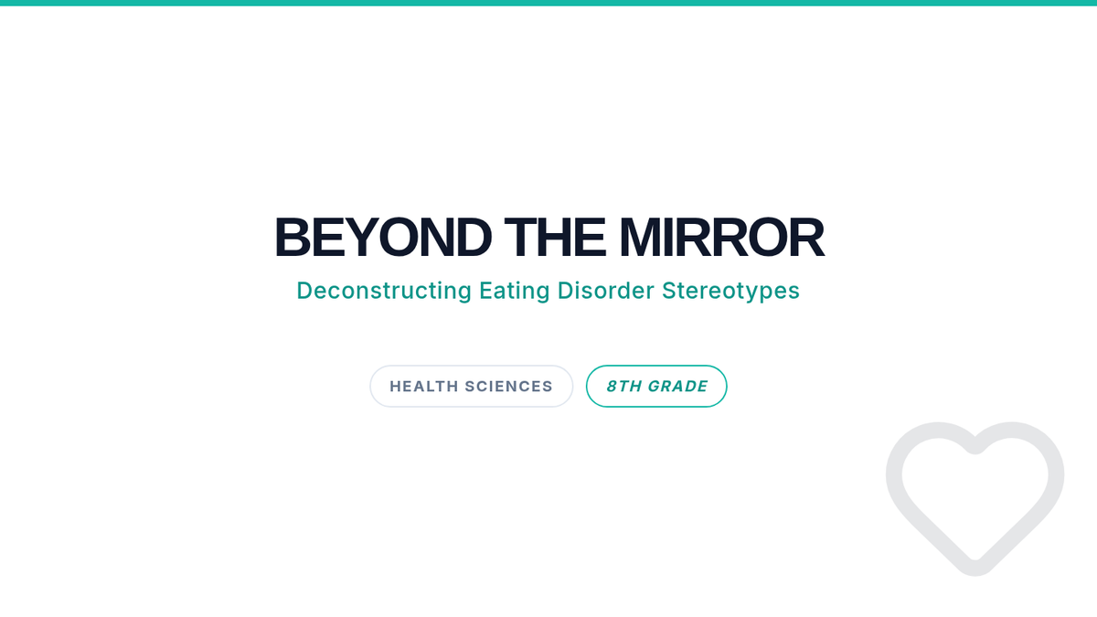 This lesson challenges common stereotypes about eating disorders, specifically focusing on the misconception that physical appearance (weight) is the primary indicator of a disorder. Students will analyze video content, participate in discussions about diagnostic stigma, and create PSA posters to promote awareness of the 'invisible' nature of mental health conditions.