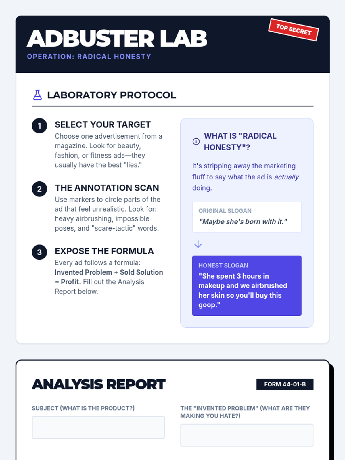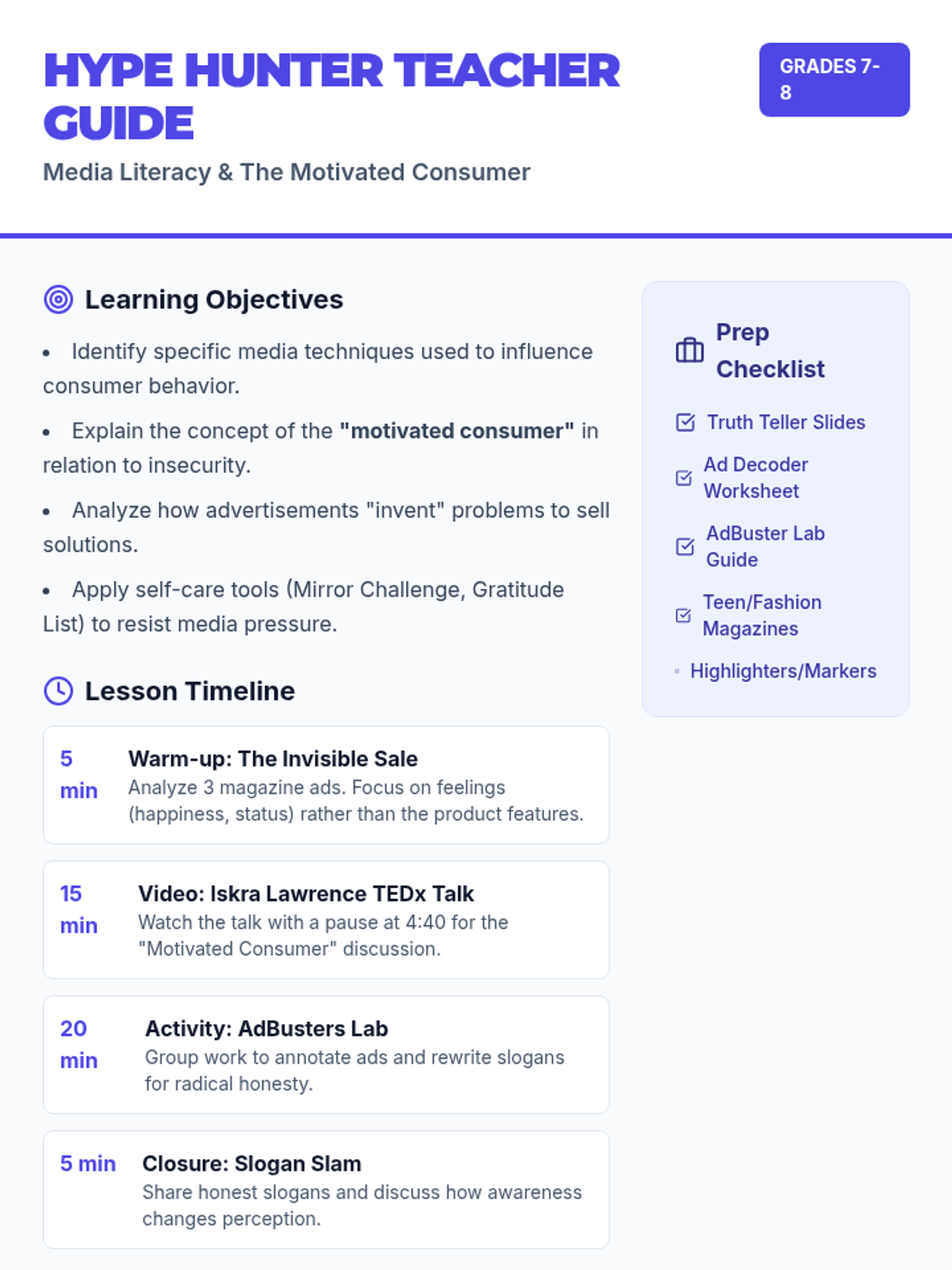 Students explore media literacy by deconstructing advertising techniques, understanding the 'motivated consumer' concept, and learning self-care strategies to combat body image pressures.