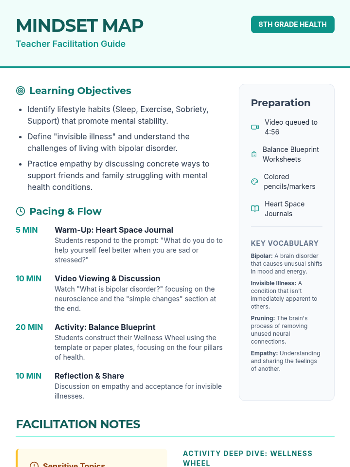 Students explore the connection between daily habits and mental health through the lens of bipolar disorder, focusing on the "Wellness Wheel" as a tool for stability and practicing empathy for those with invisible illnesses.