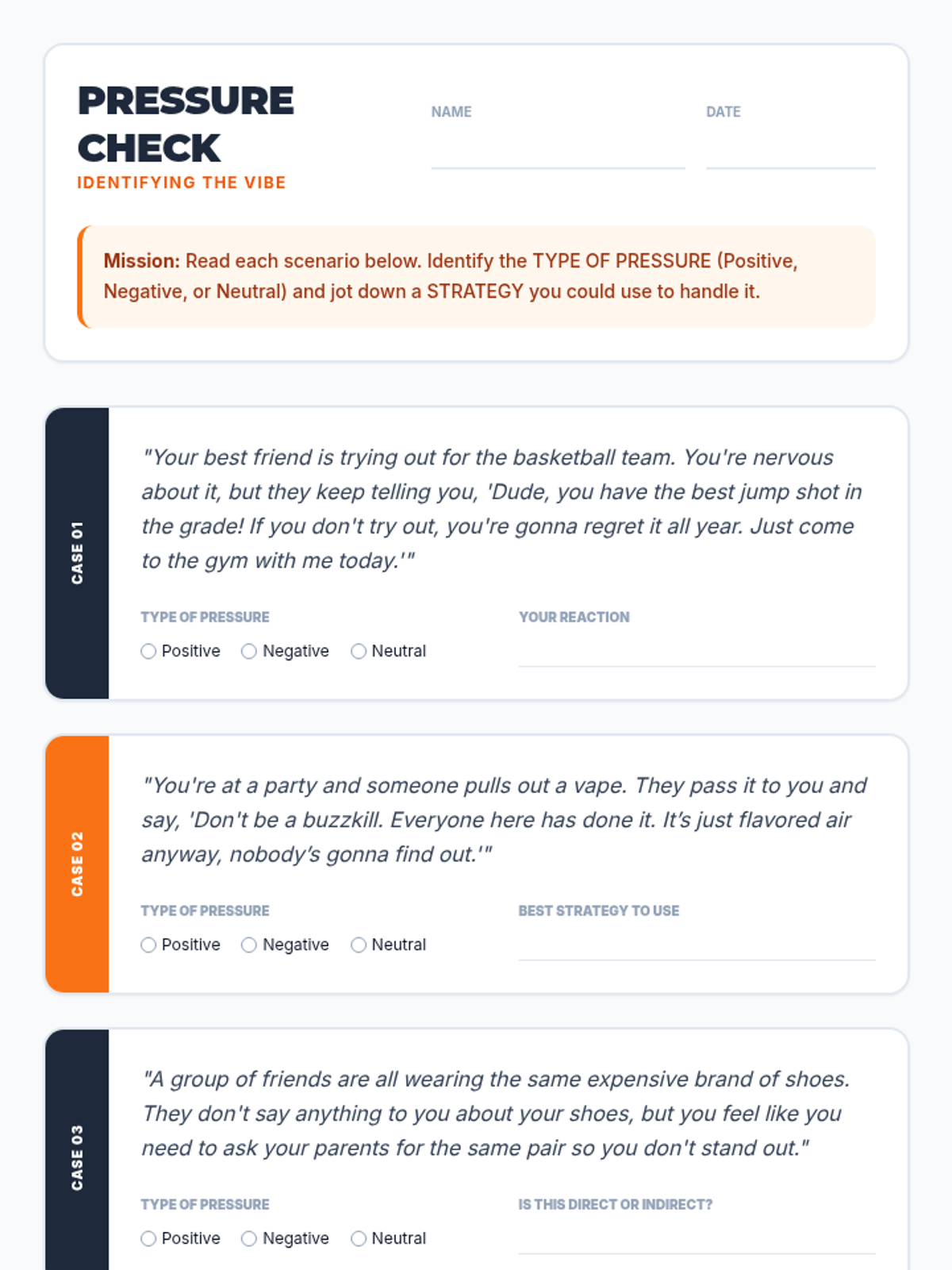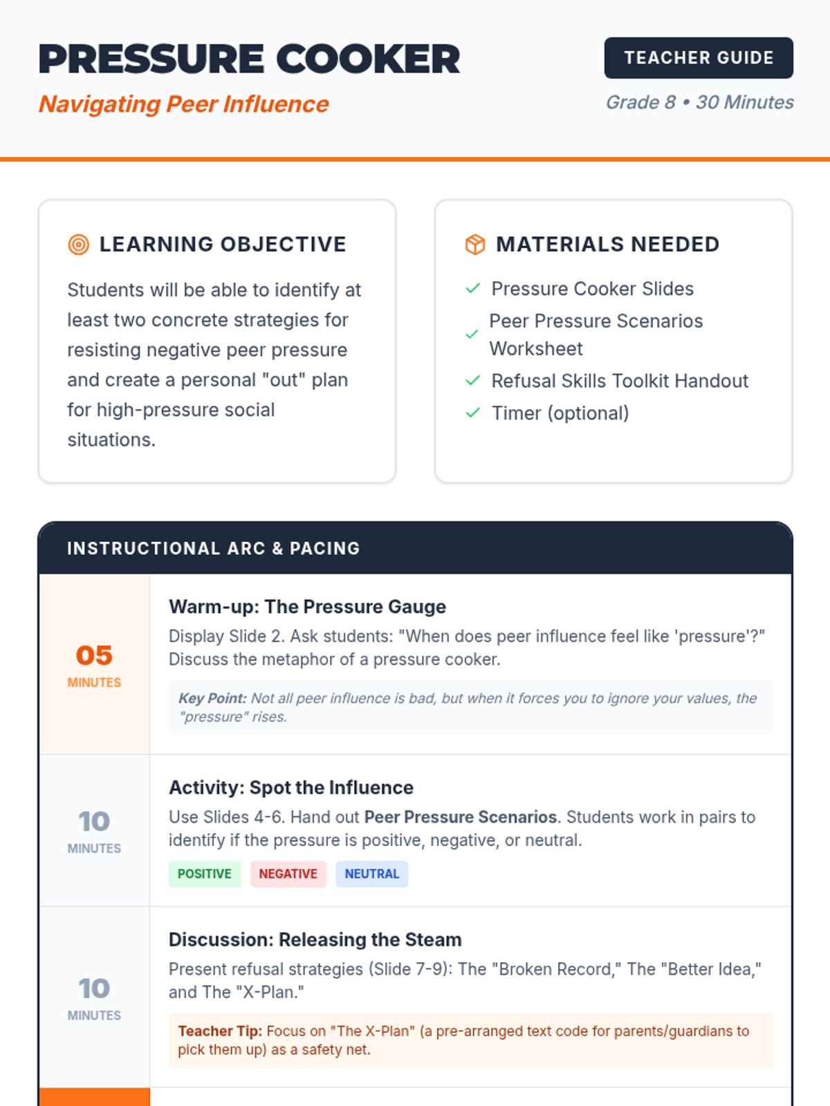 A 30-minute lesson for 8th graders on identifying and resisting negative peer pressure through refusal strategies and personal 'out' plans.
