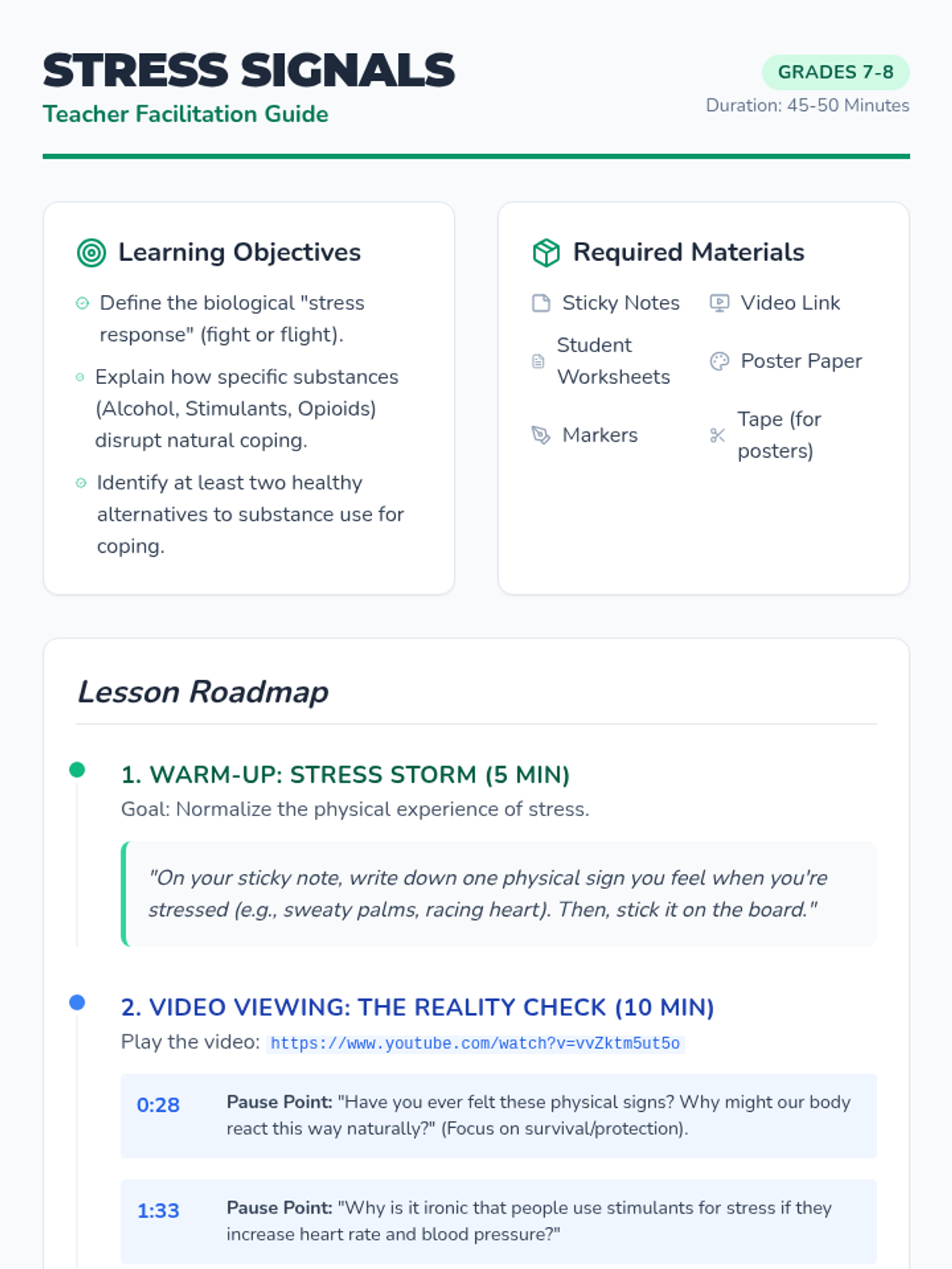 This lesson explores the biological reality of how drugs and alcohol interfere with the body's natural stress response, providing students with scientific evidence to debunk common myths and offering healthy, long-term coping strategies.