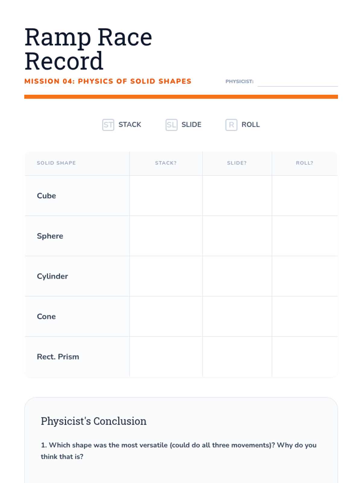 Students analyze the movement properties of solids—stacking, sliding, and rolling—based on their flat or curved surfaces.
