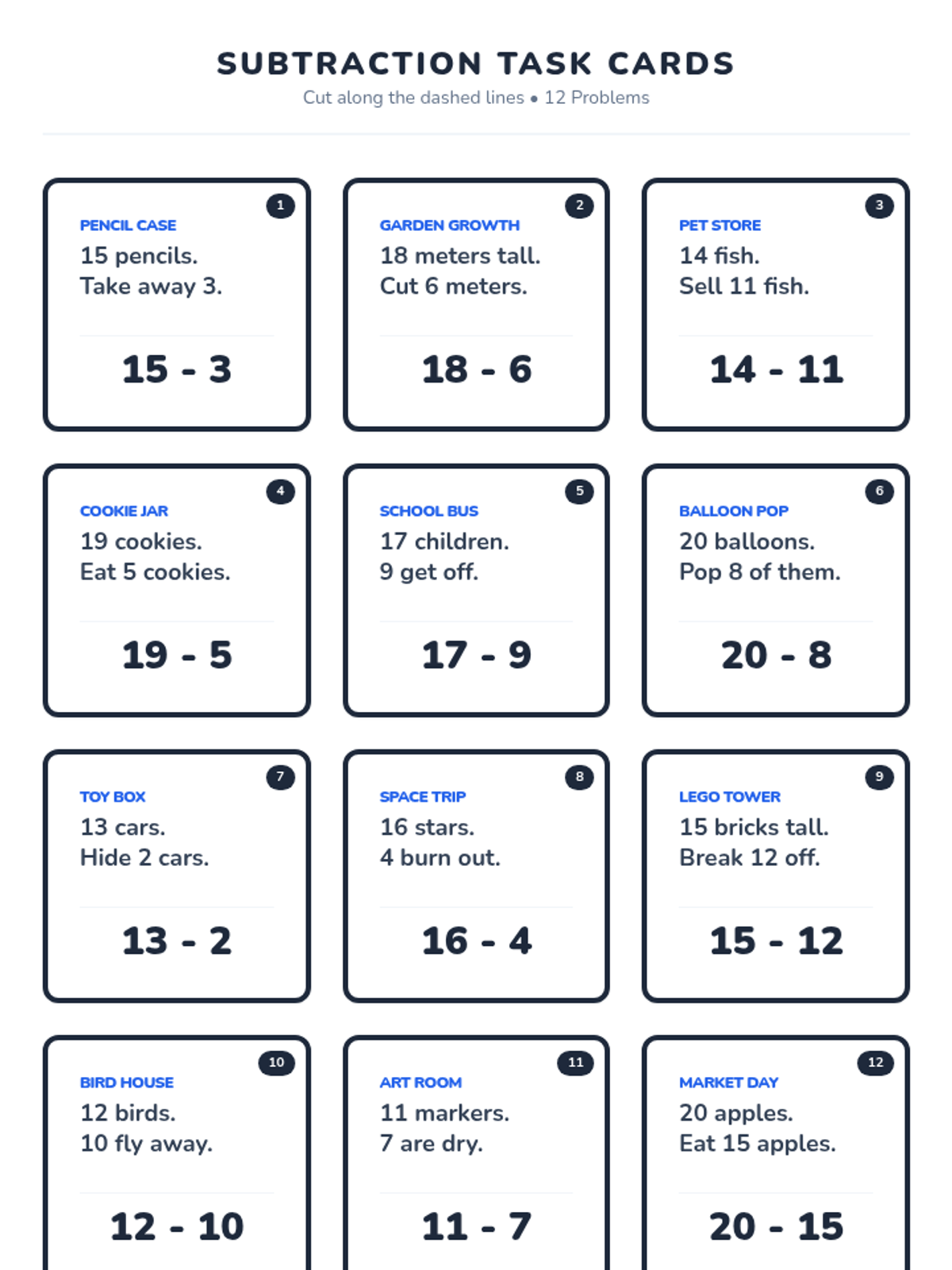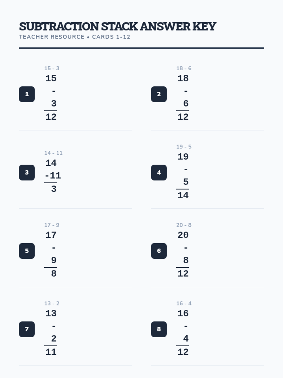 A comprehensive math review lesson designed to reinforce key elementary math skills including logical ordering, 2-digit subtraction, geometric attributes, and equal parts/fractions. This lesson uses a repeated "at-bat" structure to build mastery through multiple variations of the same problem format.
