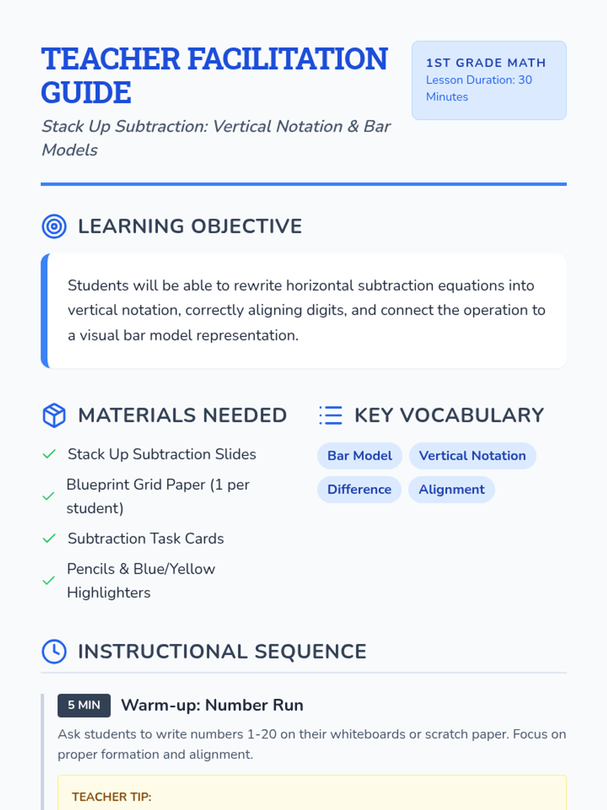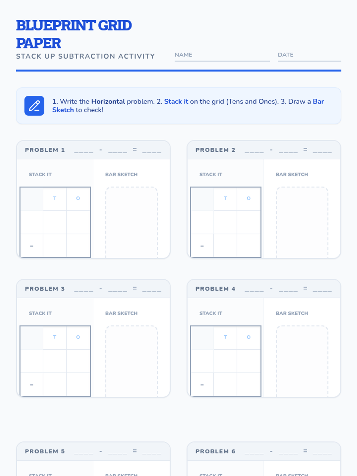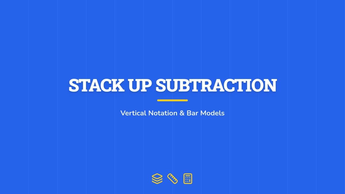 Students learn to connect horizontal subtraction equations to vertical notation and bar models through a measurement-themed video and a hands-on 'Stack it Up' activity using grid paper.