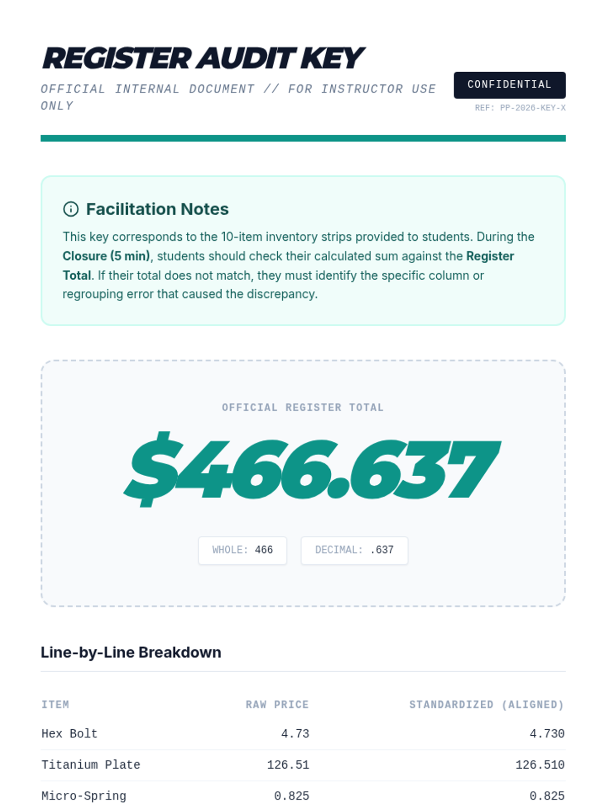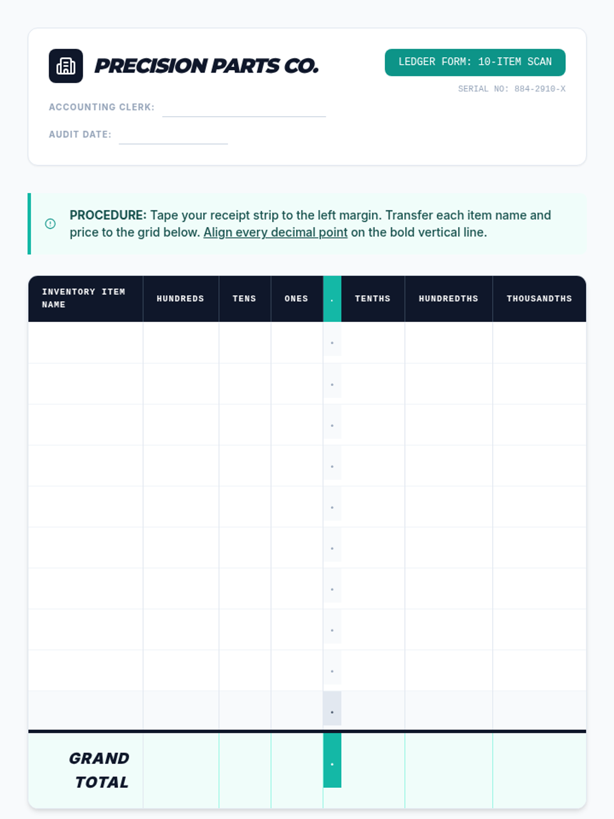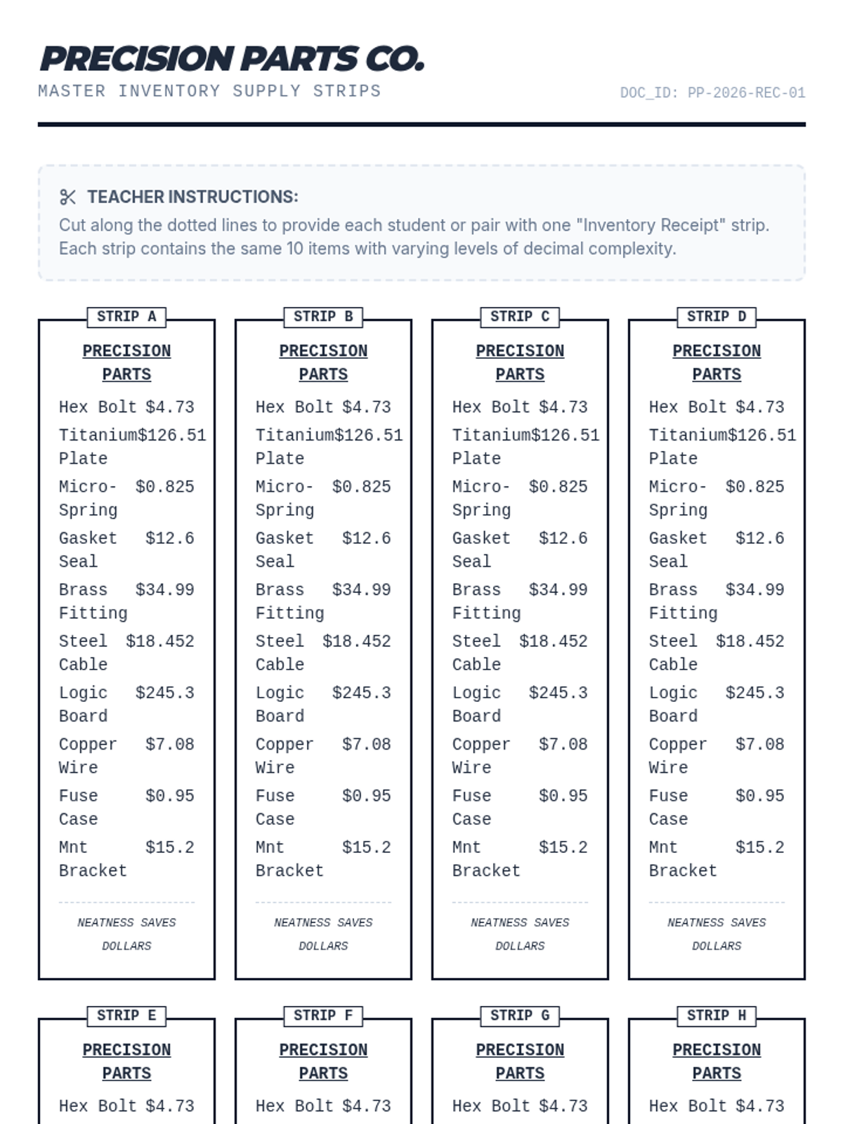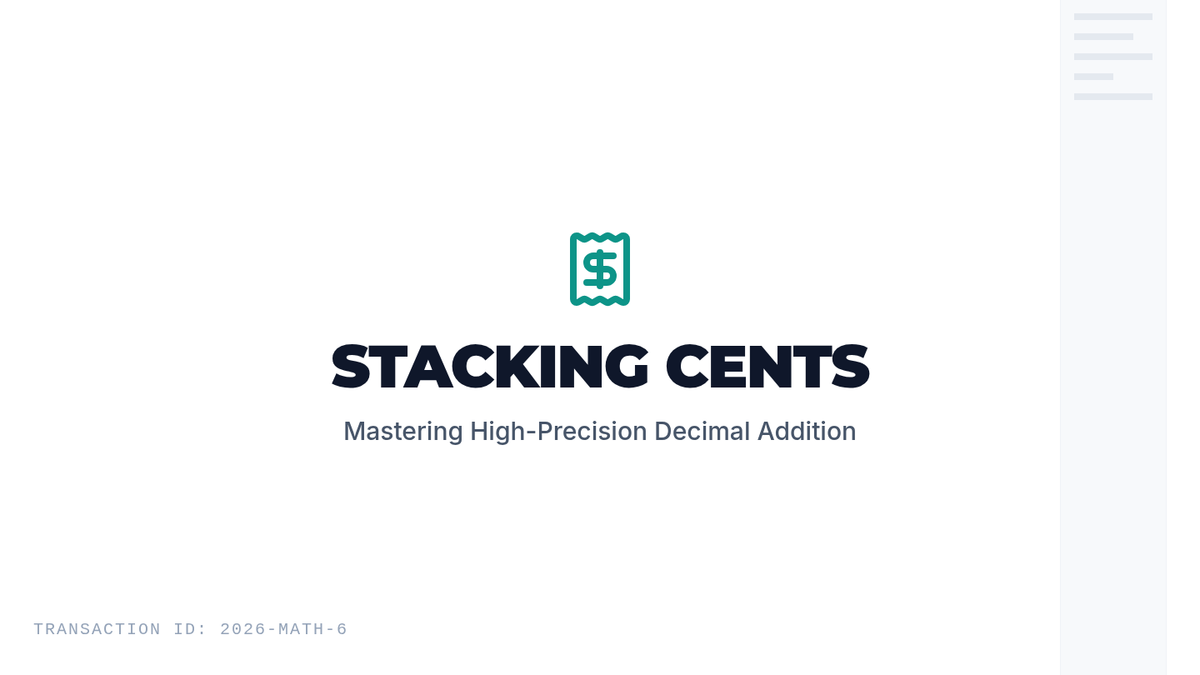 A high-precision math lesson where students master decimal addition by simulating a 'Long Receipt' from a specialized retail store, focusing on alignment and regrouping with multiple placeholders.