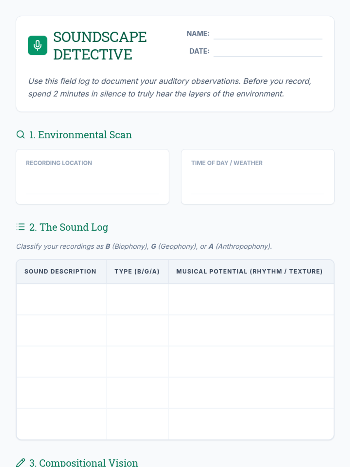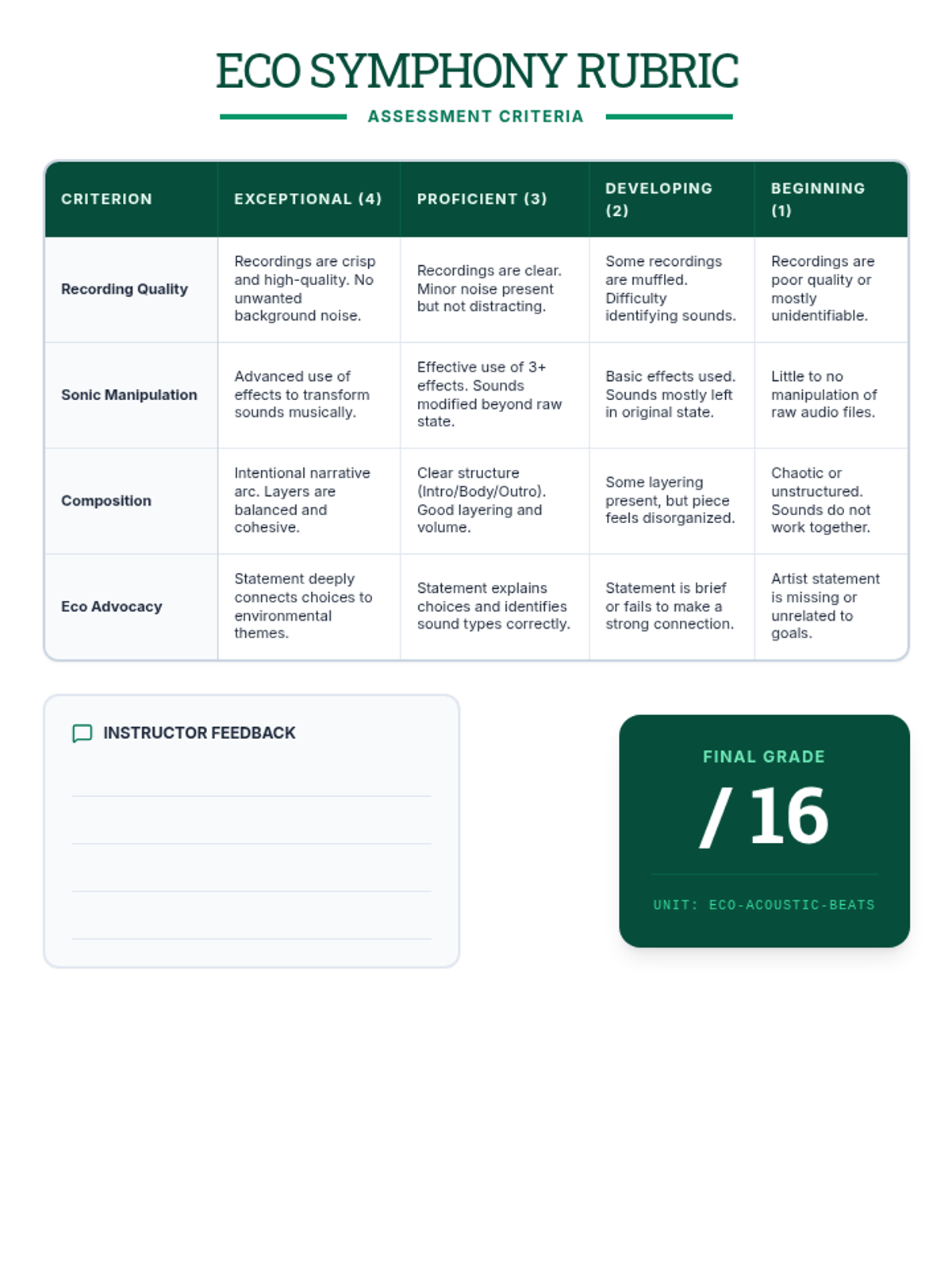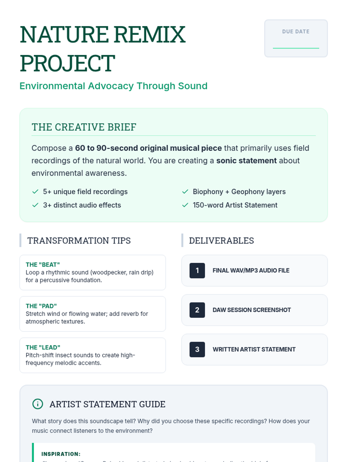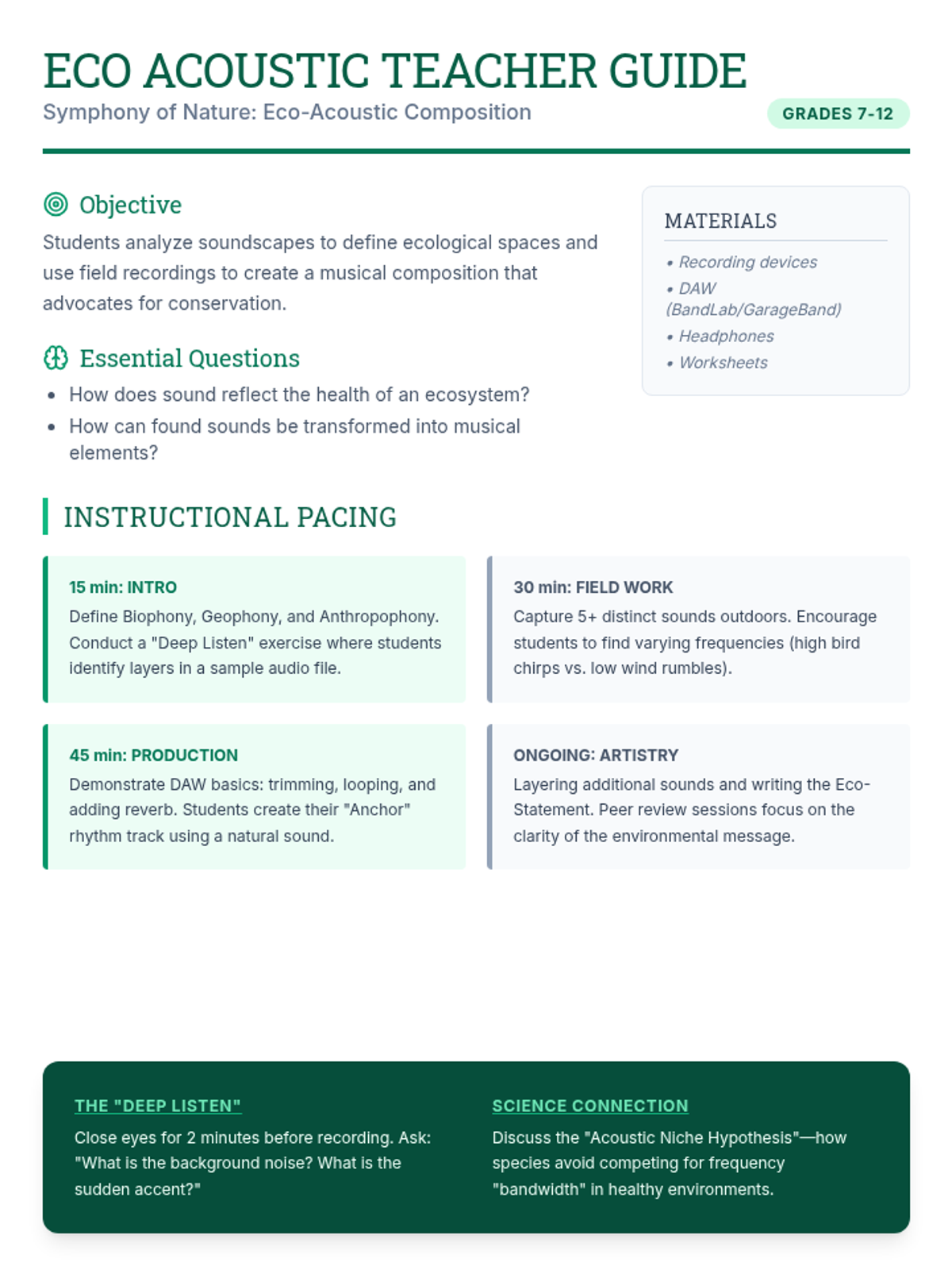 A multi-disciplinary lesson where students blend environmental science and music production. They will analyze natural soundscapes and create original compositions using field recordings to promote ecological awareness.