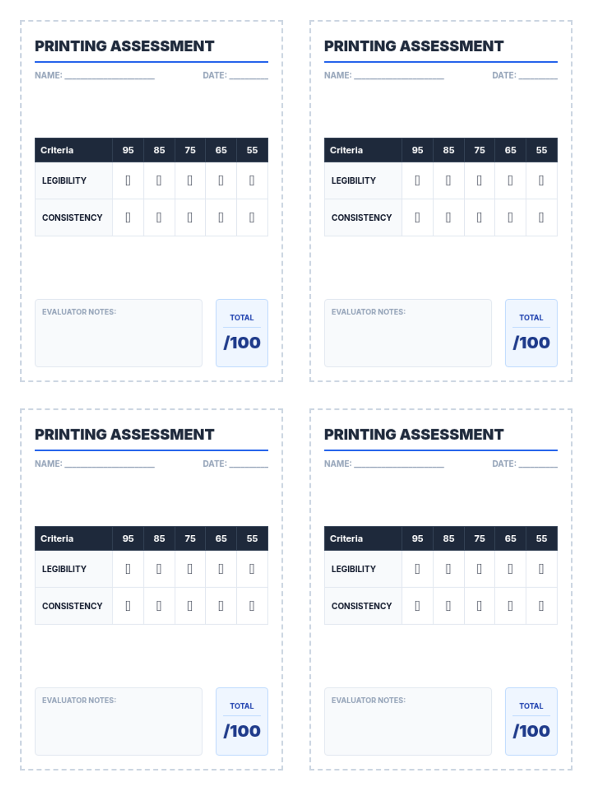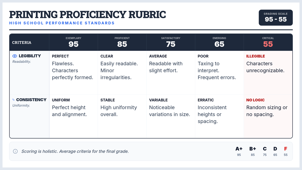 An assessment focused on high school printing standards, centered on a specific printing proficiency rubric.
