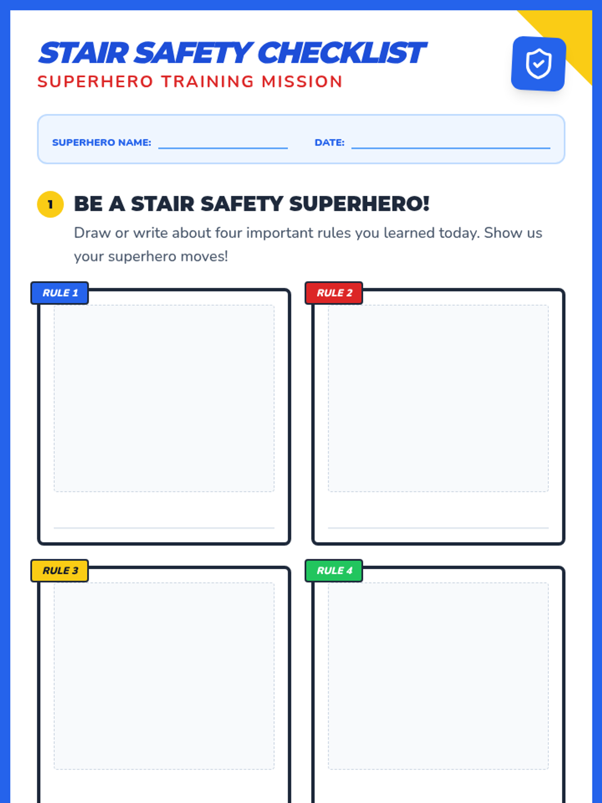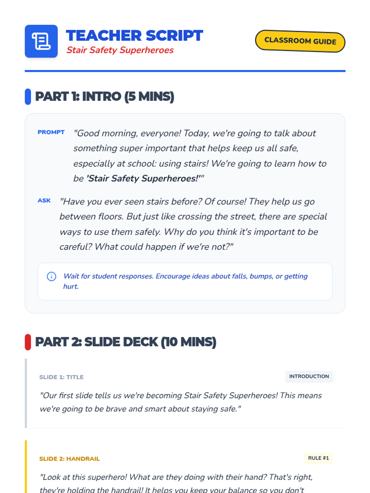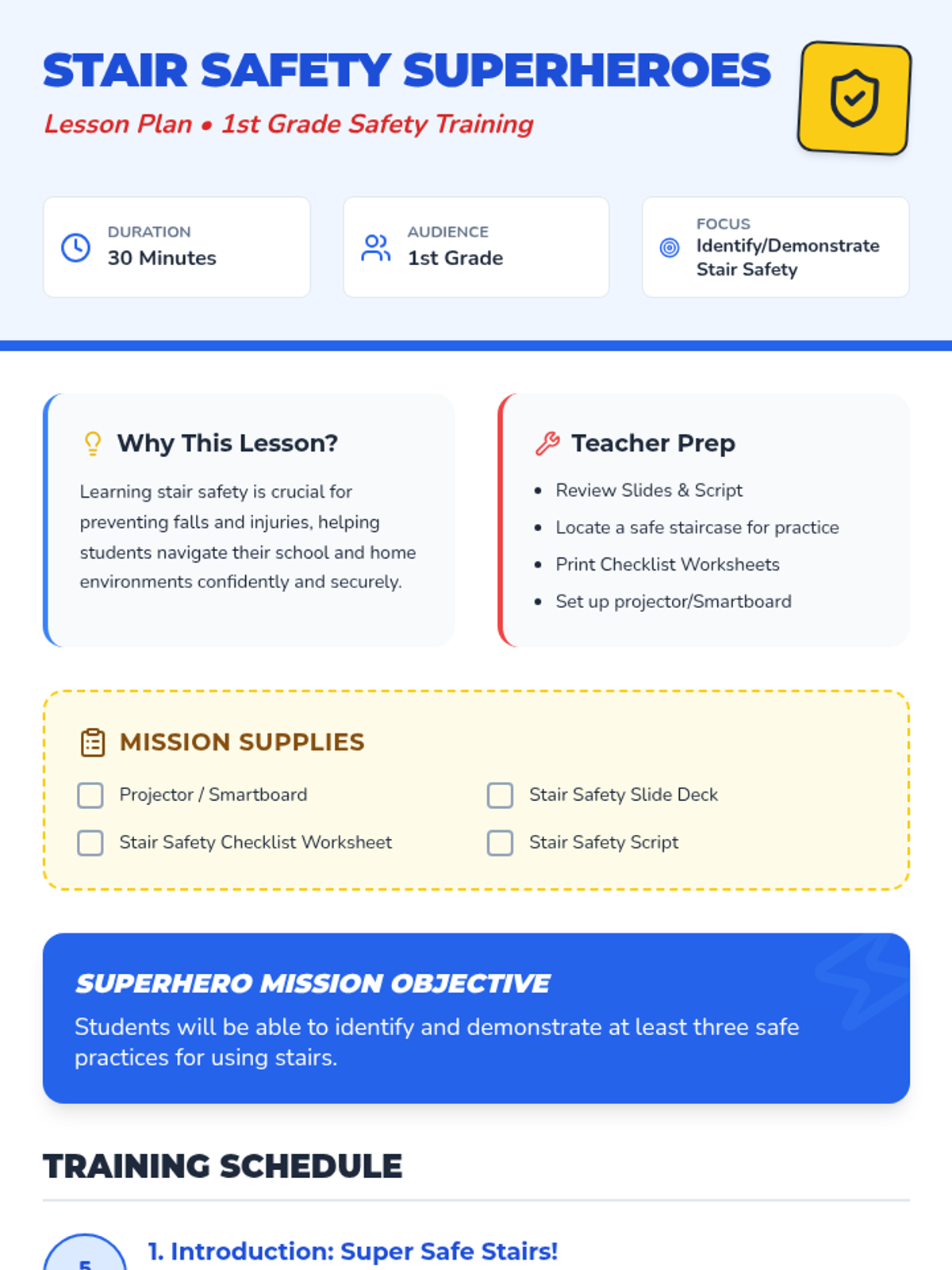 A 30-minute lesson for 1st graders to learn and practice essential stair safety rules through interactive discussion, a slide presentation, and a practical application activity.