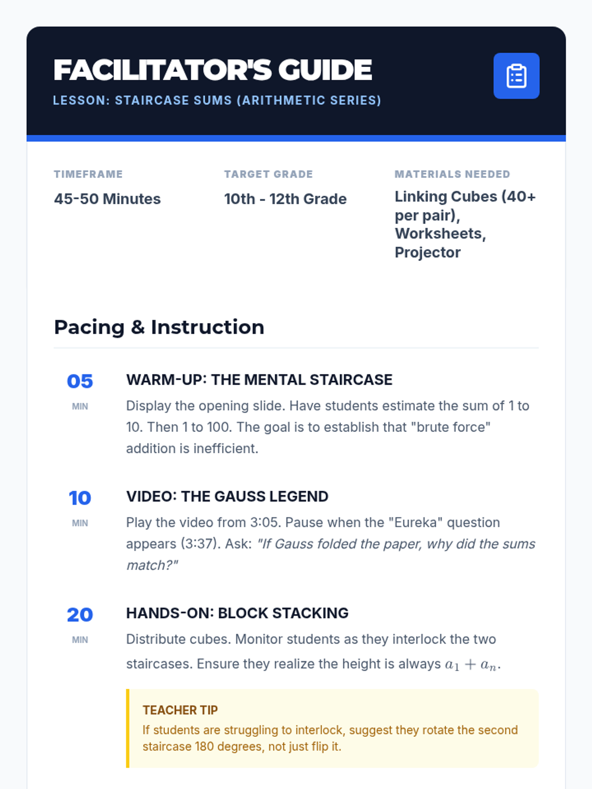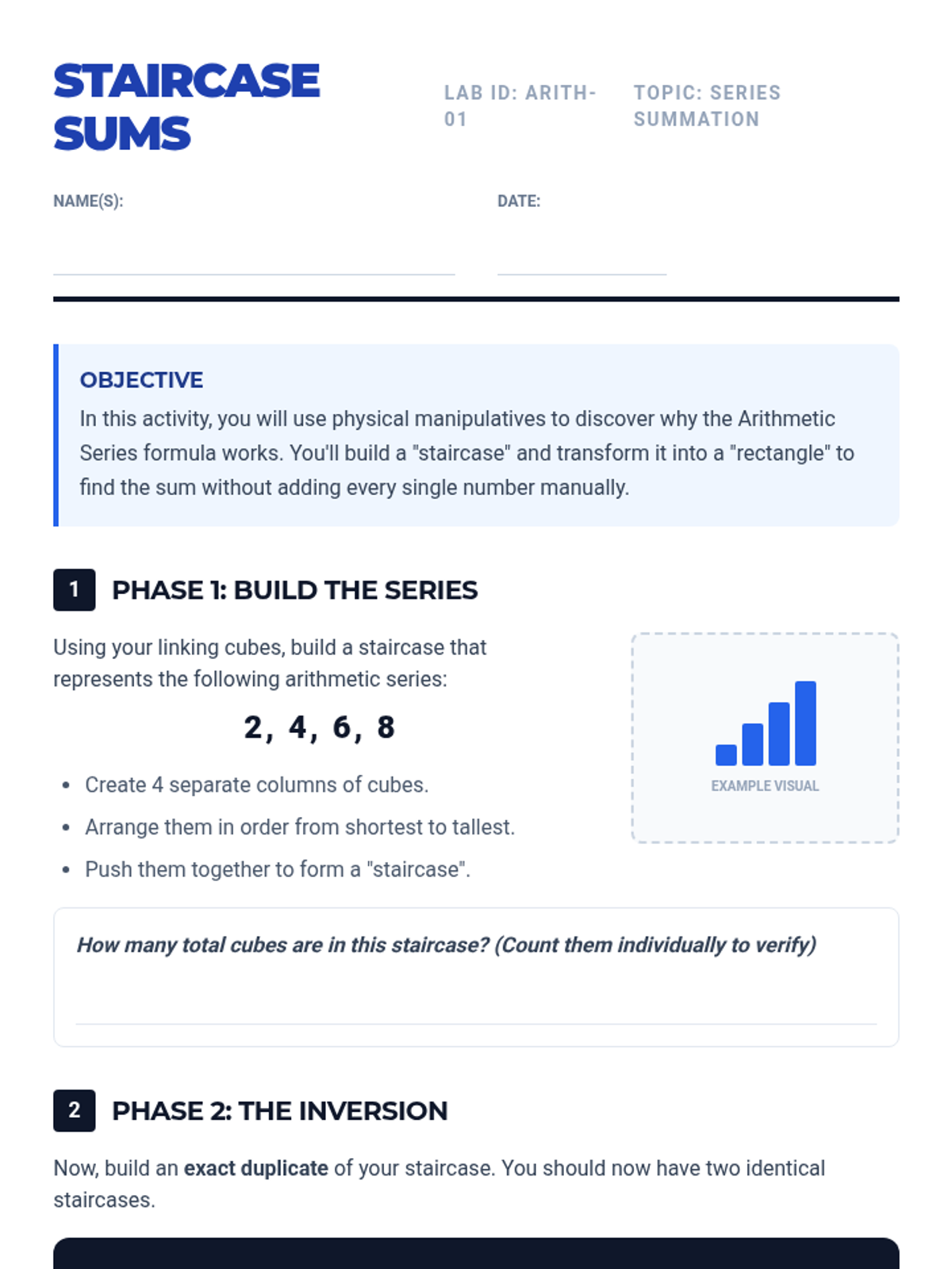 A hands-on exploration of arithmetic series where students use linking cubes to visualize the 'pairing' concept (Gauss's Method) and derive the summation formula.