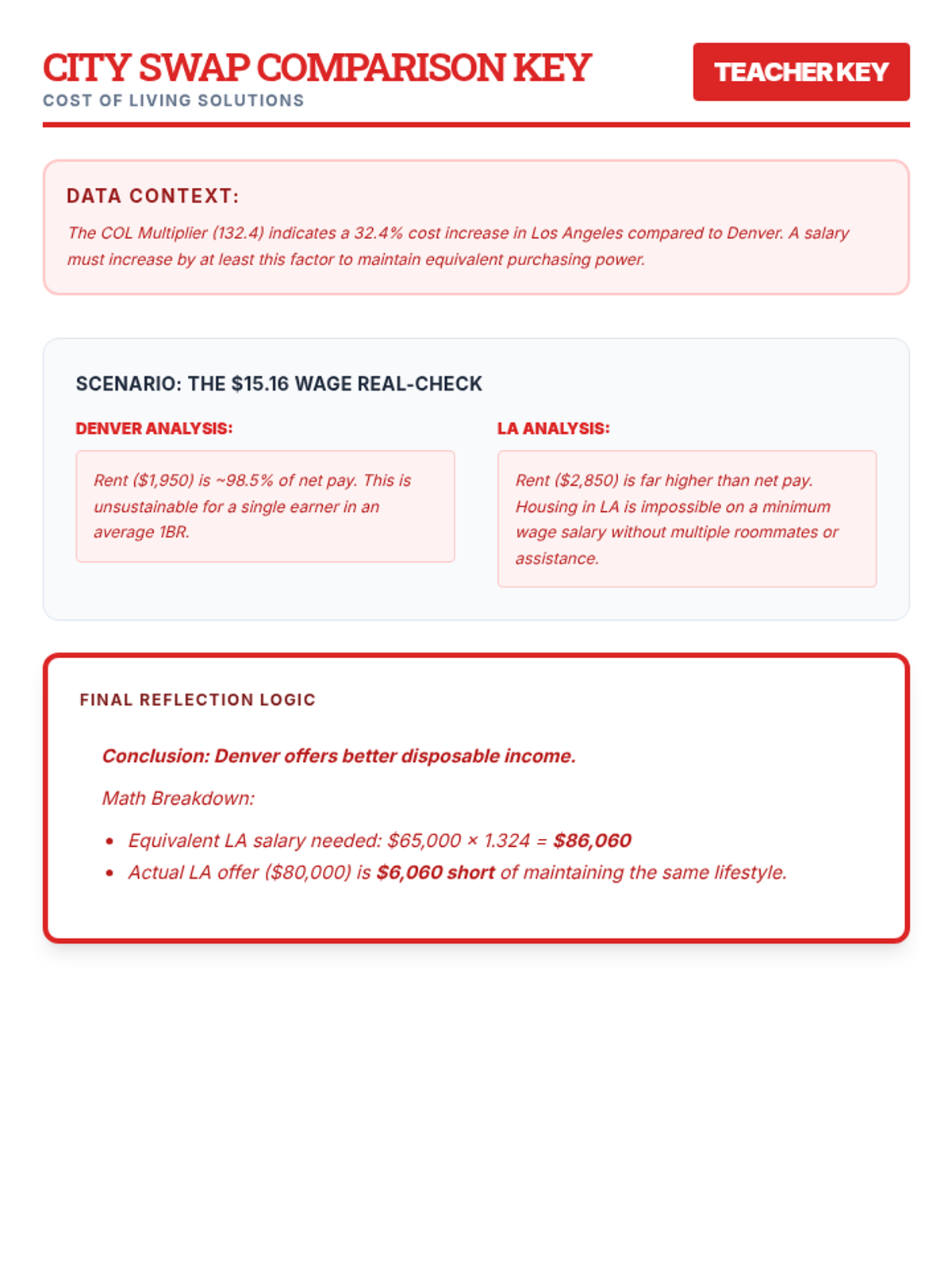 Analyzing how location affects the value of money by comparing cost-of-living data between Denver, Colorado, and Los Angeles, California.