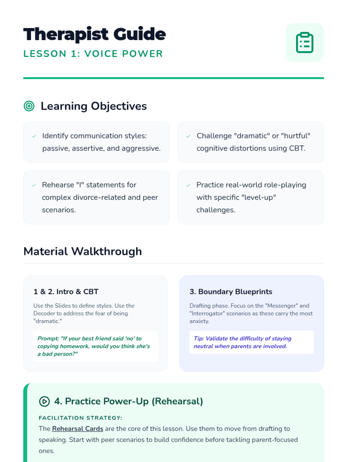 This lesson teaches an anxious 15-year-old girl how to differentiate between communication styles, challenge her fears of being 'dramatic' or 'hurting others', and develop practical scripts for handling her parents, friends, and teachers using CBT principles.