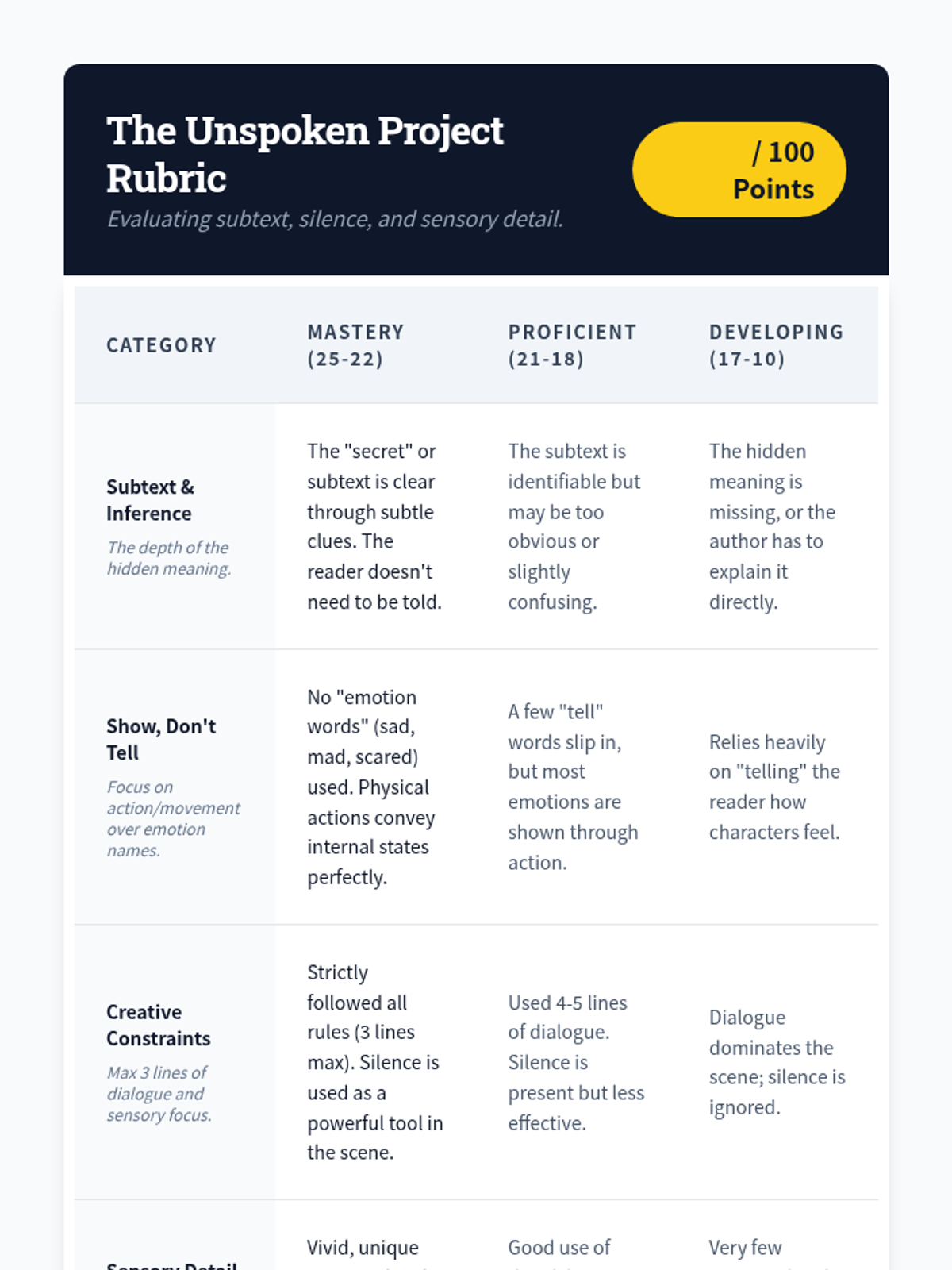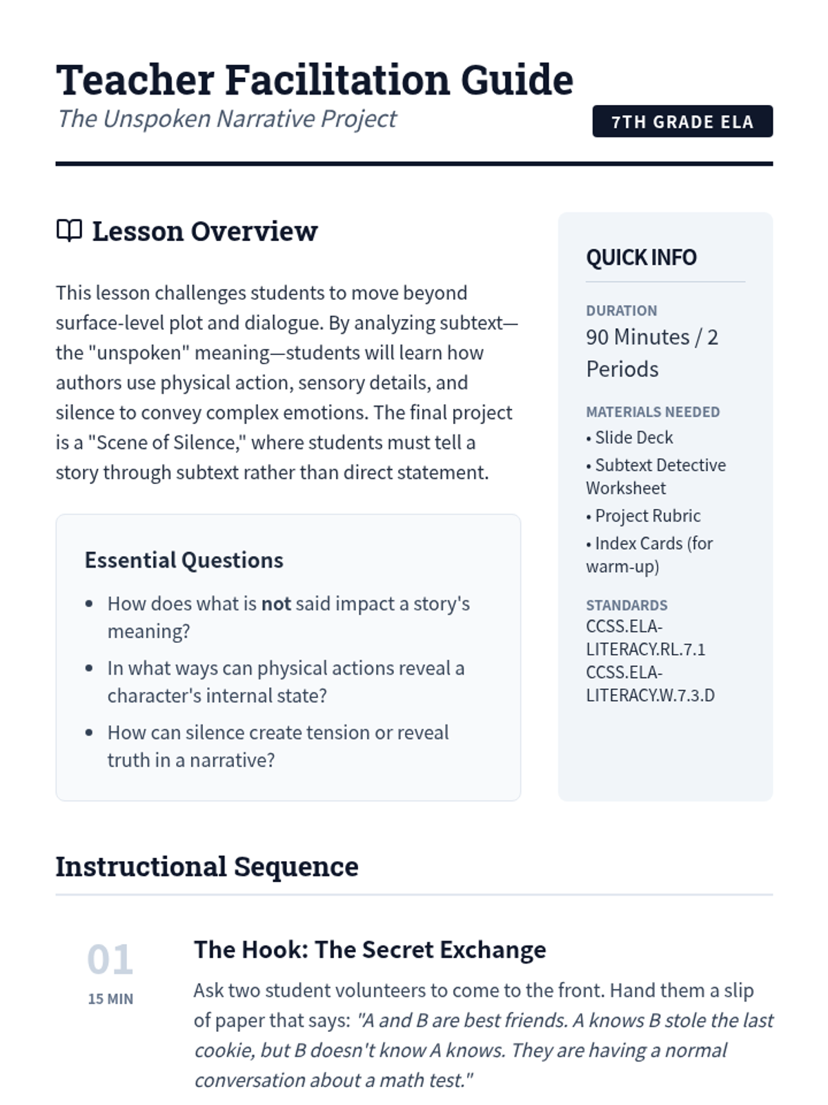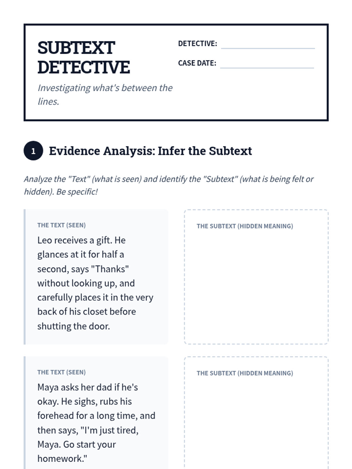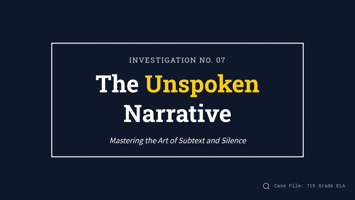 A comprehensive lesson for 7th graders on subtext and the 'show, don't tell' technique. Students learn to analyze what is left unsaid in narratives and apply these techniques to their own creative writing project.