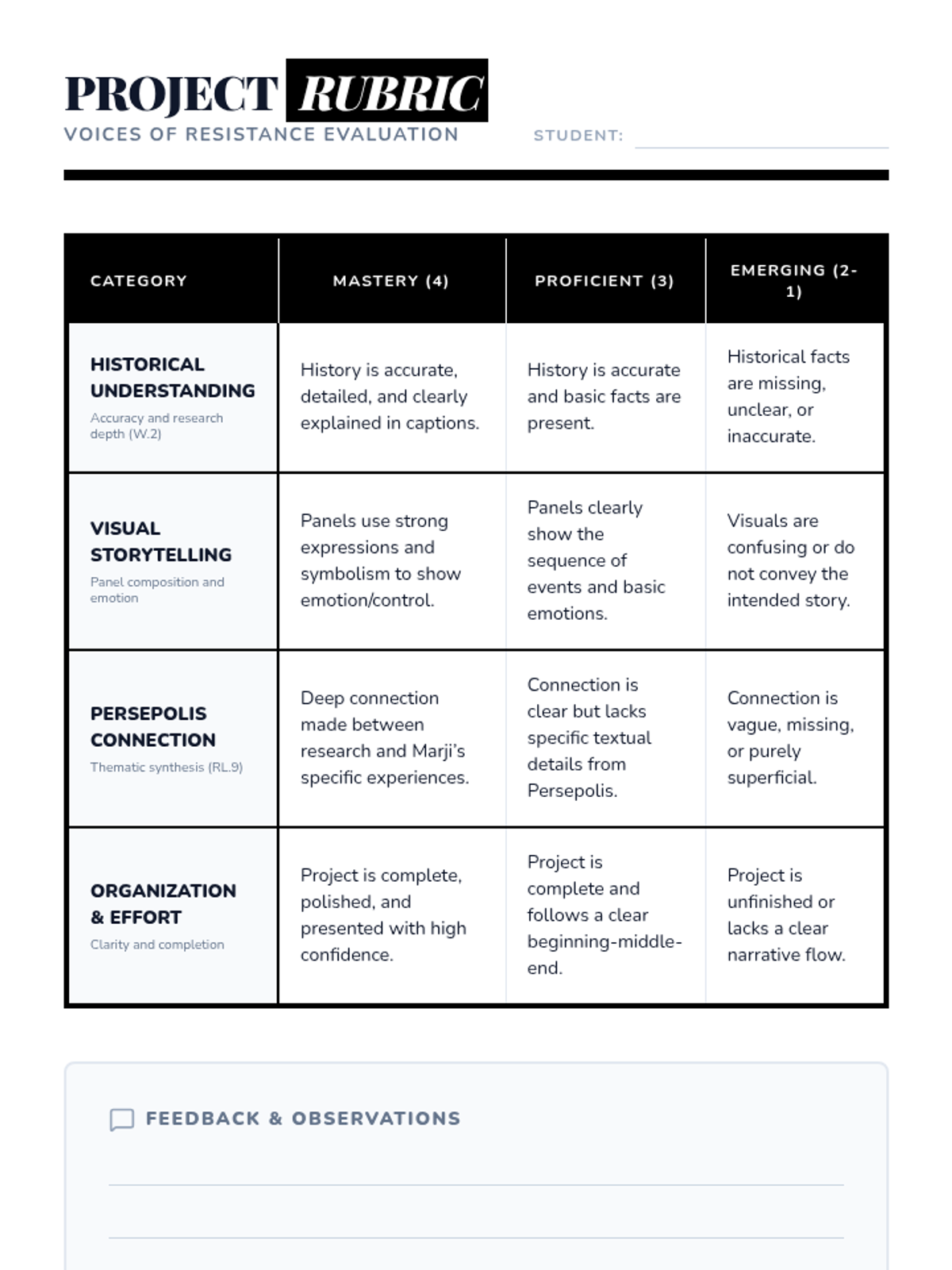Students present their graphic stories and historical research to the class, explaining the themes of oppression and their connections to Persepolis.
