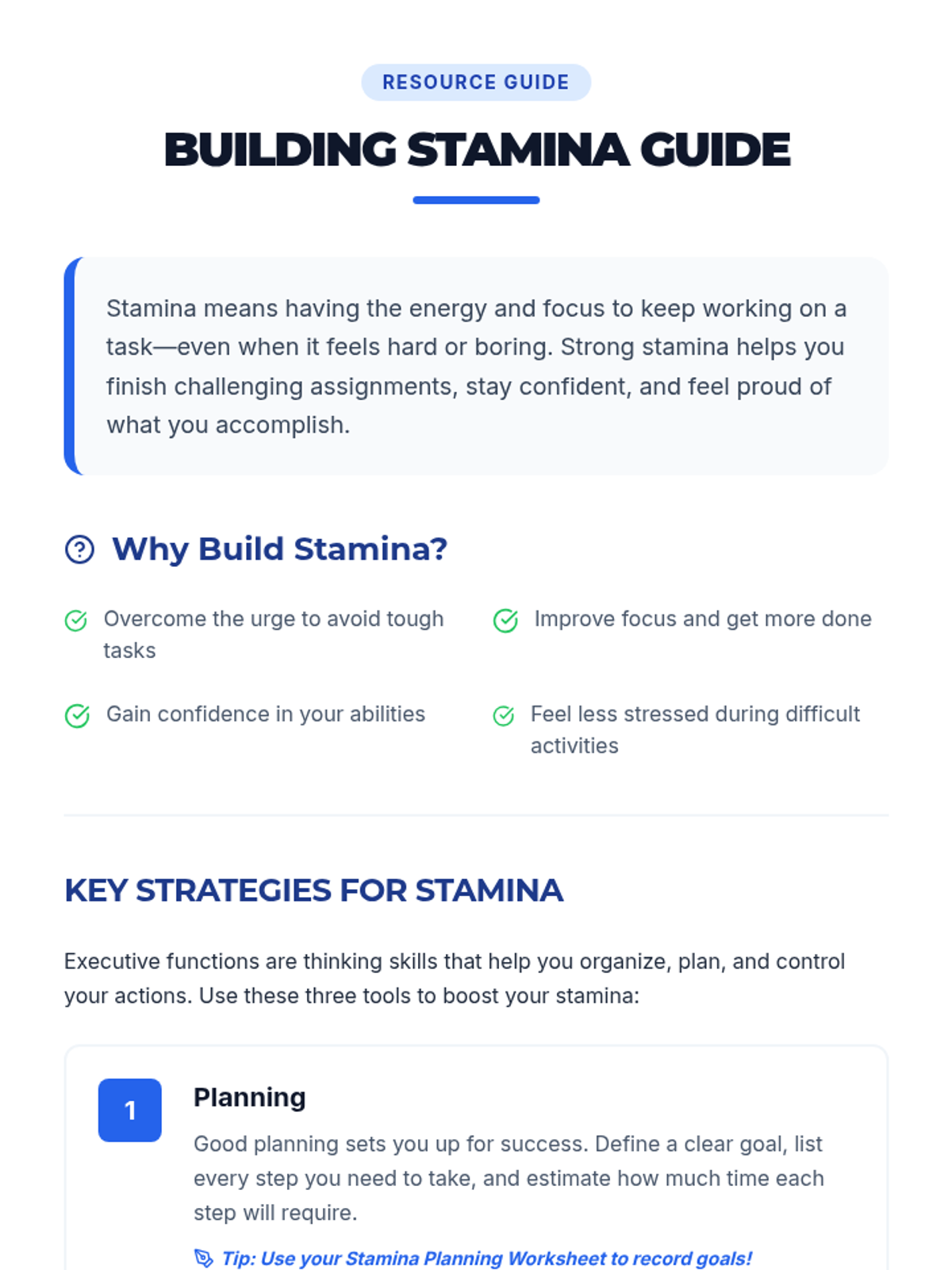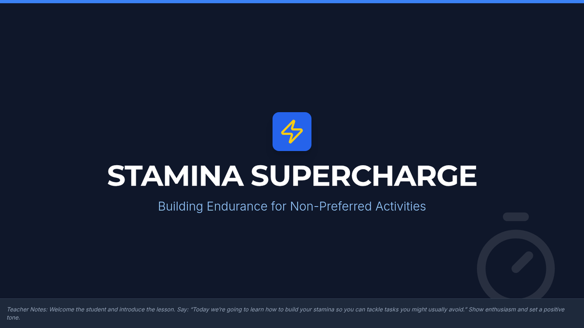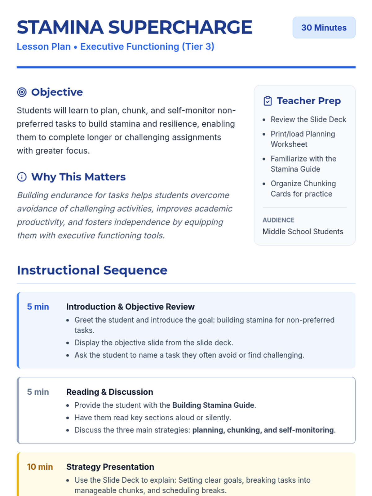 A 30-minute one-on-one Tier 3 lesson for middle schoolers focusing on executive functioning strategies to build stamina and tackle non-preferred tasks through planning, chunking, and self-monitoring.