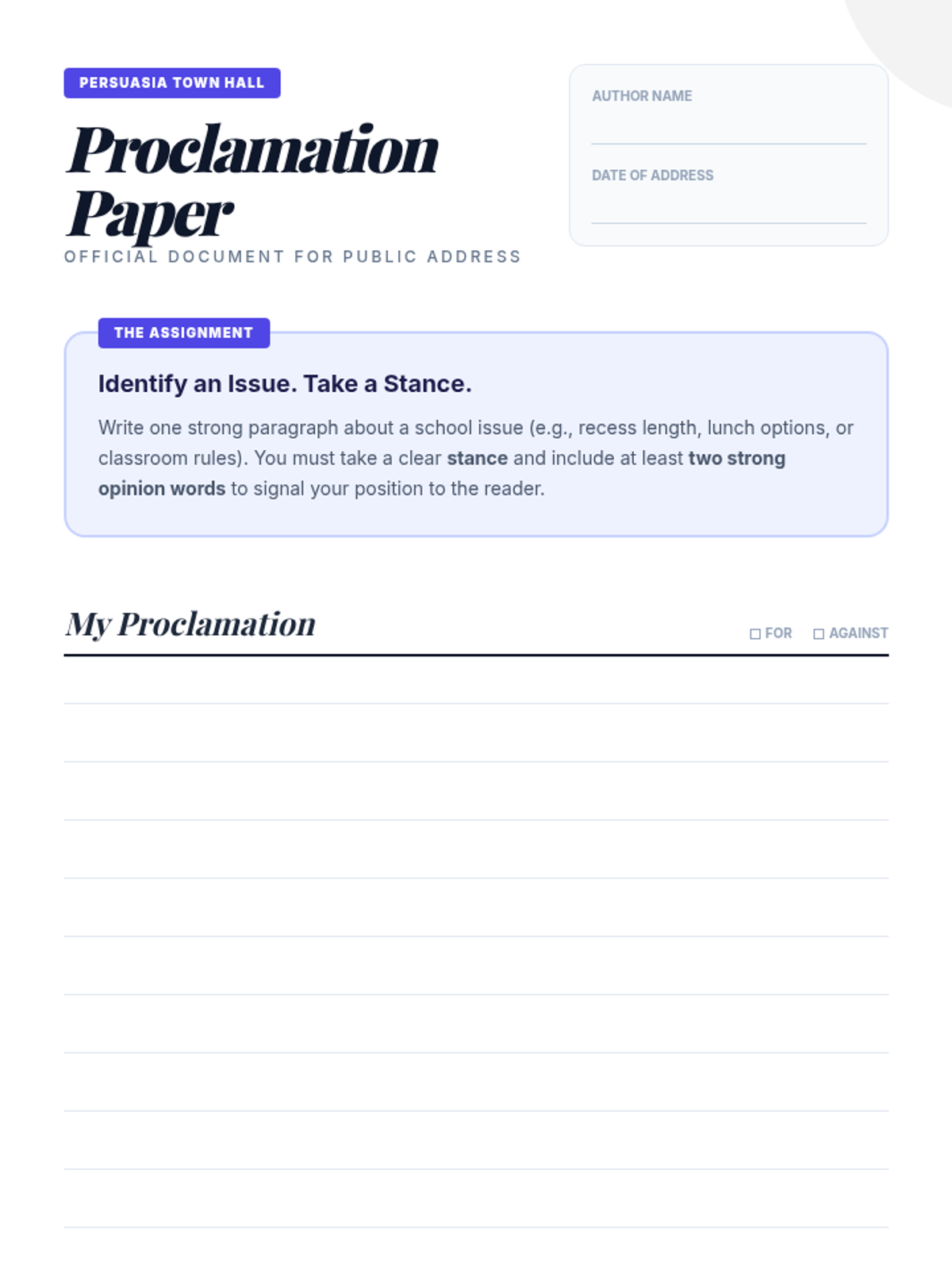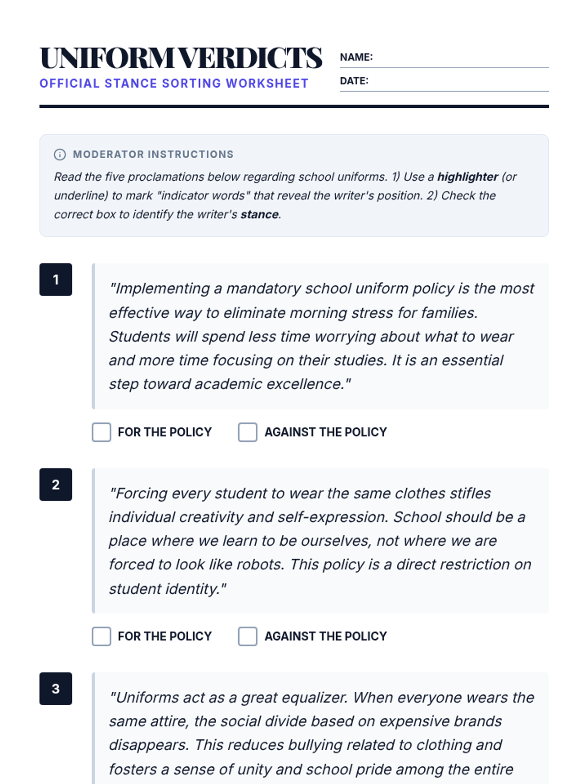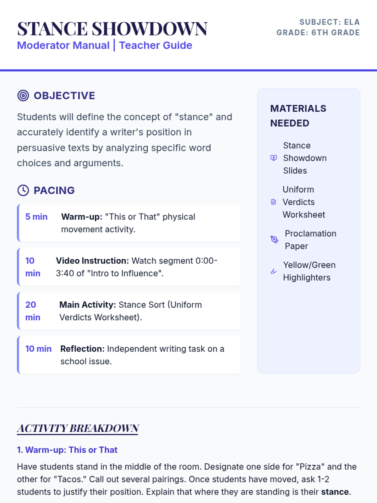 A middle school introduction to identifying stance in persuasive writing, featuring a town hall debate theme and a 'Stance Sort' activity regarding school uniforms.