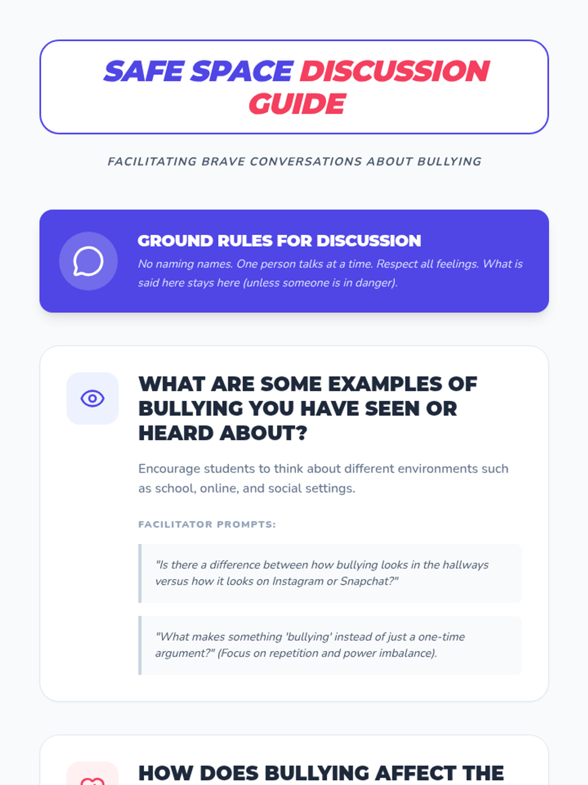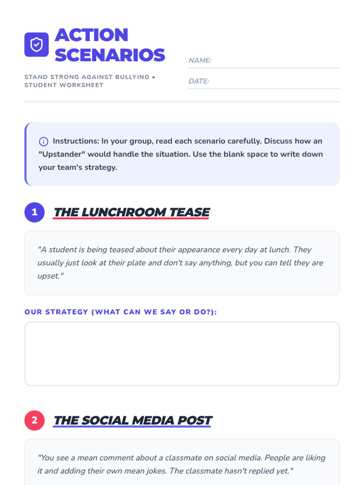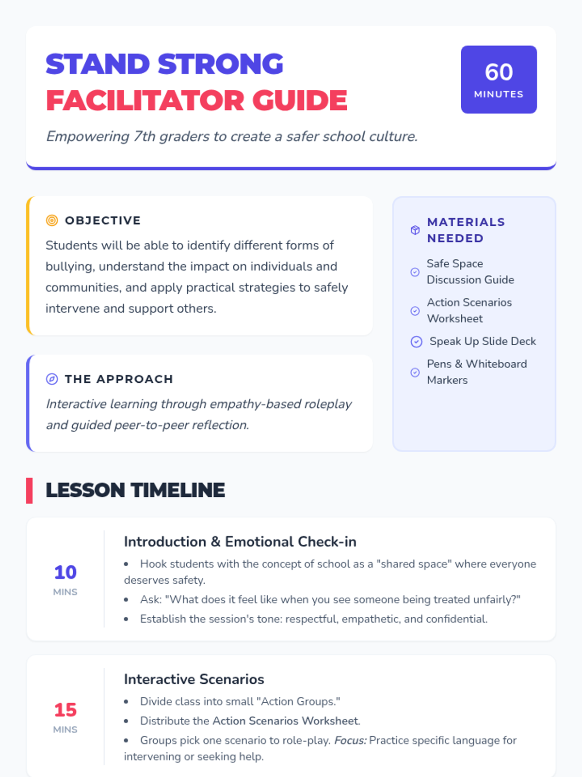 A comprehensive 1-hour lesson for 7th graders to recognize, address, and prevent bullying through scenarios and discussion.