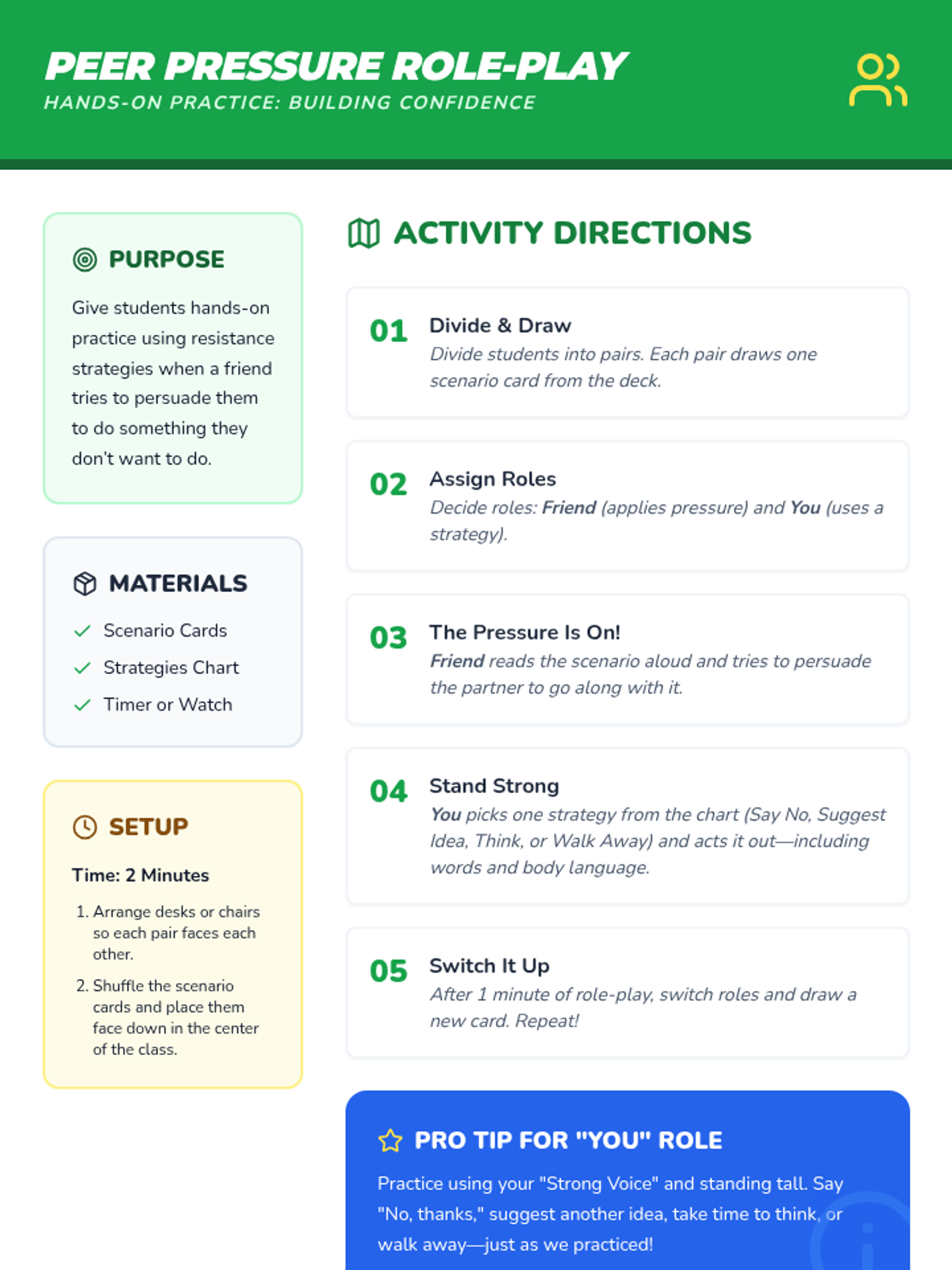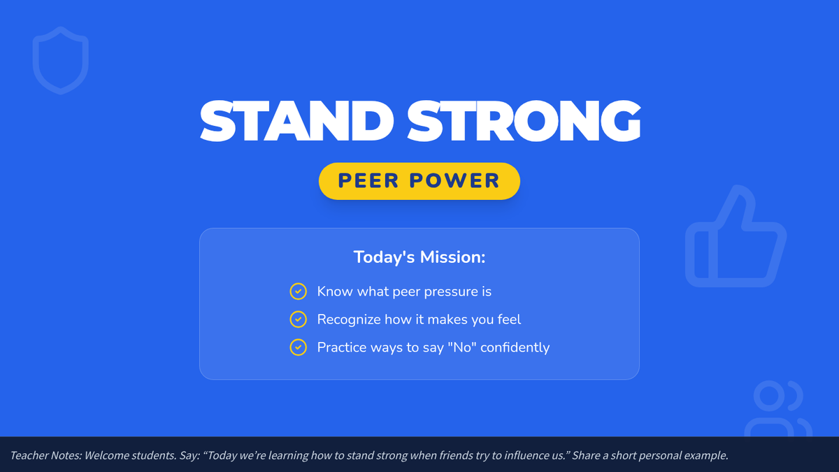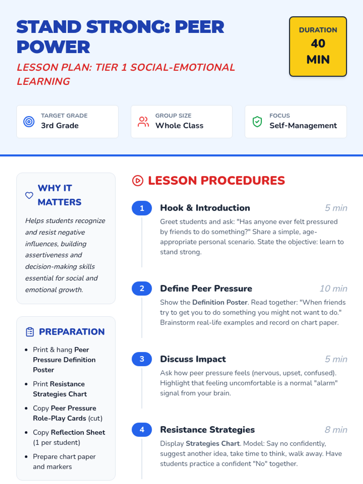 A 40-minute Tier 1 lesson for 3rd graders on identifying and resisting peer pressure. Students will learn what peer pressure is, why it matters, and practice strategies to make confident choices through interactive discussion and role-play.