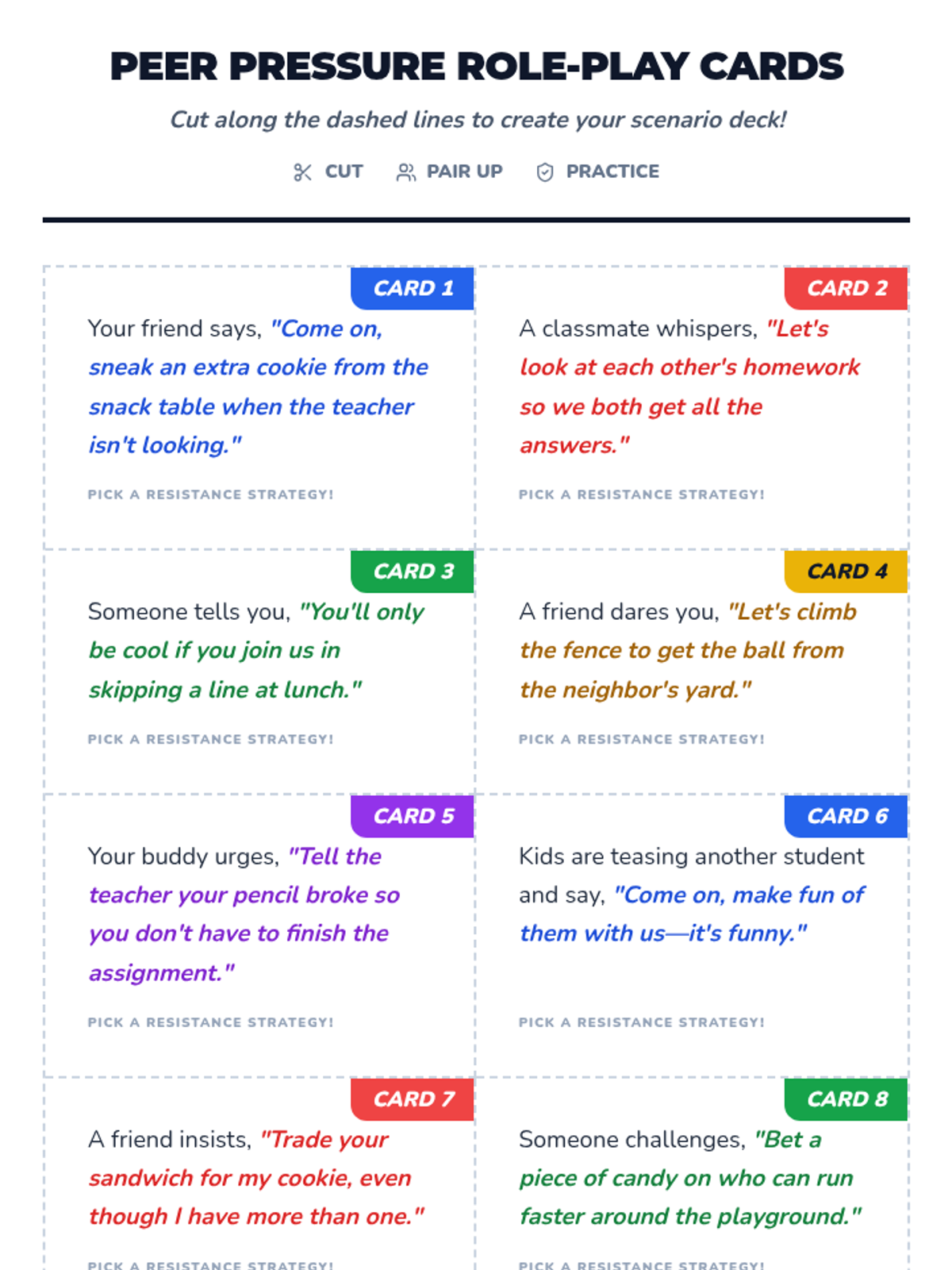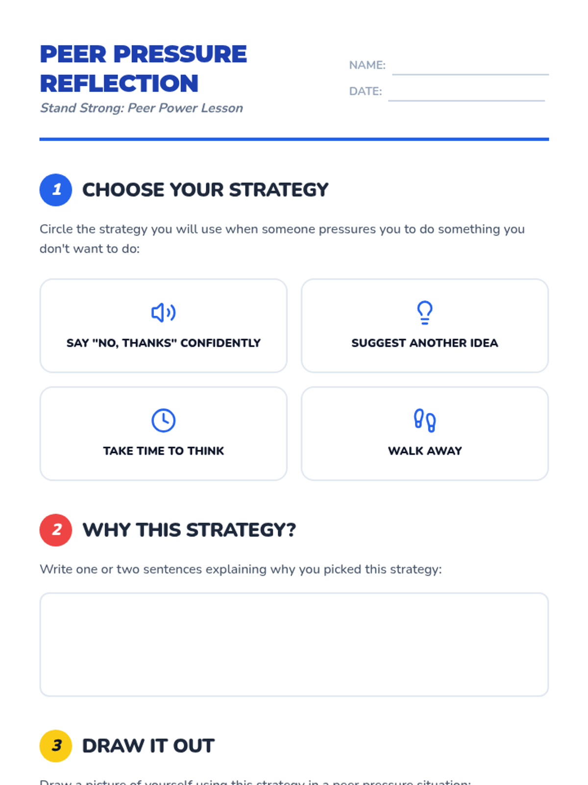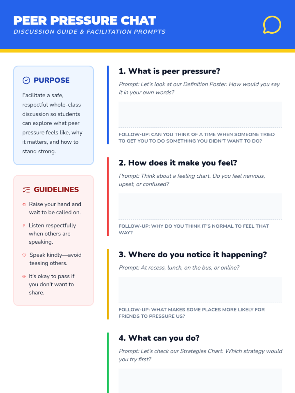 A 40-minute Tier 1 lesson for 3rd graders on identifying and resisting peer pressure. Students will learn what peer pressure is, why it matters, and practice strategies to make confident choices through interactive discussion and role-play.