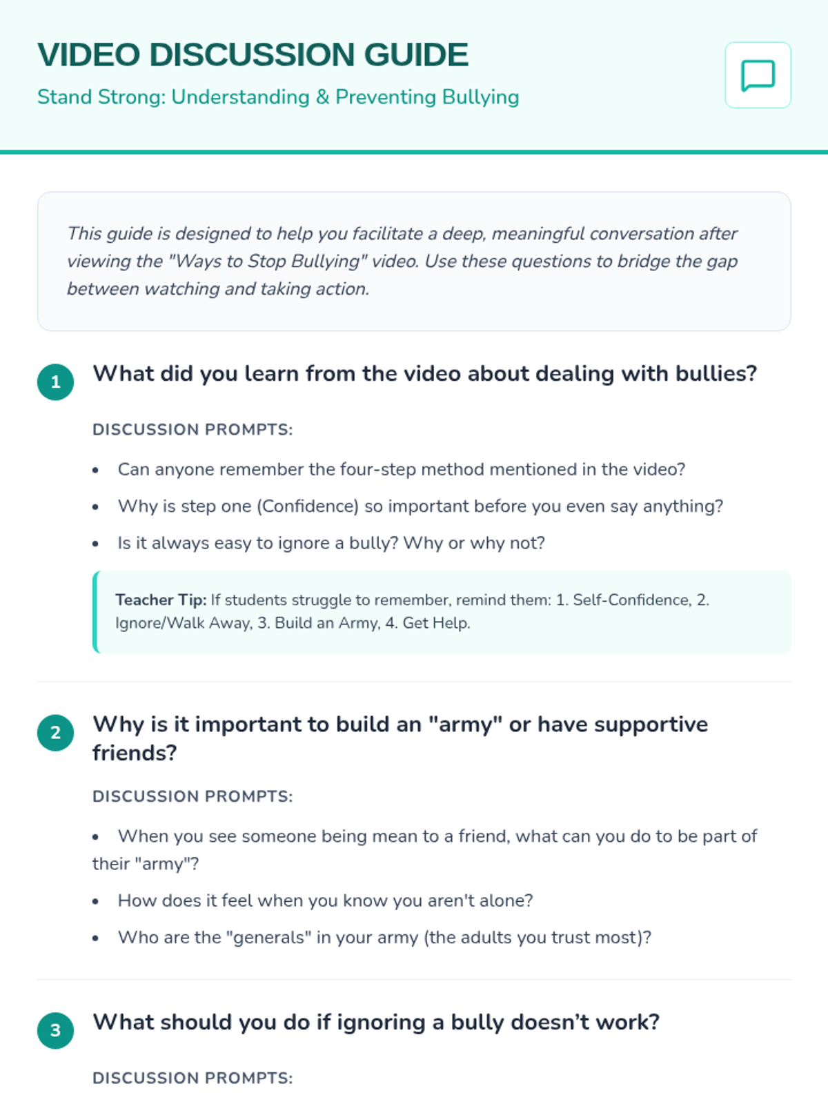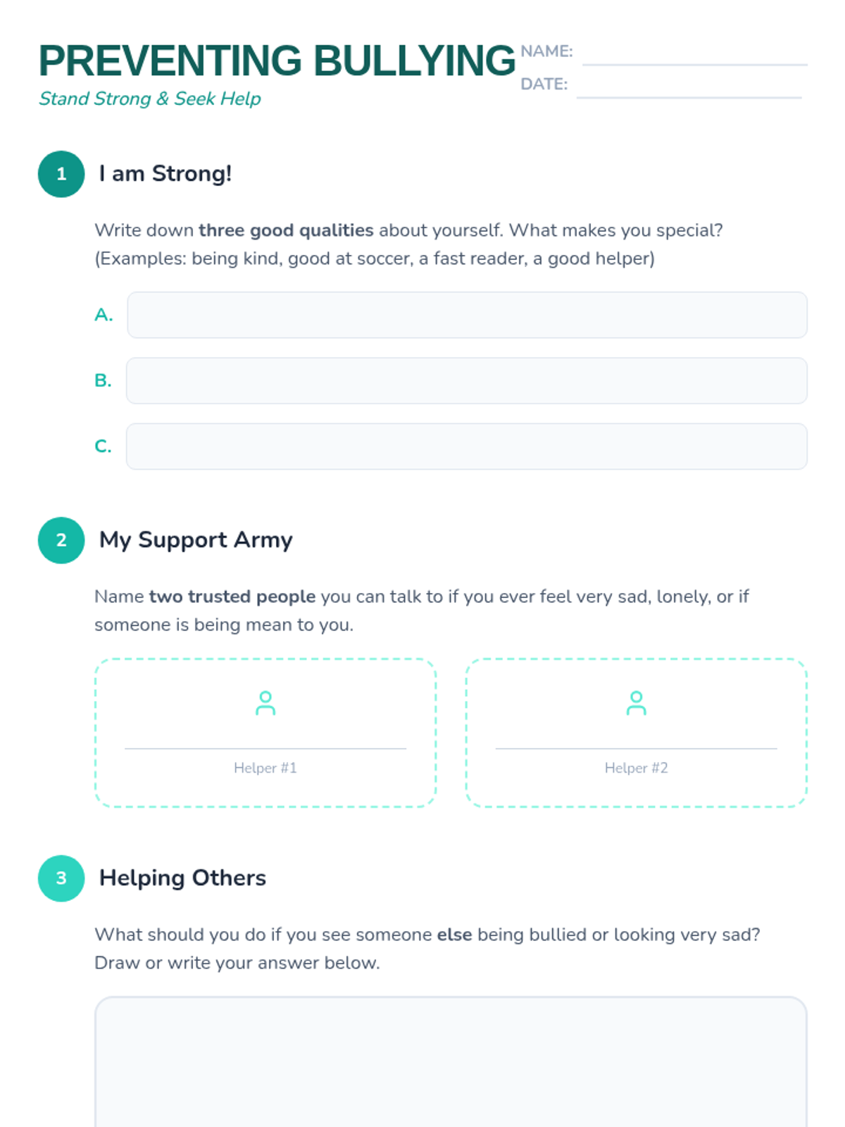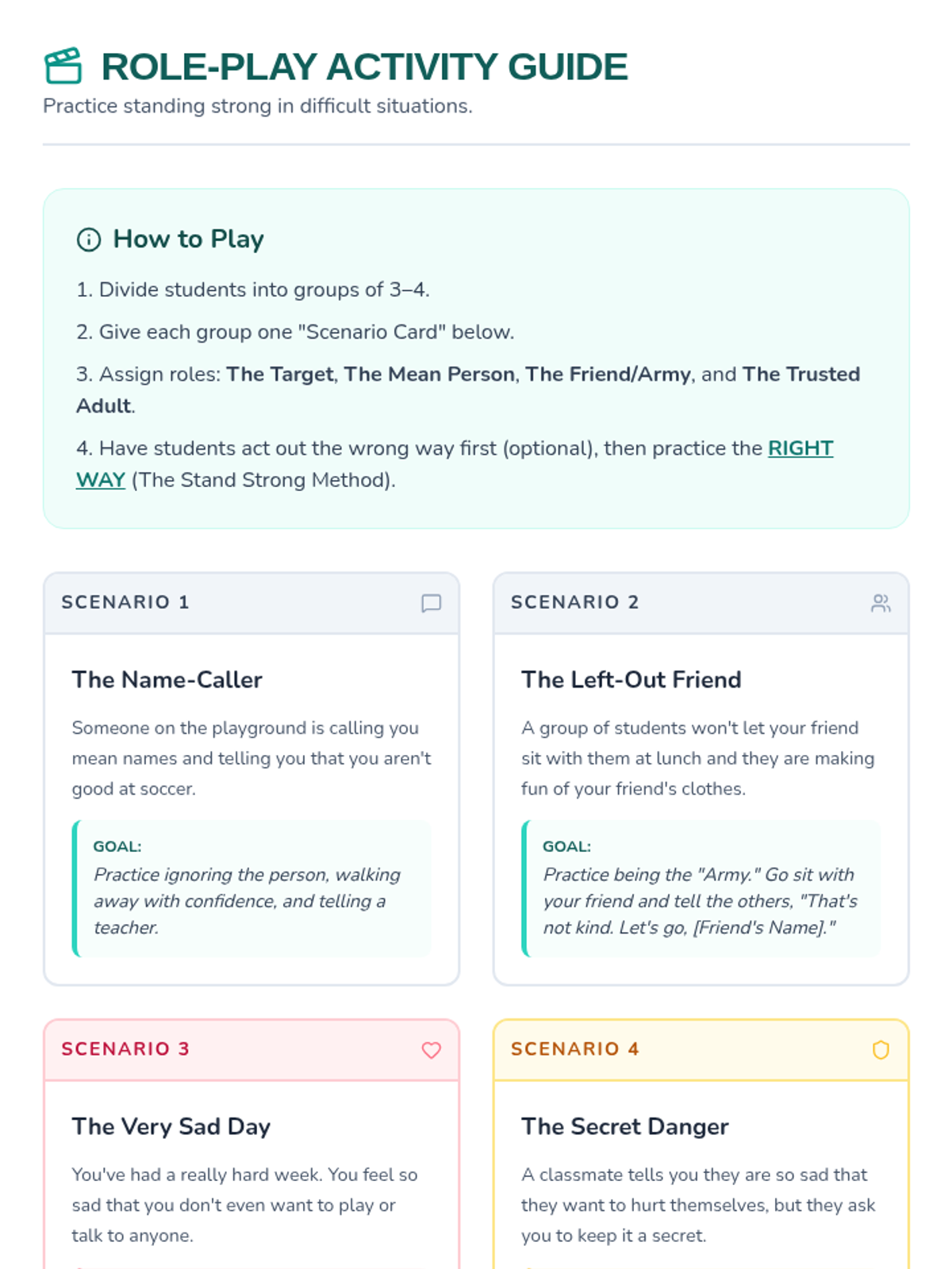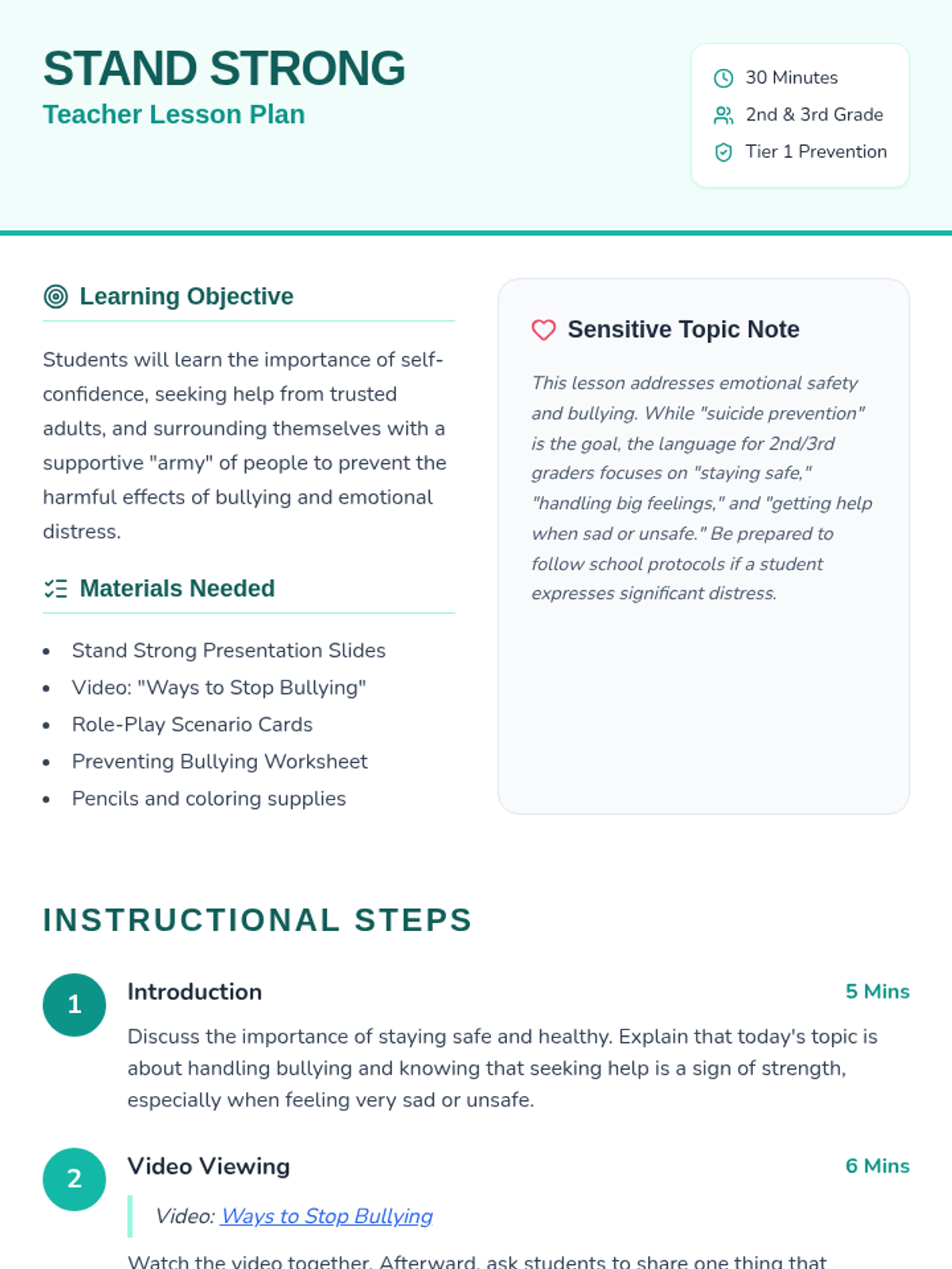 This lesson empowers 2nd and 3rd-grade students with the tools to handle bullying, build self-confidence, and identify trusted adults for support. It emphasizes the importance of a support system and provides practical strategies for emotional well-being and suicide prevention.