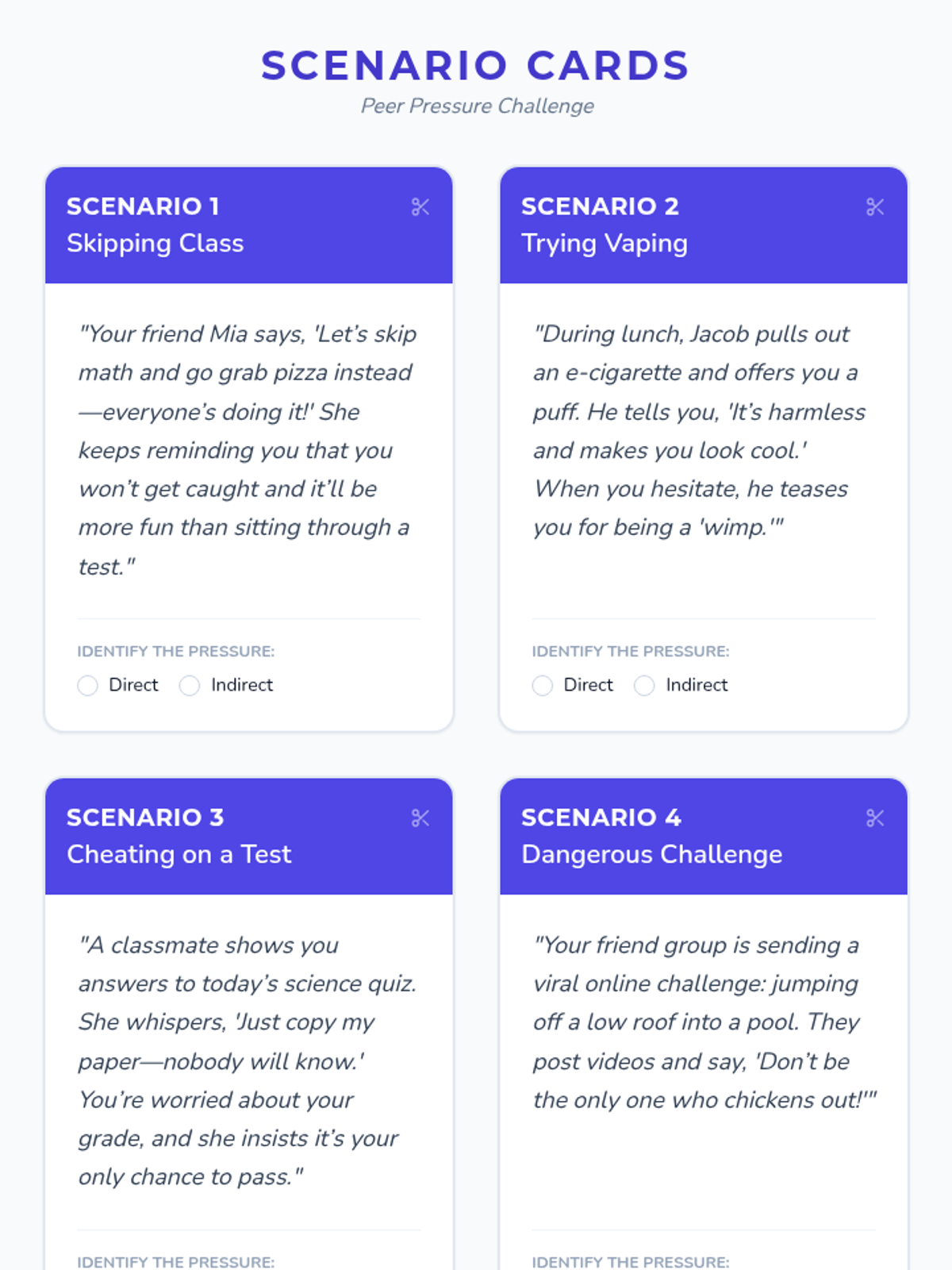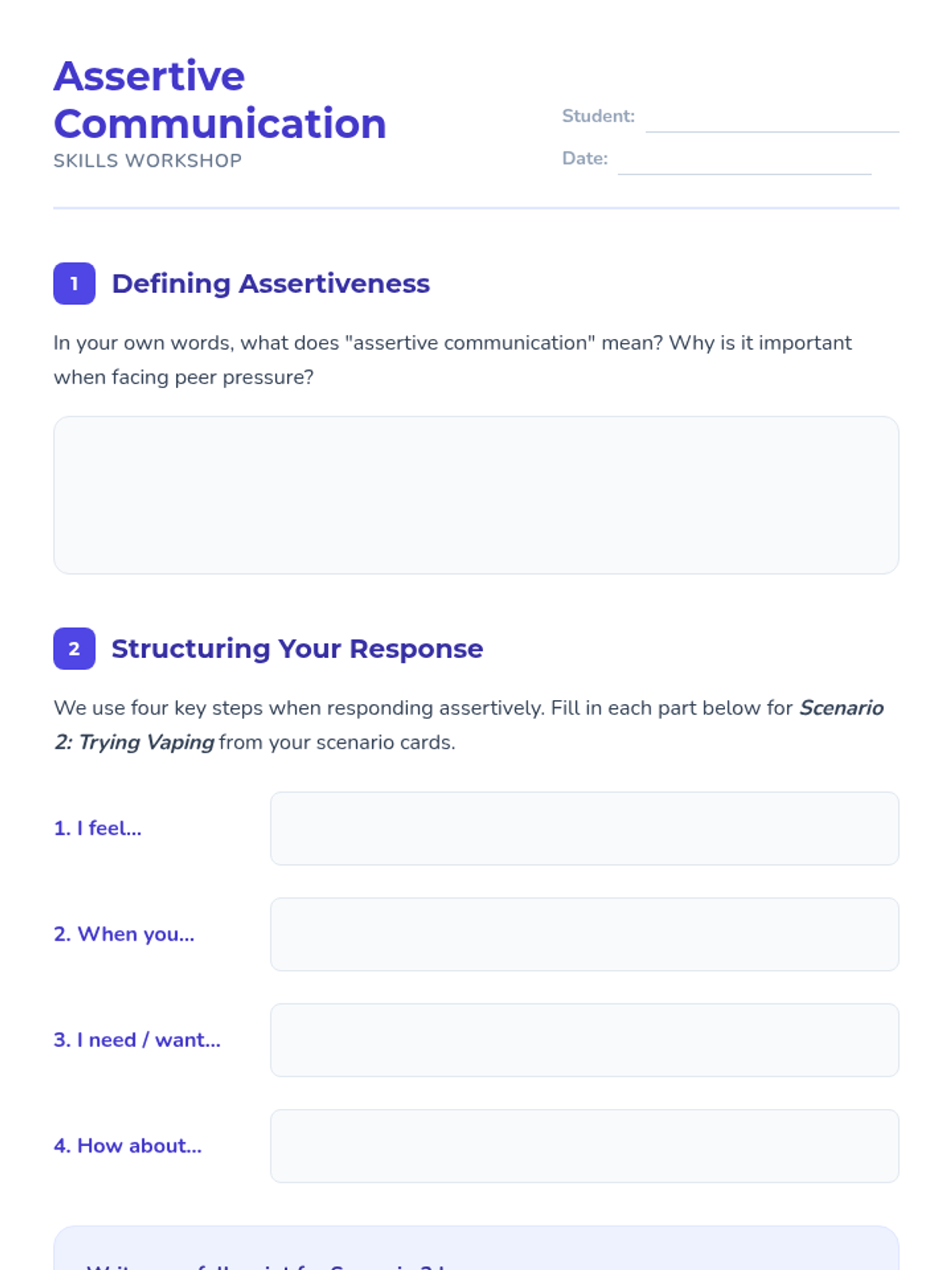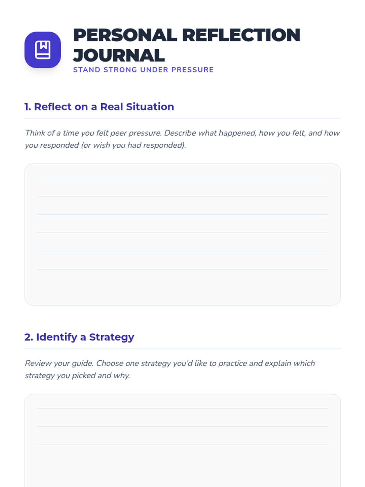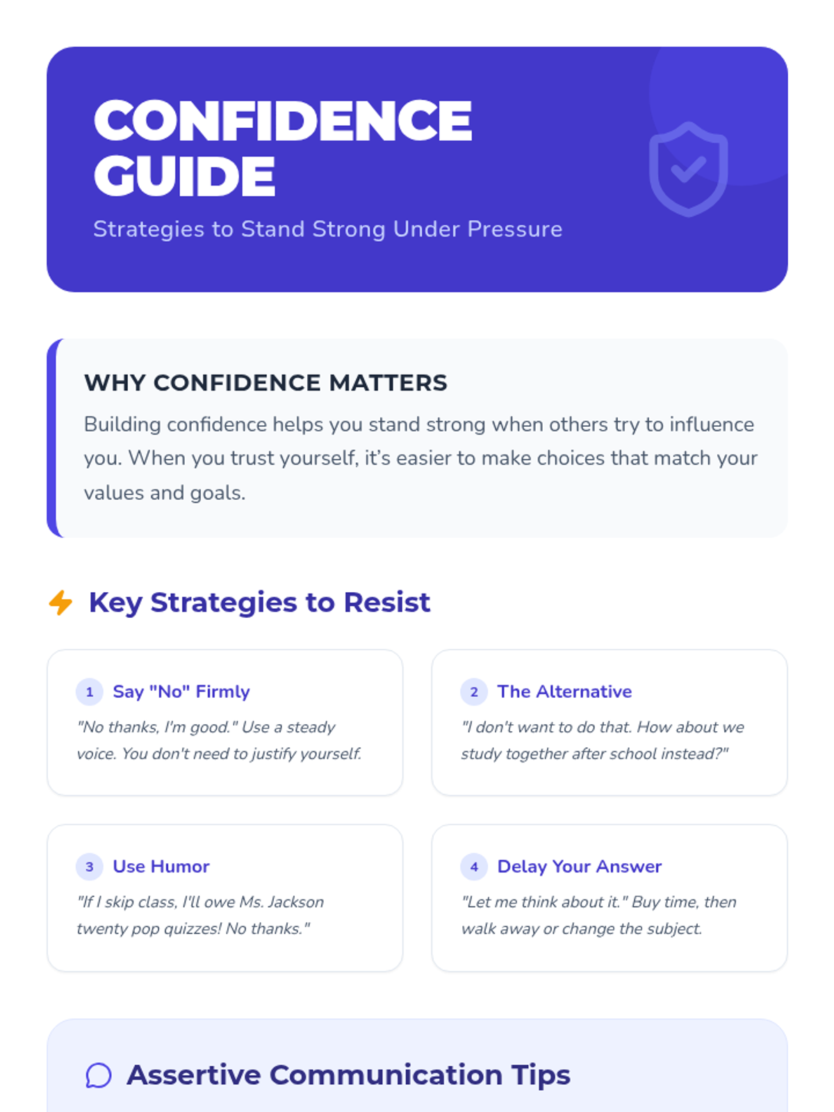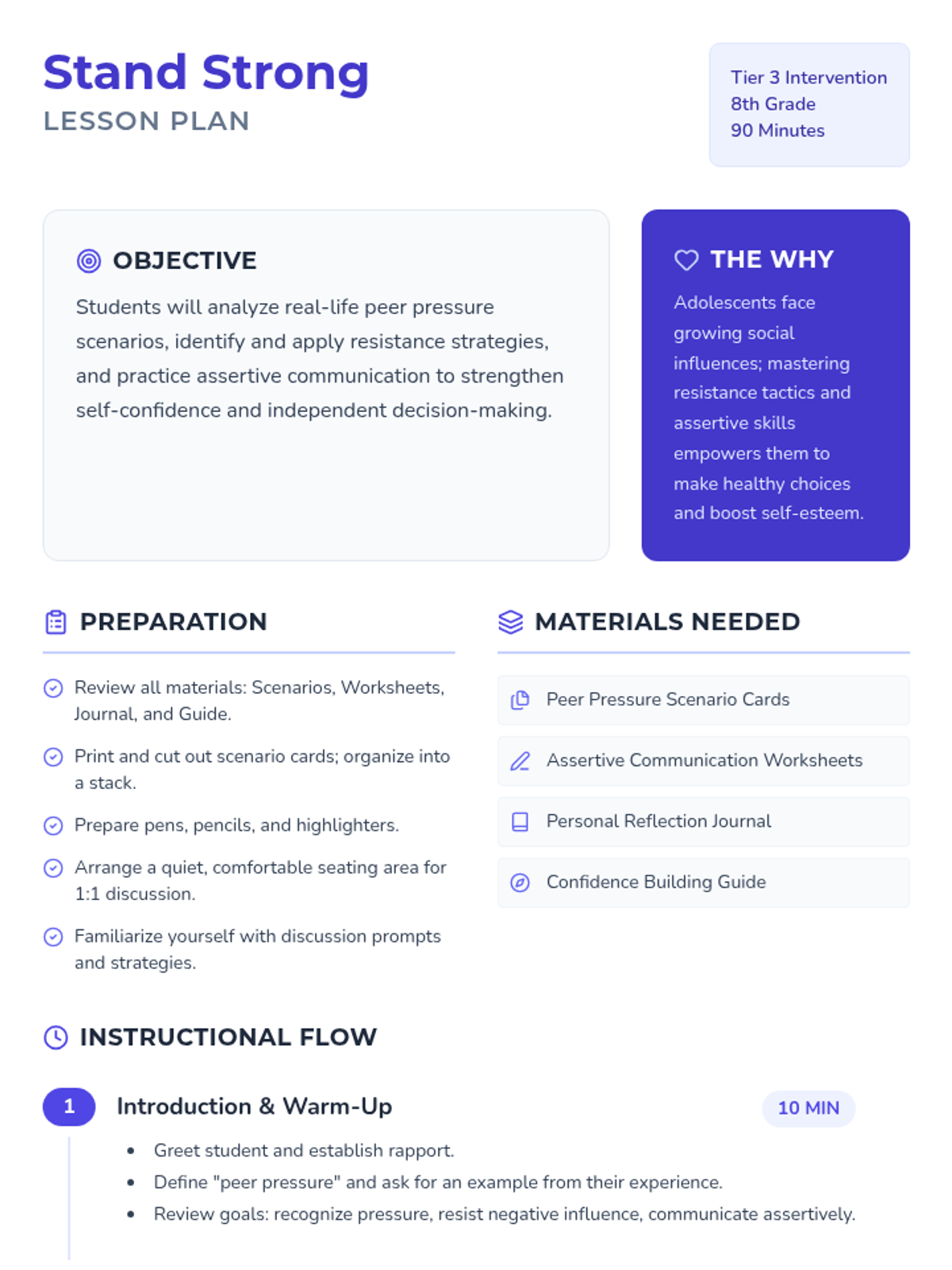 A 90-minute, one-on-one Tier 3 session for 8th graders focused on recognizing peer pressure, applying resistance strategies, and practicing assertive communication to build self-confidence.