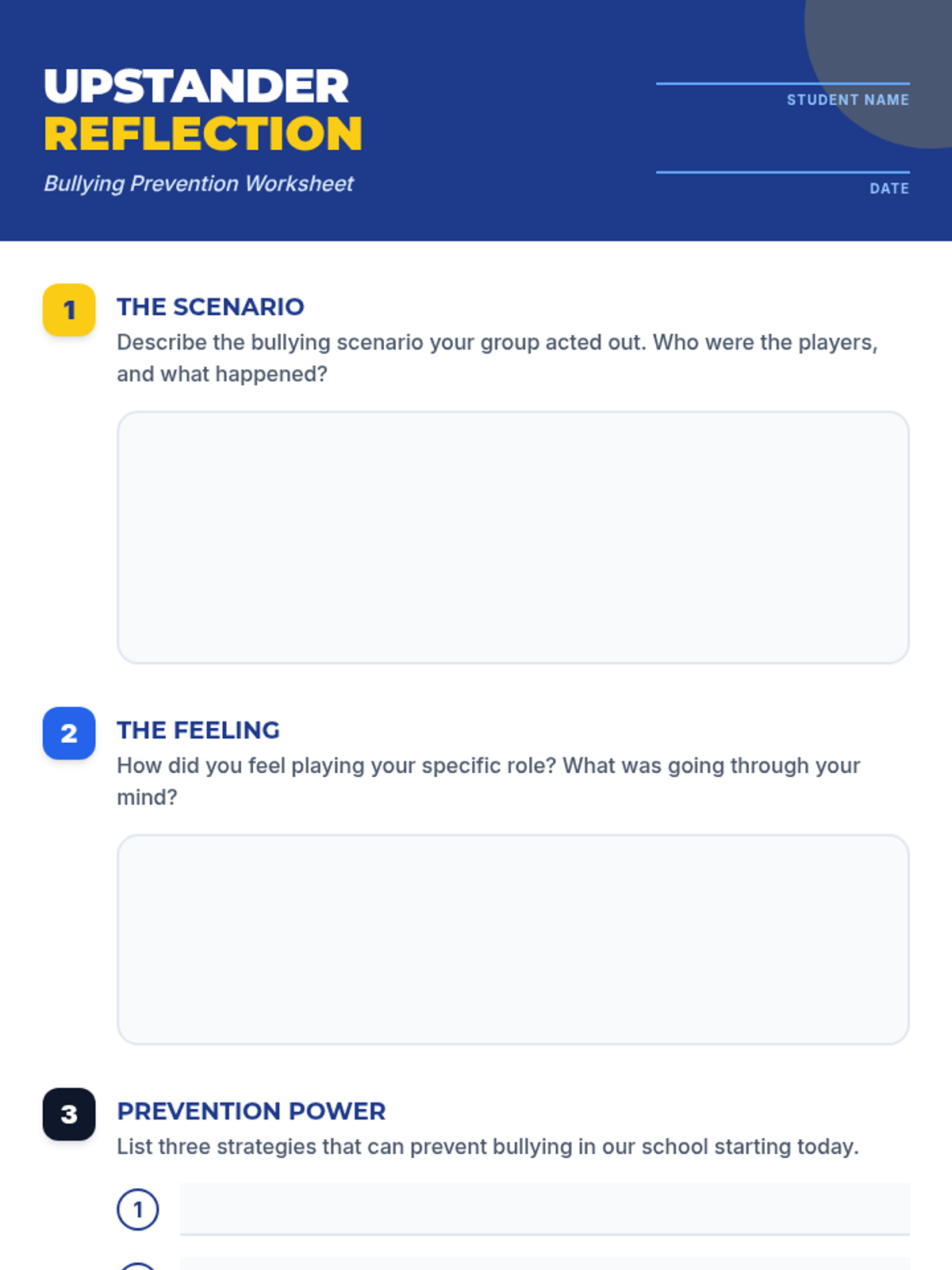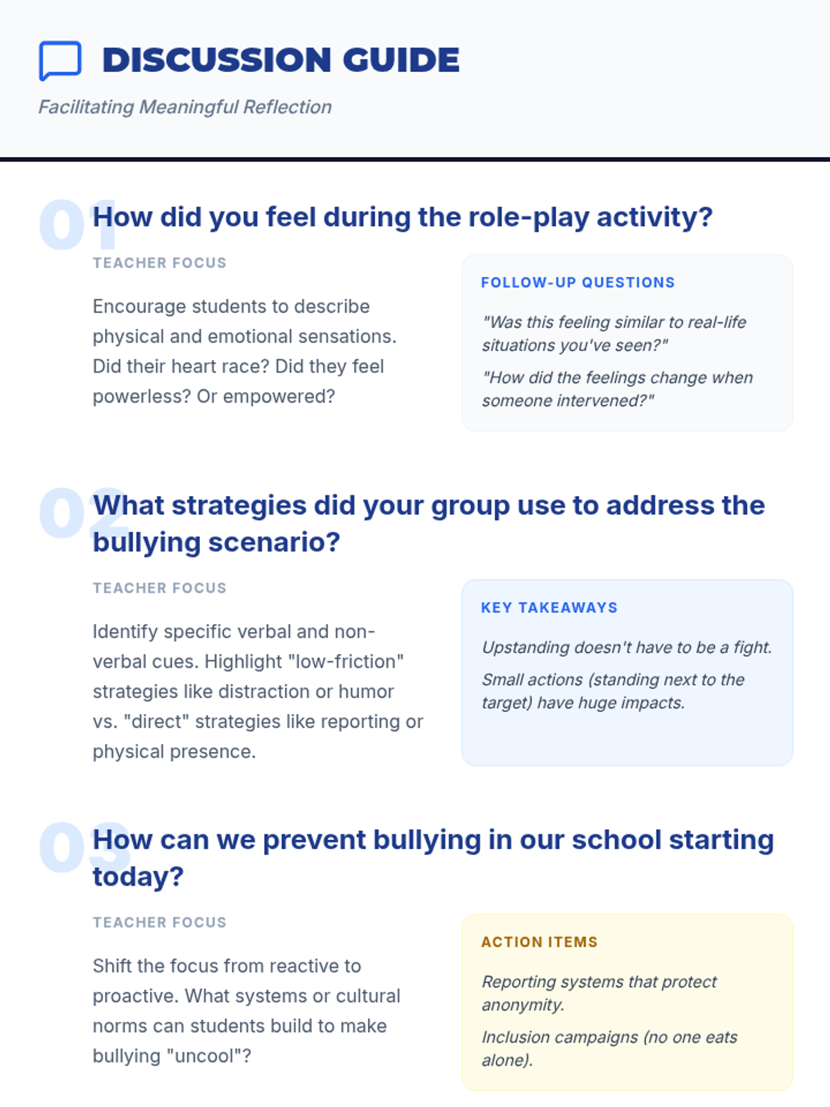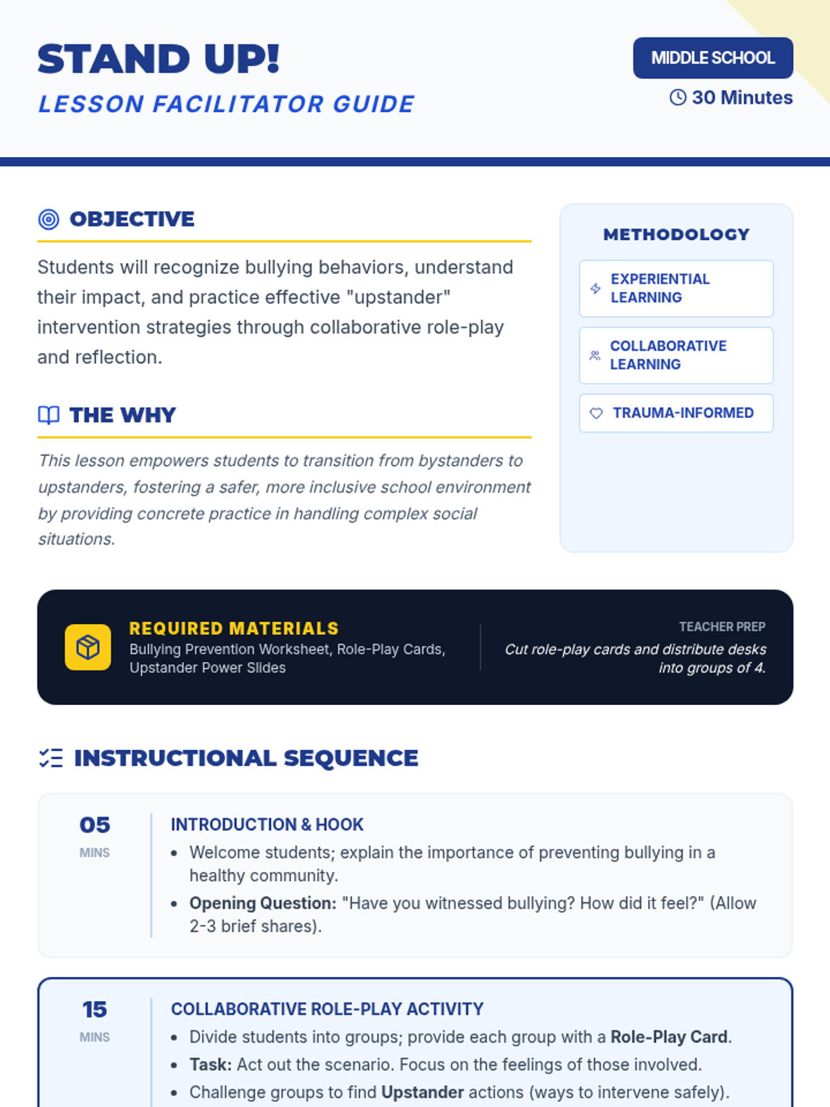 A 30-minute interactive lesson for middle schoolers focused on recognizing bullying, practicing intervention through role-play, and developing upstander strategies.