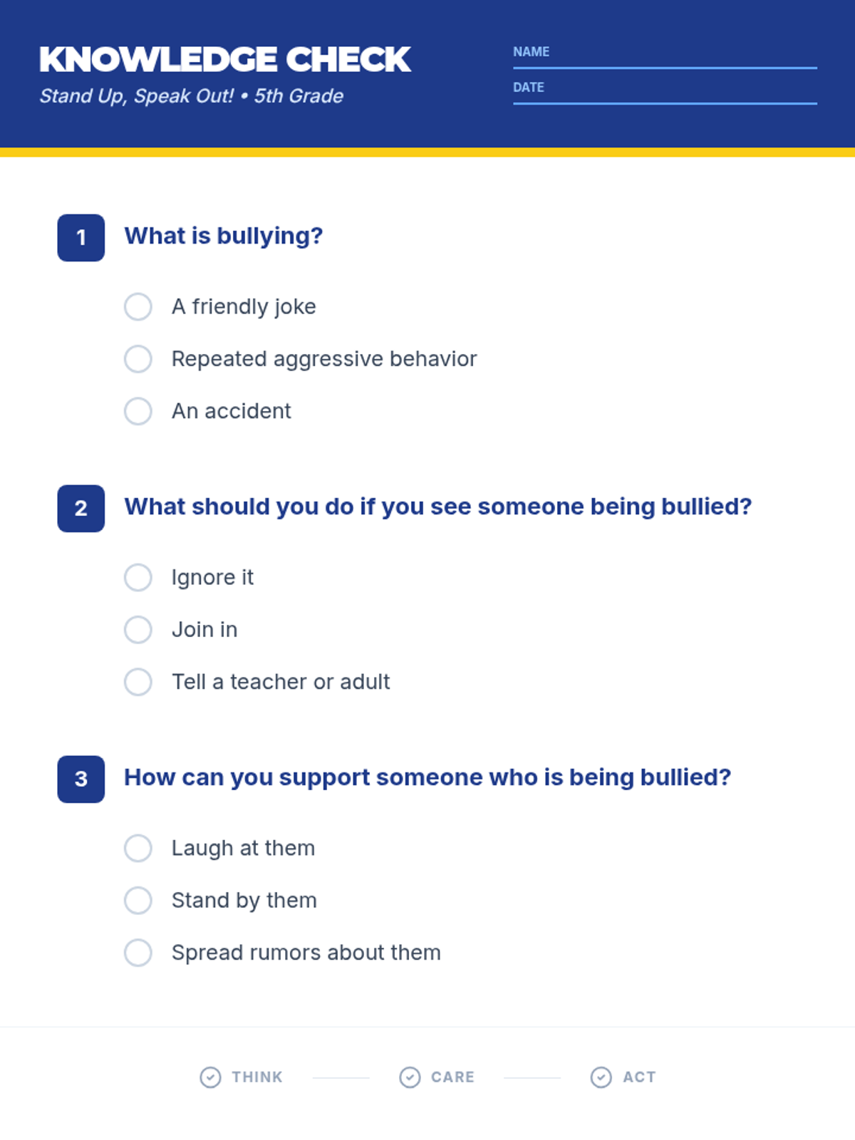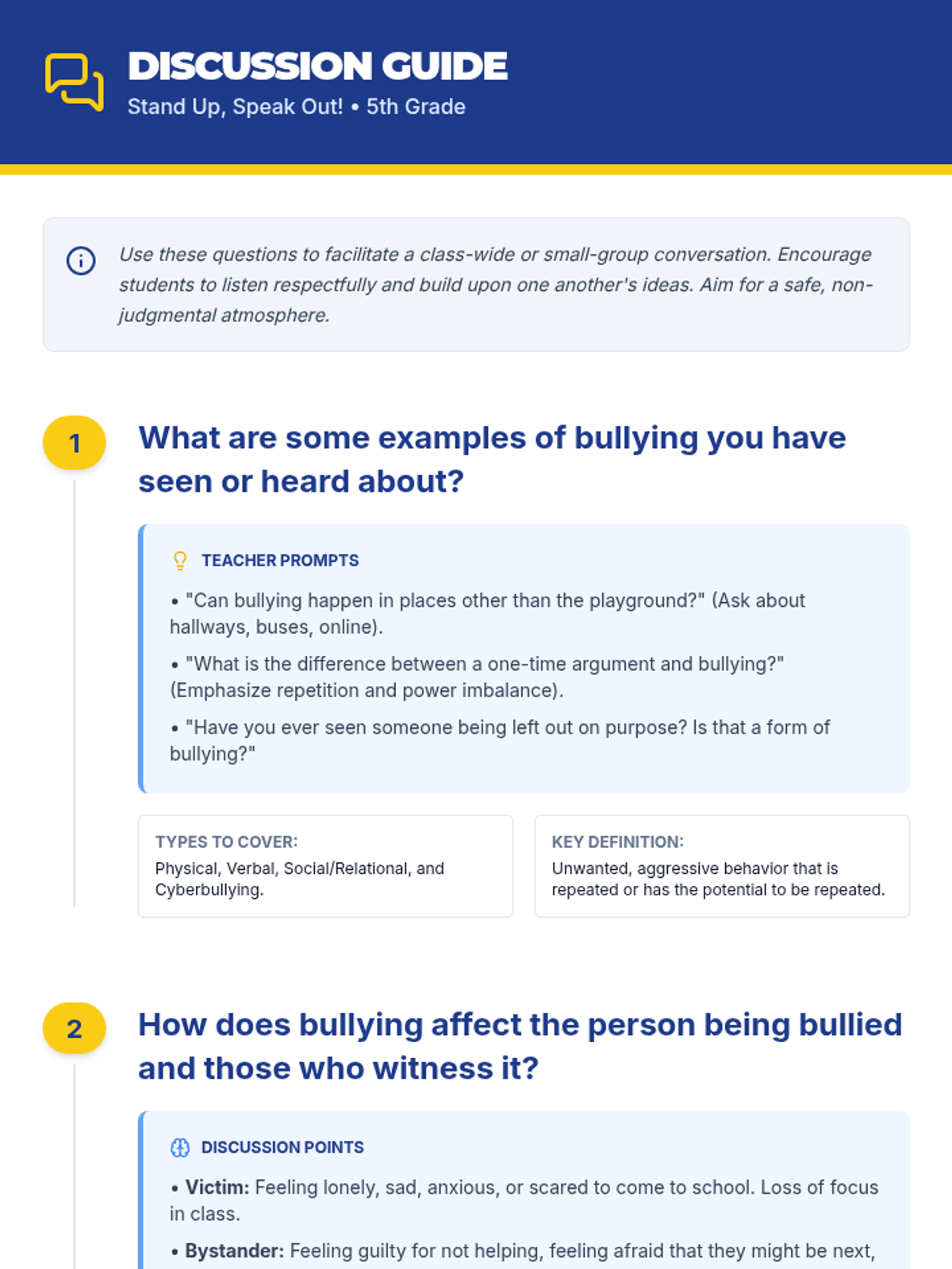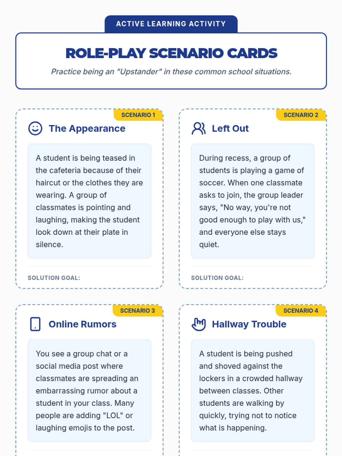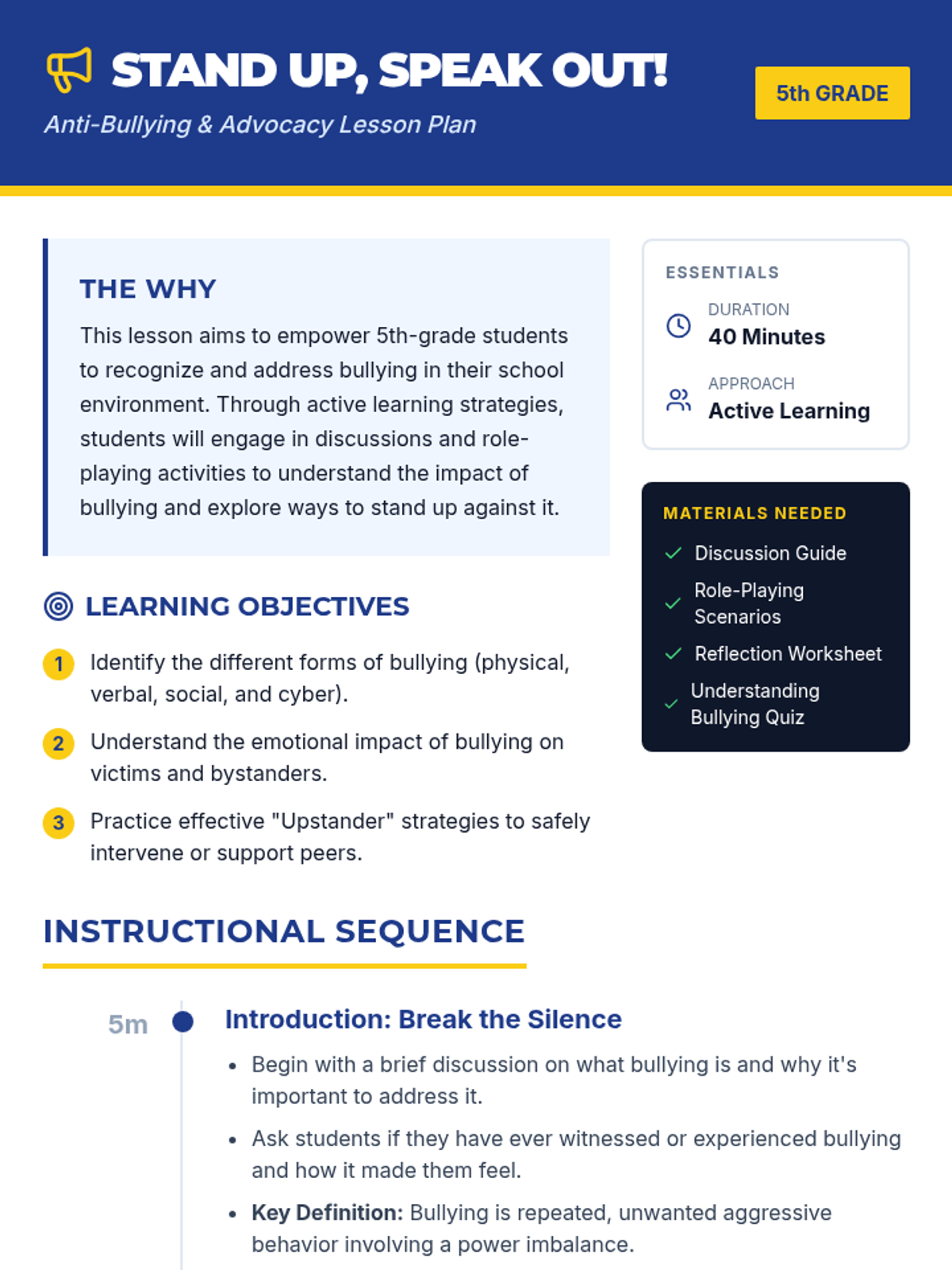Empower 5th-grade students to recognize and address bullying through active learning, role-playing, and reflection, fostering a safe and supportive school community.