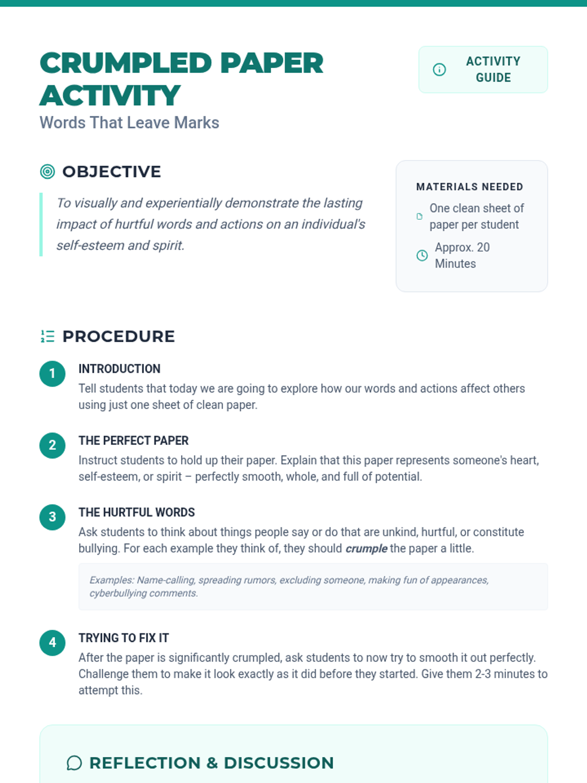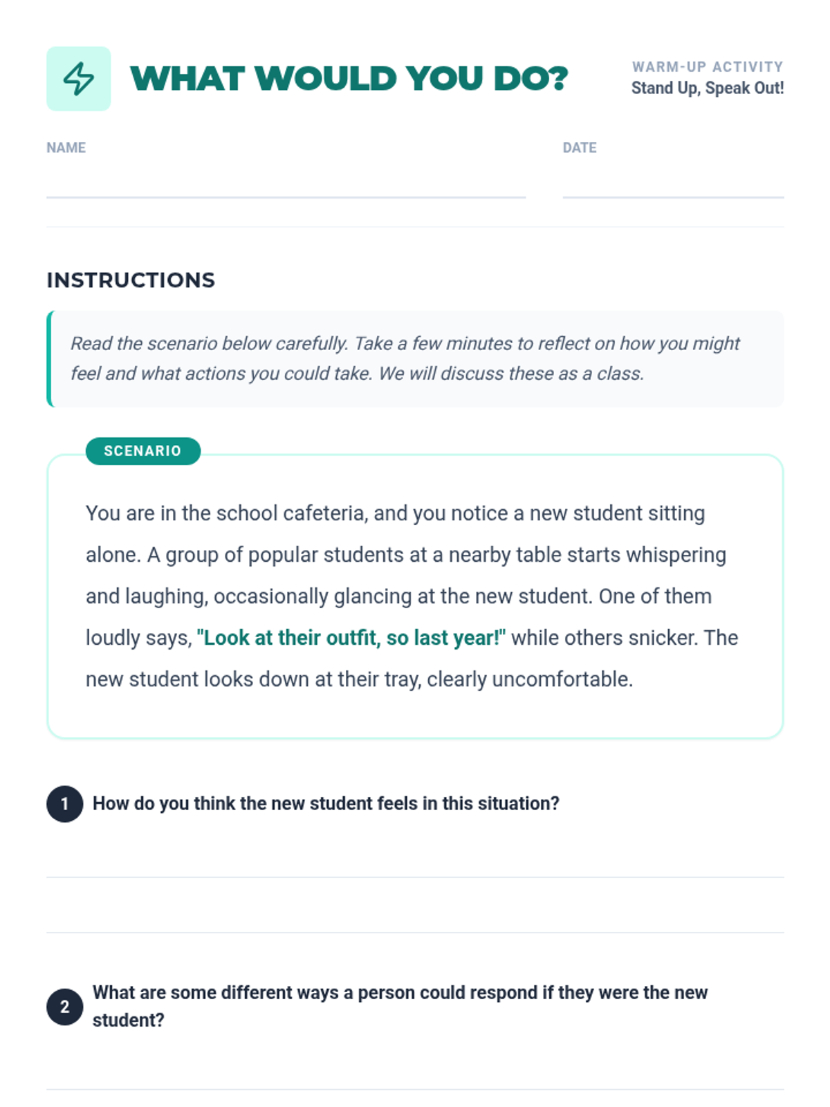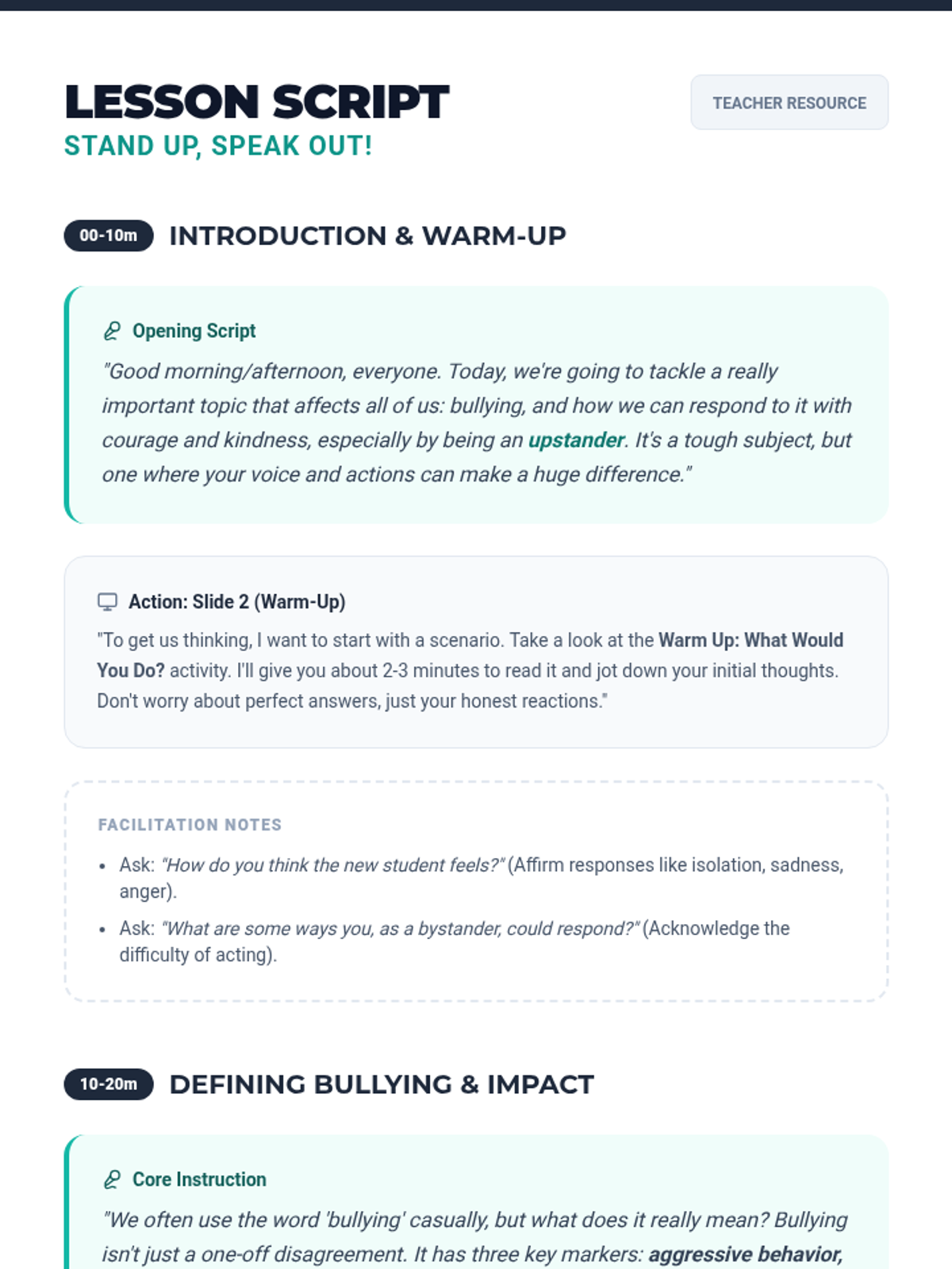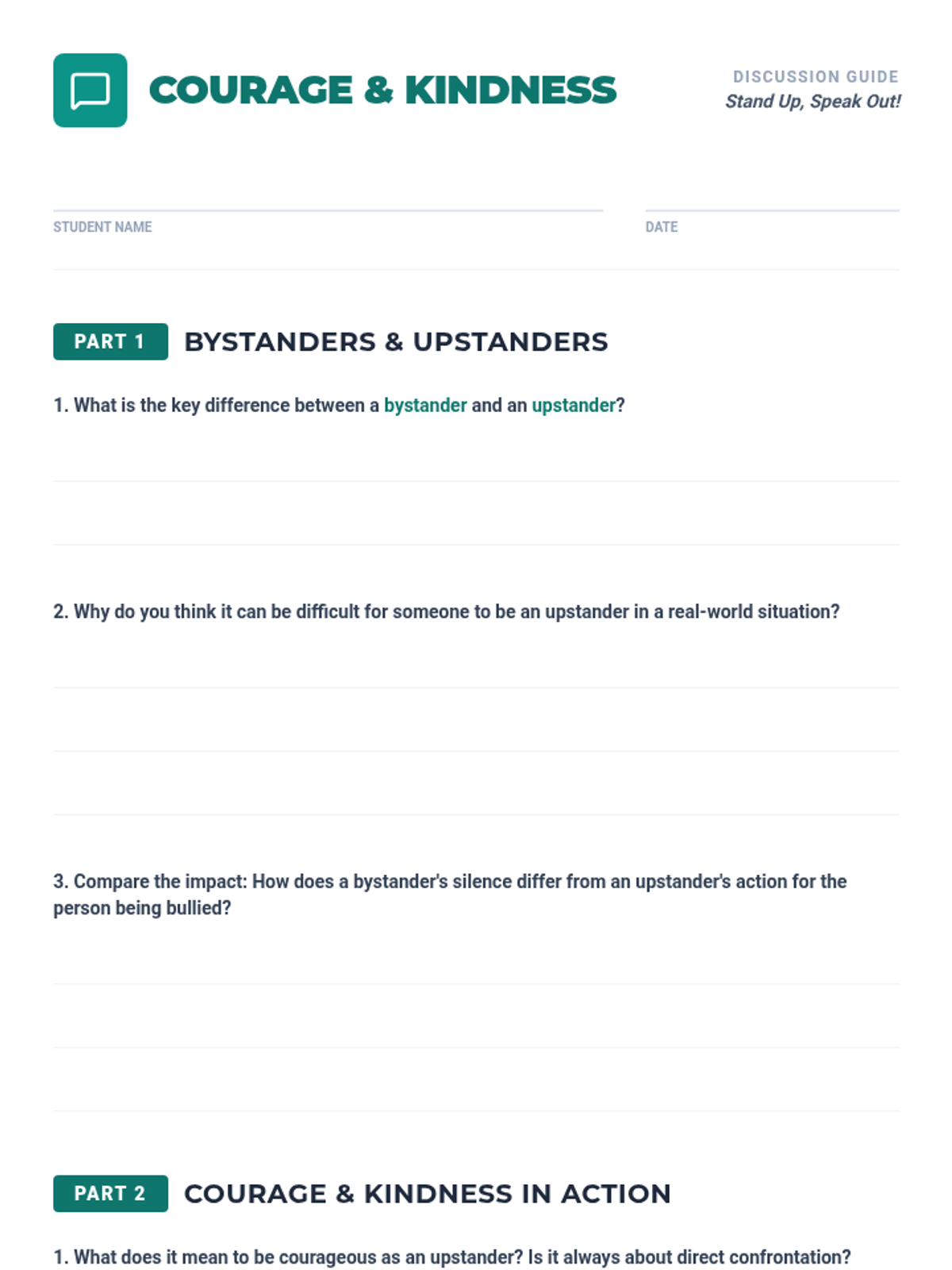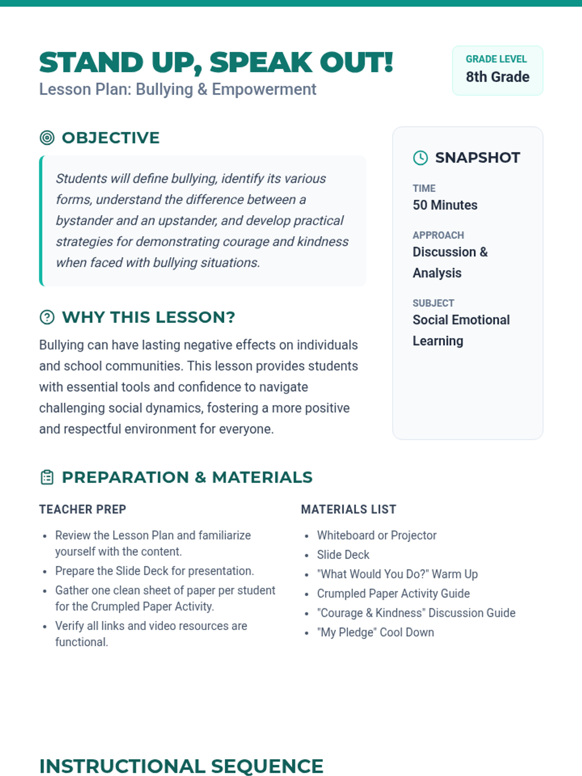 This lesson empowers 8th-grade students to understand the dynamics of bullying, recognize the importance of courage, and practice kindness through interactive activities and discussions. Students learn to transition from passive bystanders to active upstanders, developing practical strategies for creating a safer school environment.
