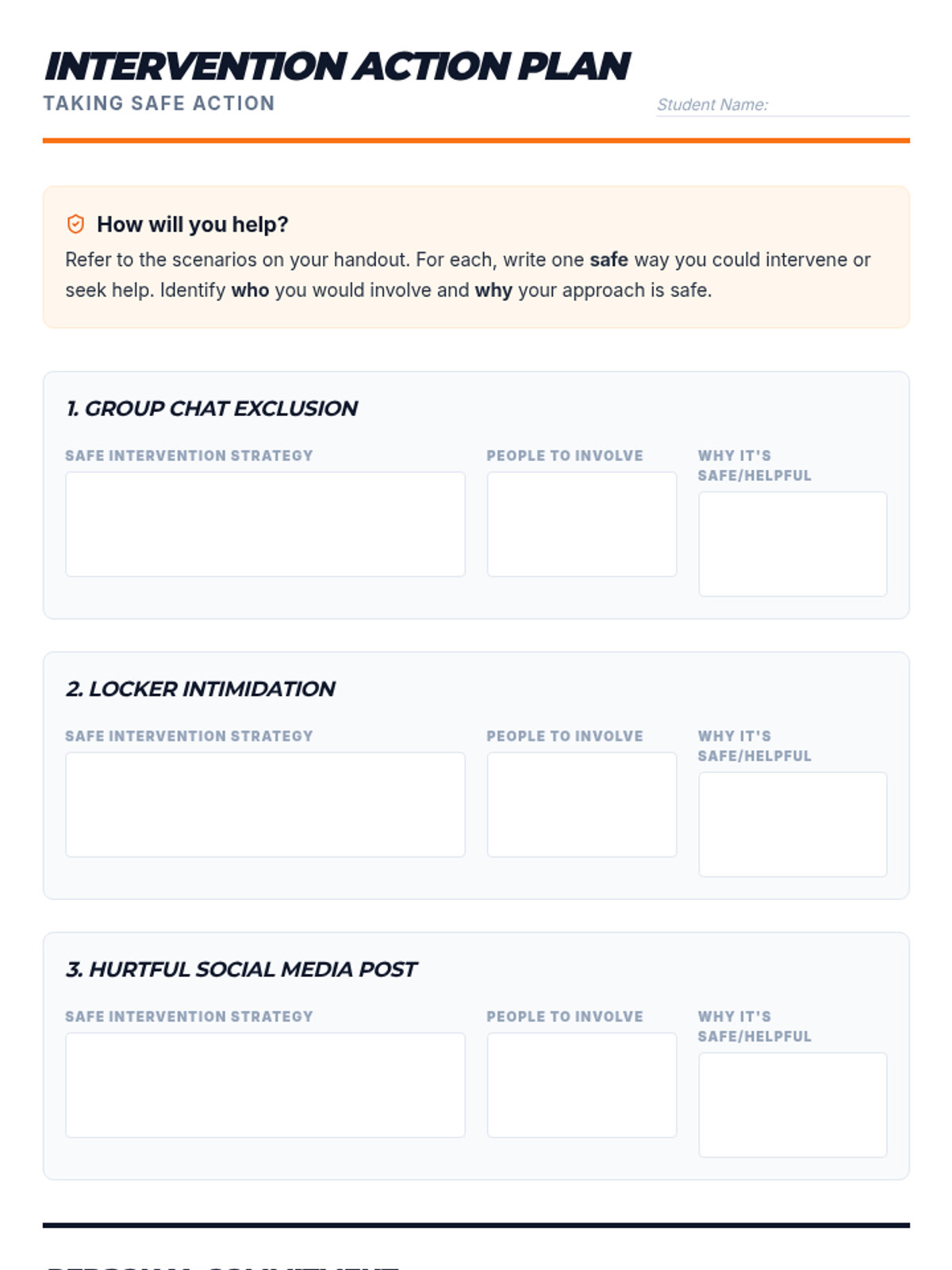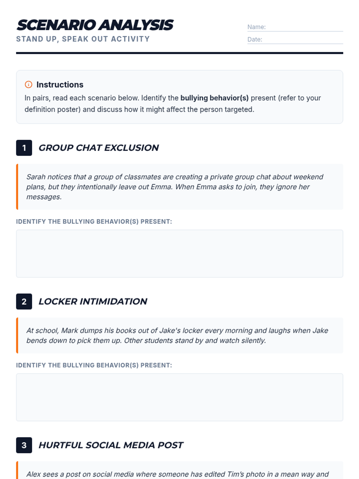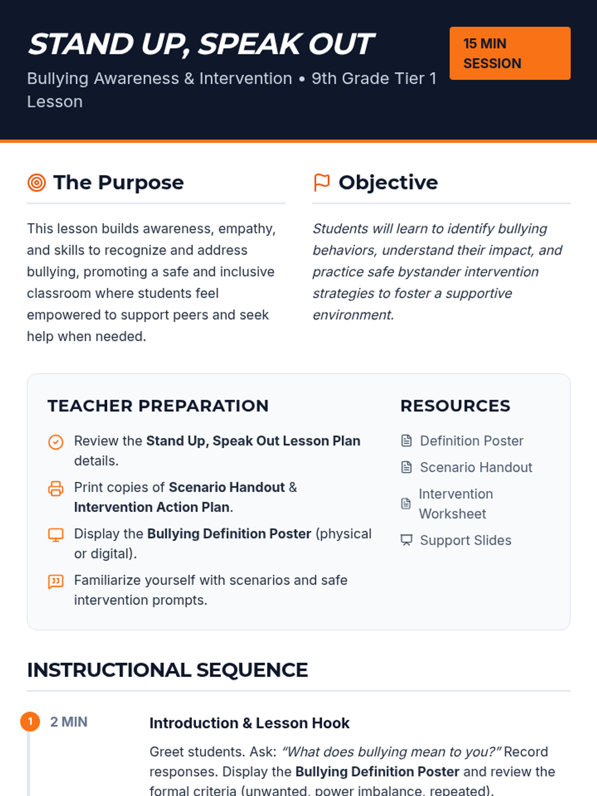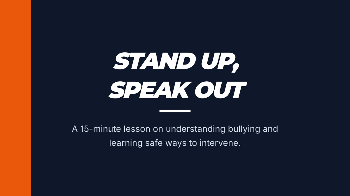 A 15-minute Tier 1 lesson for 9th graders to identify bullying types, analyze scenarios, and develop safe bystander intervention strategies.