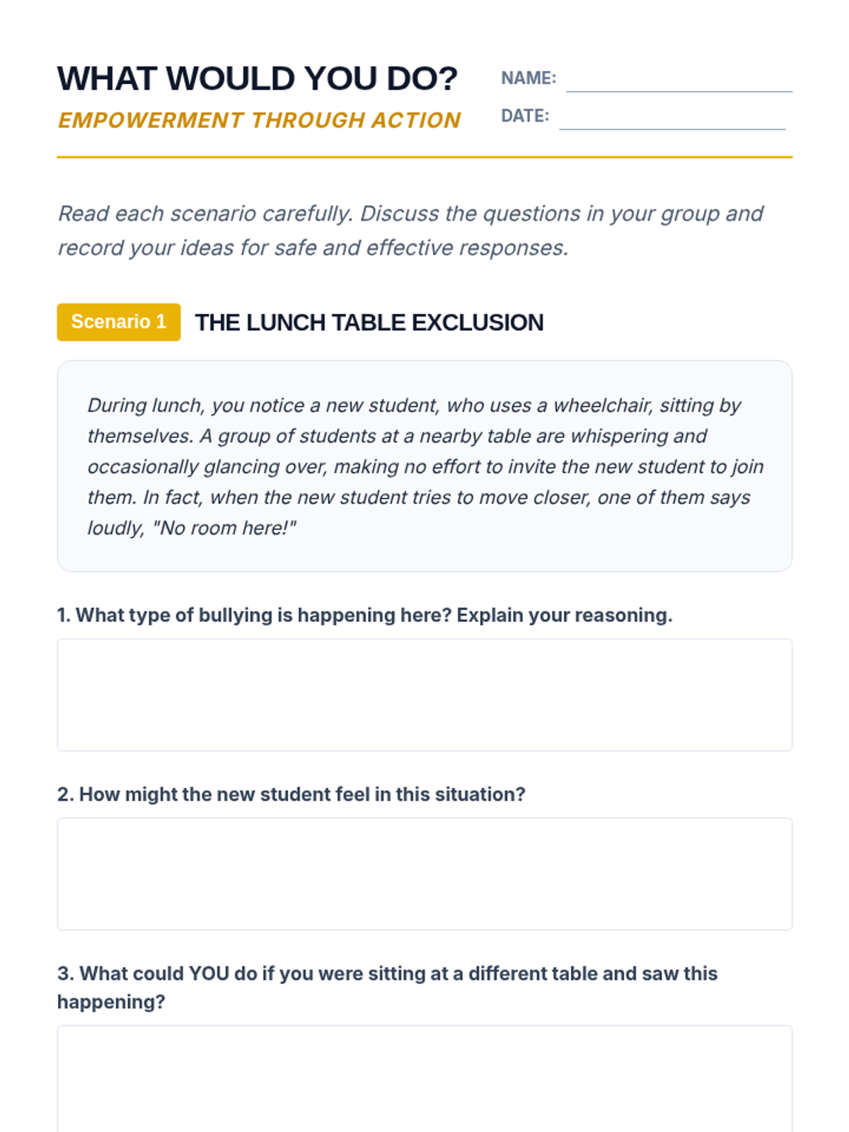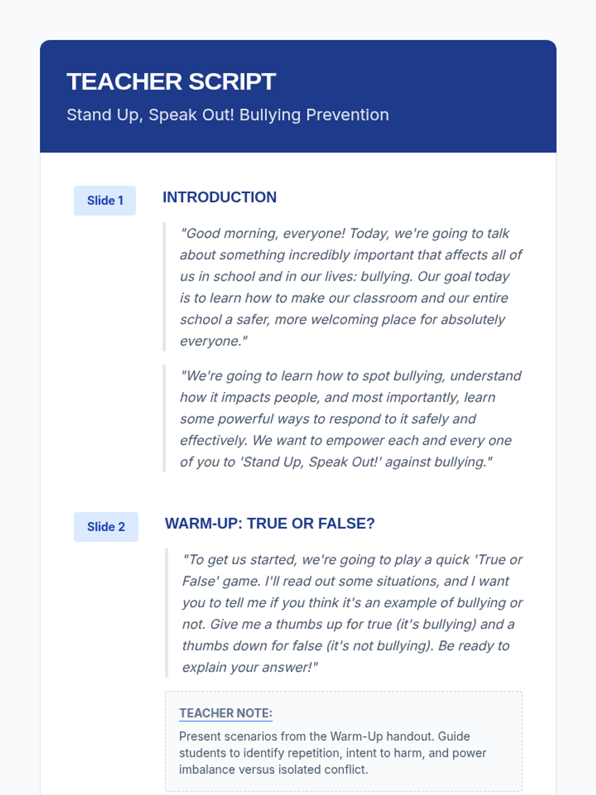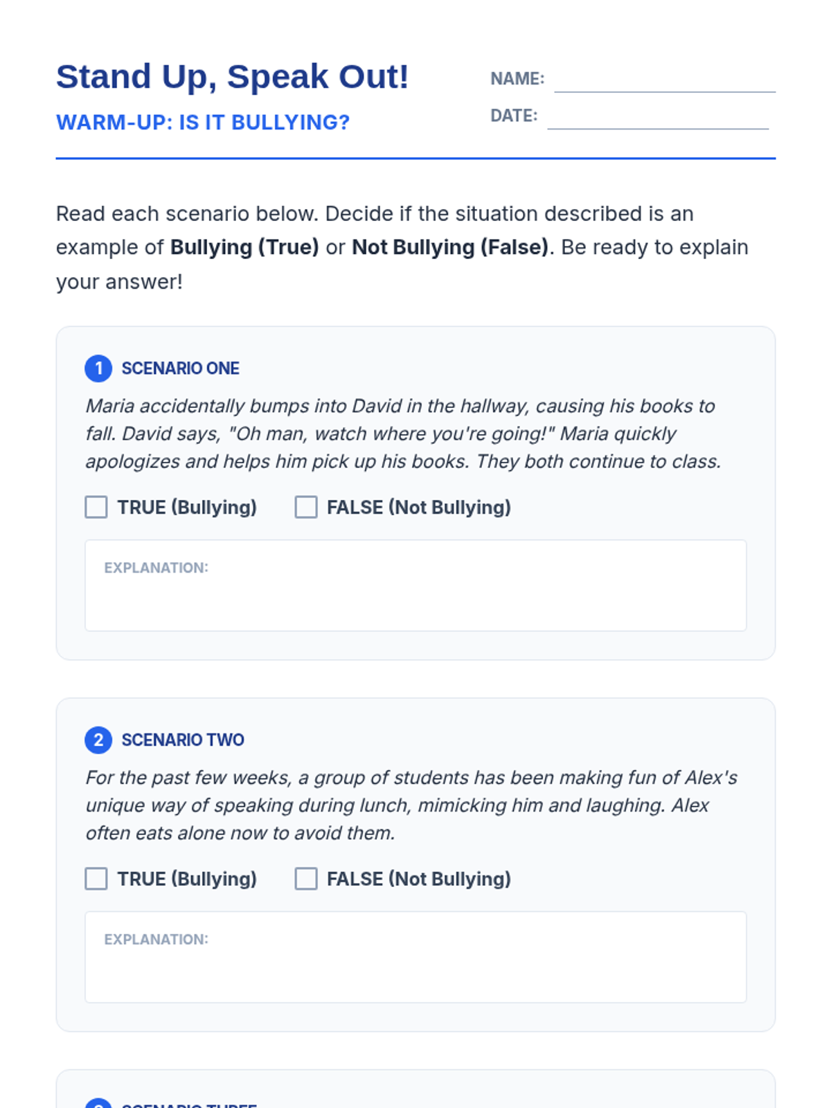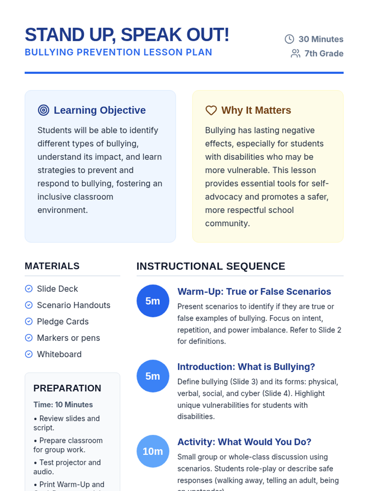 This 30-minute lesson empowers 7th-grade students to identify, prevent, and respond to bullying. It emphasizes creating an inclusive environment and provides practical strategies for self-advocacy and supporting peers.
