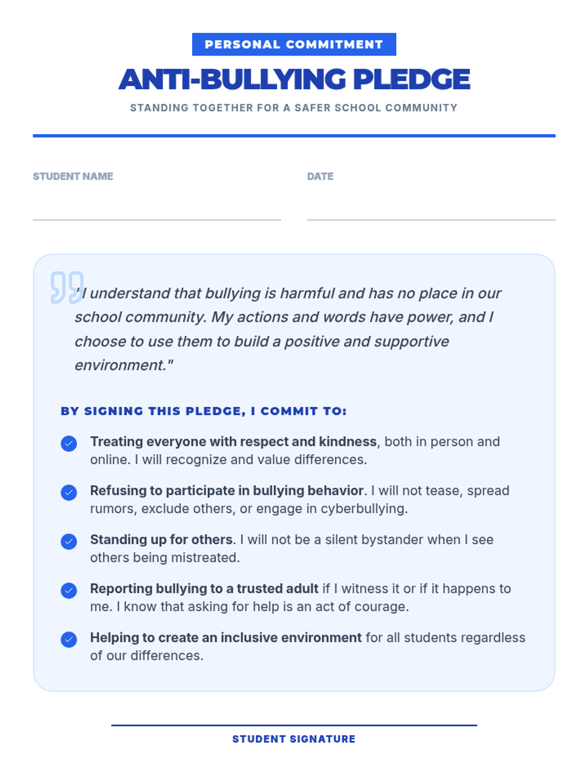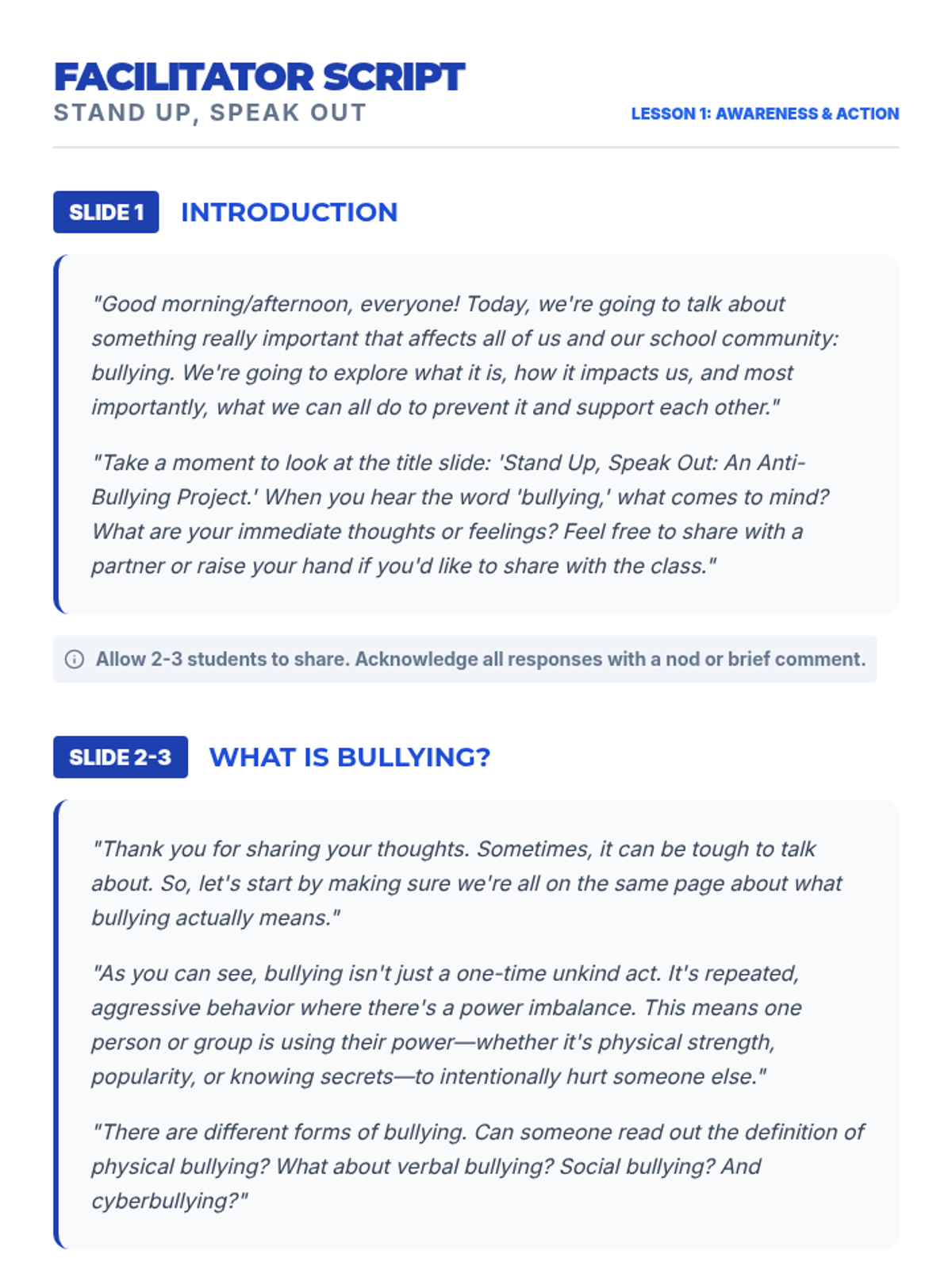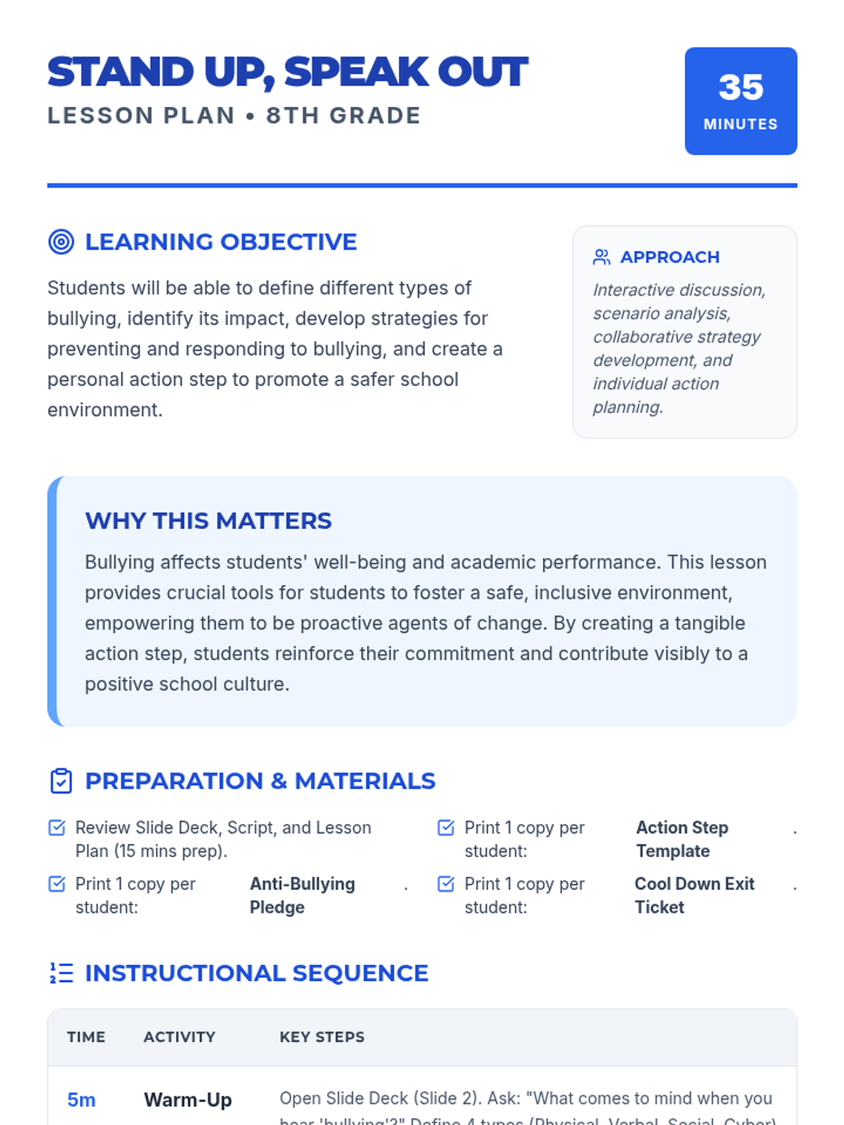 A 30-minute interactive lesson for 8th graders to define bullying, understand its impact, and commit to specific actions for a safer school community.