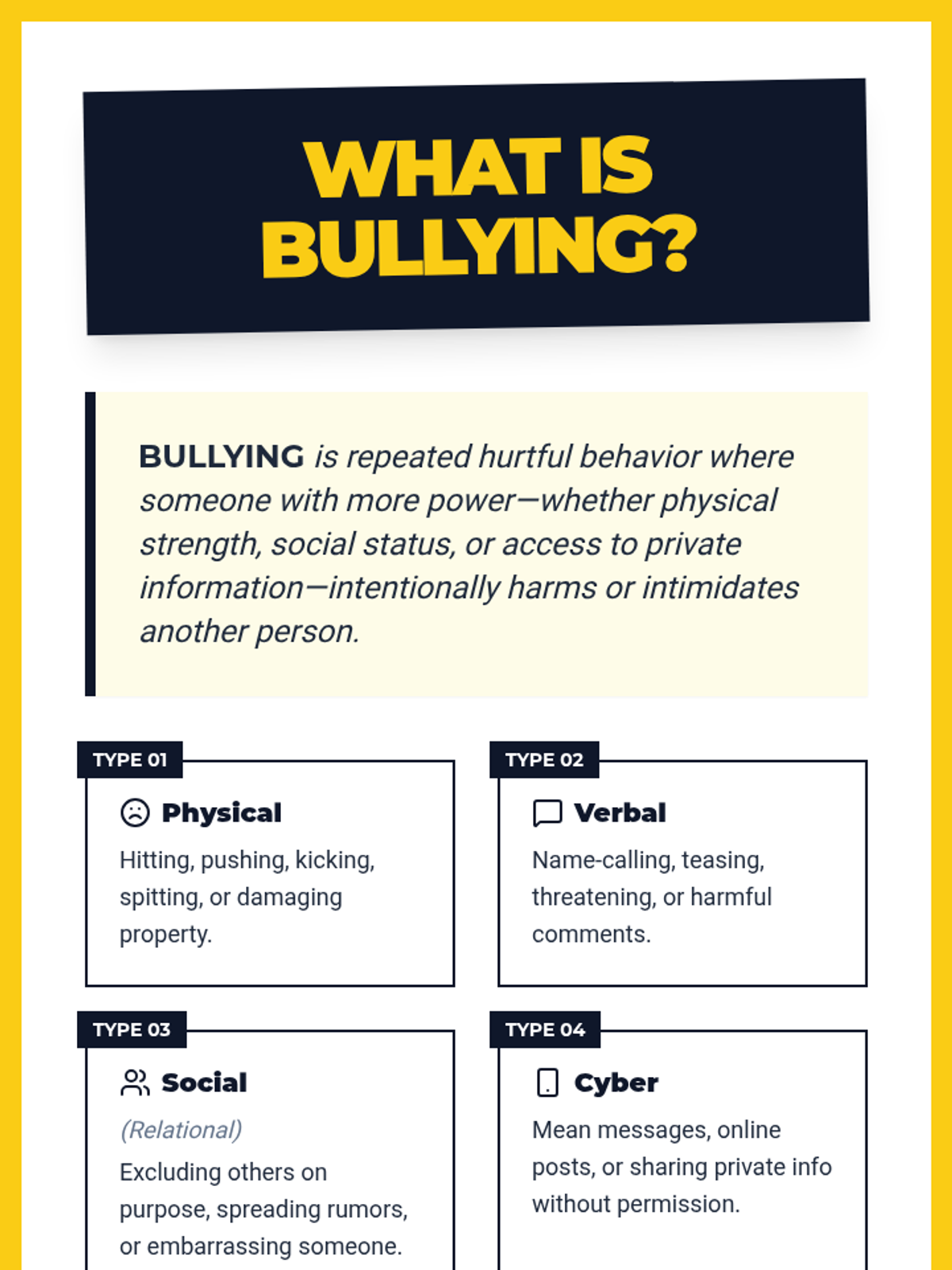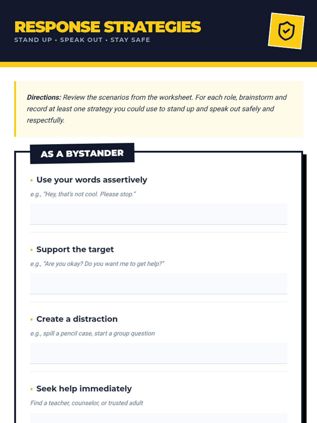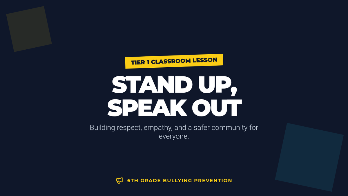 A 30-minute 6th-grade bullying prevention lesson where students learn to recognize bullying behaviors, understand their impact, and practice safe, respectful strategies to stand up and speak out.