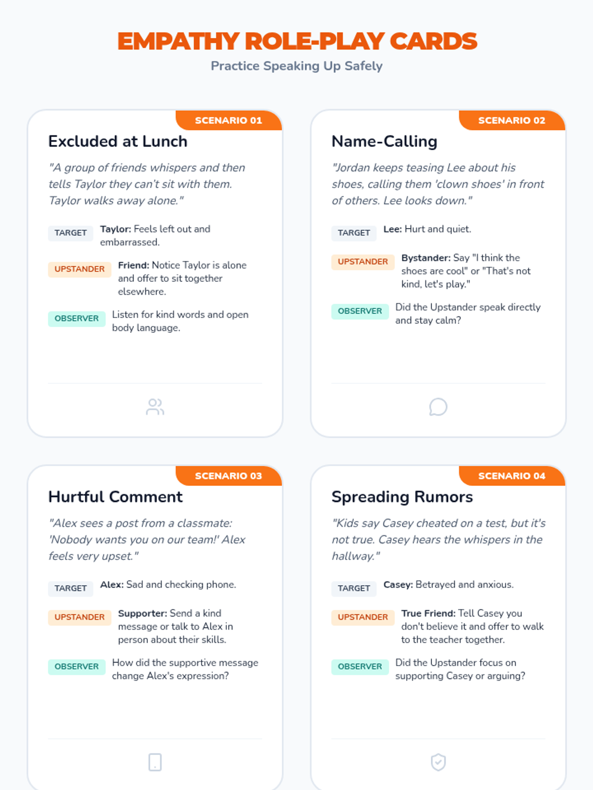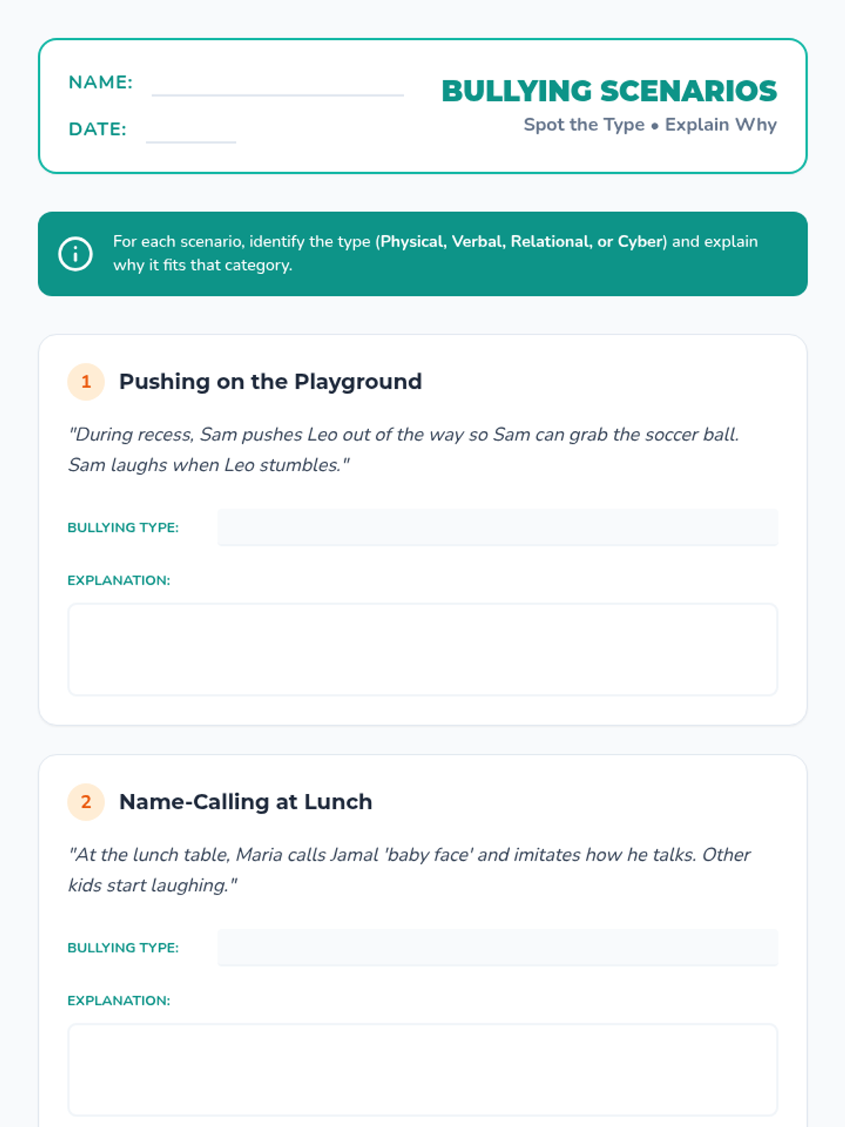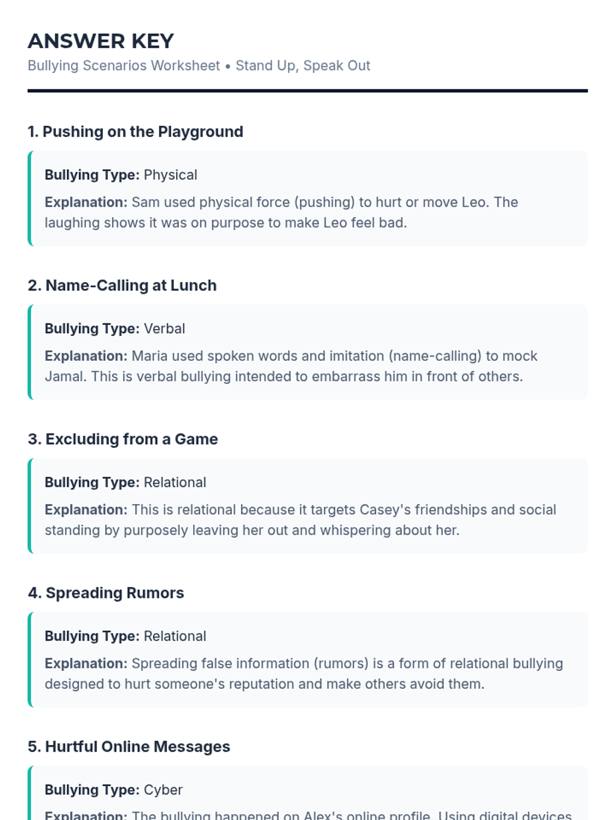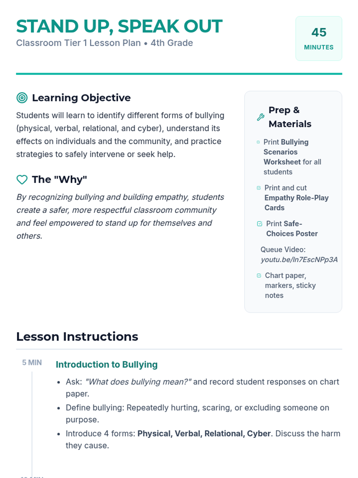 In this 45-minute lesson, 4th graders will learn to recognize different forms of bullying, understand its impact, and practice strategies to stand up for themselves and others. Building empathy and safe classroom communities promotes respect and reduces negative behavior.