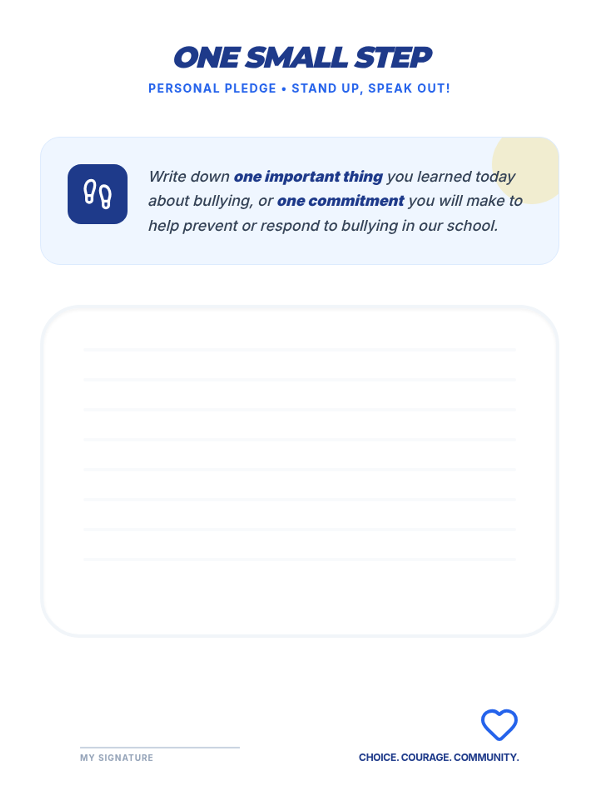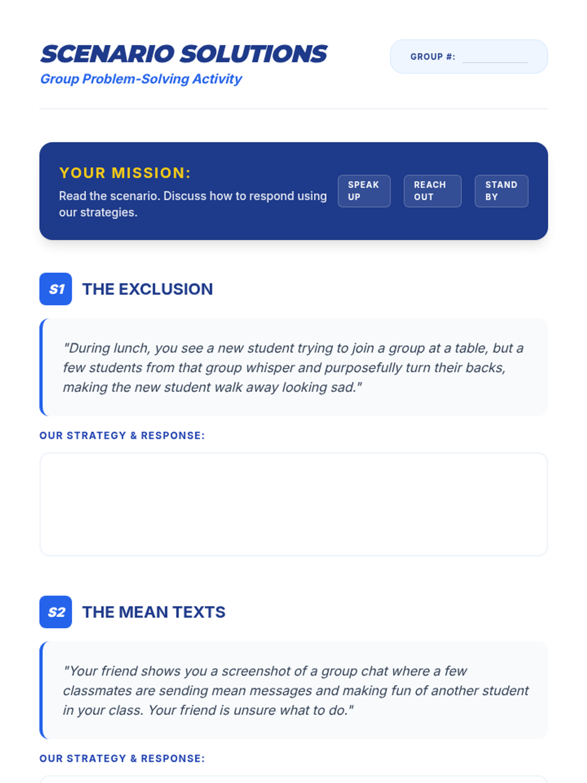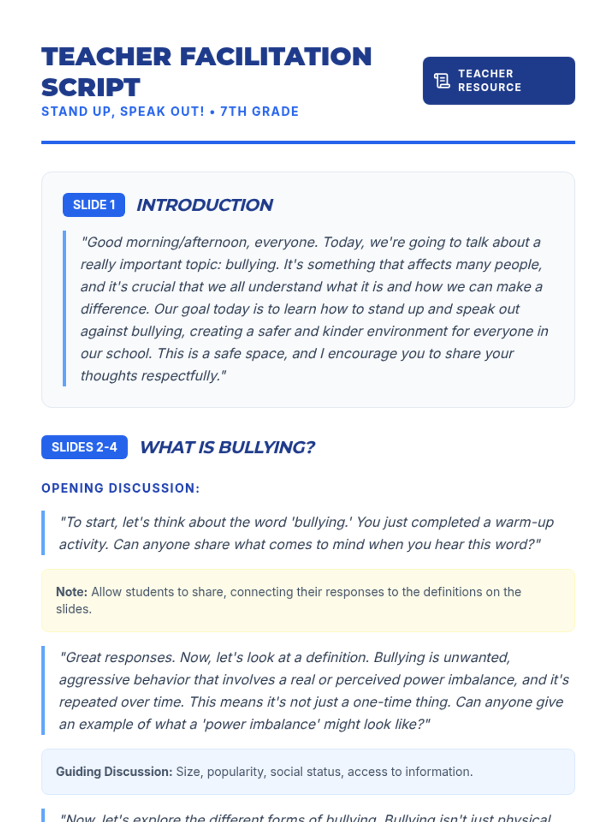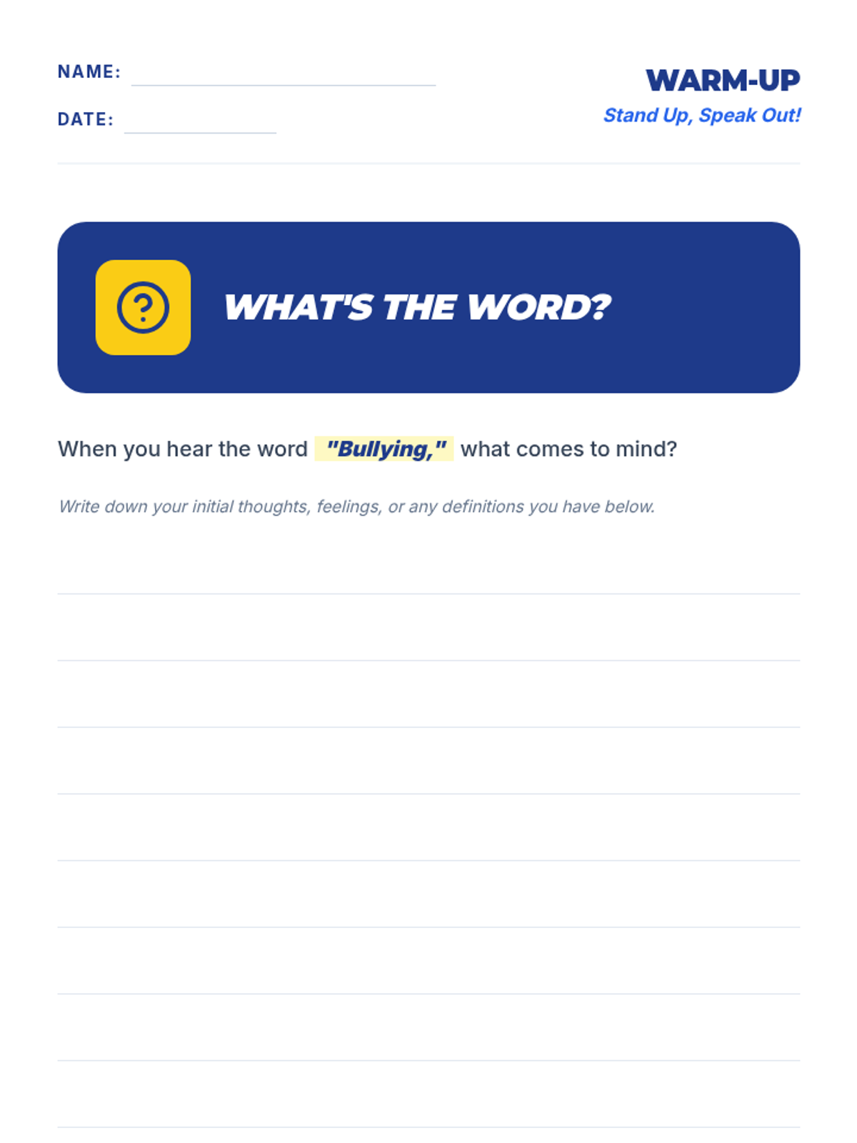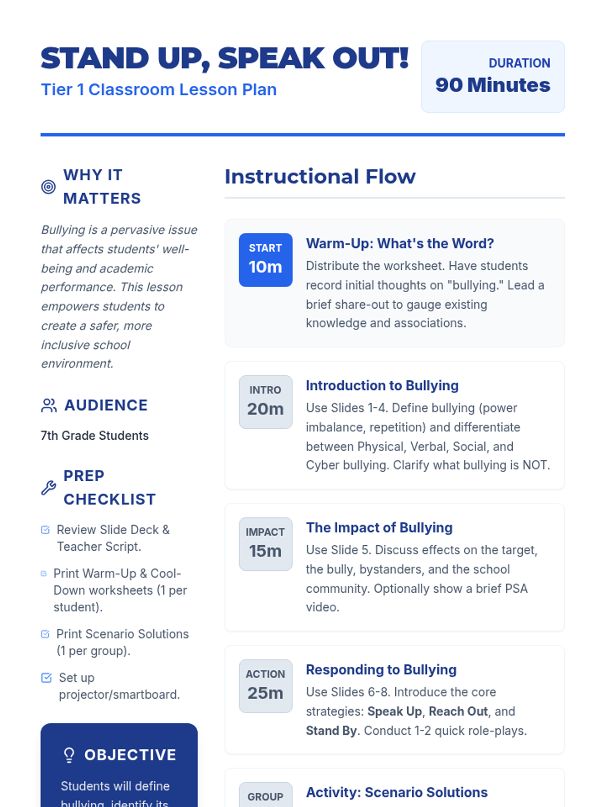 A comprehensive 90-minute lesson for 7th-grade students to recognize, prevent, and respond to bullying. Students will explore different forms of bullying, its impact, and actionable strategies like Speaking Up, Reaching Out, and Standing By.