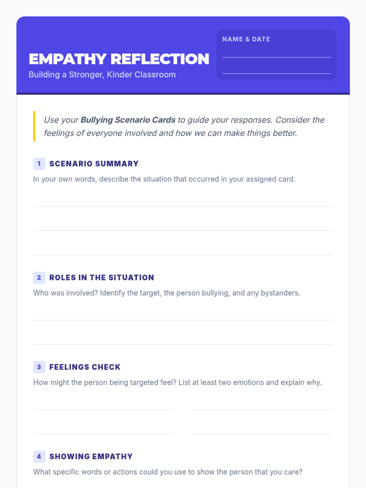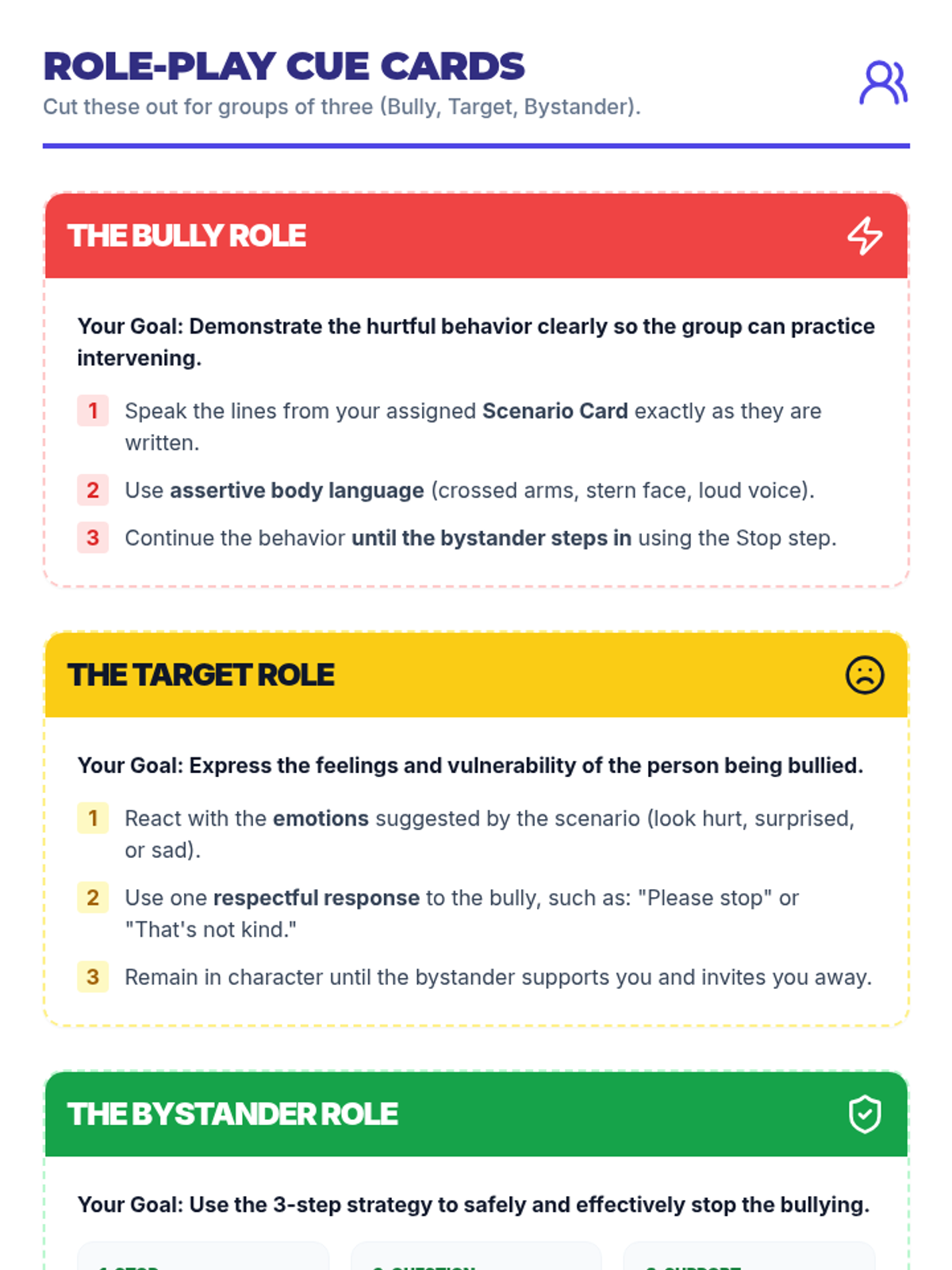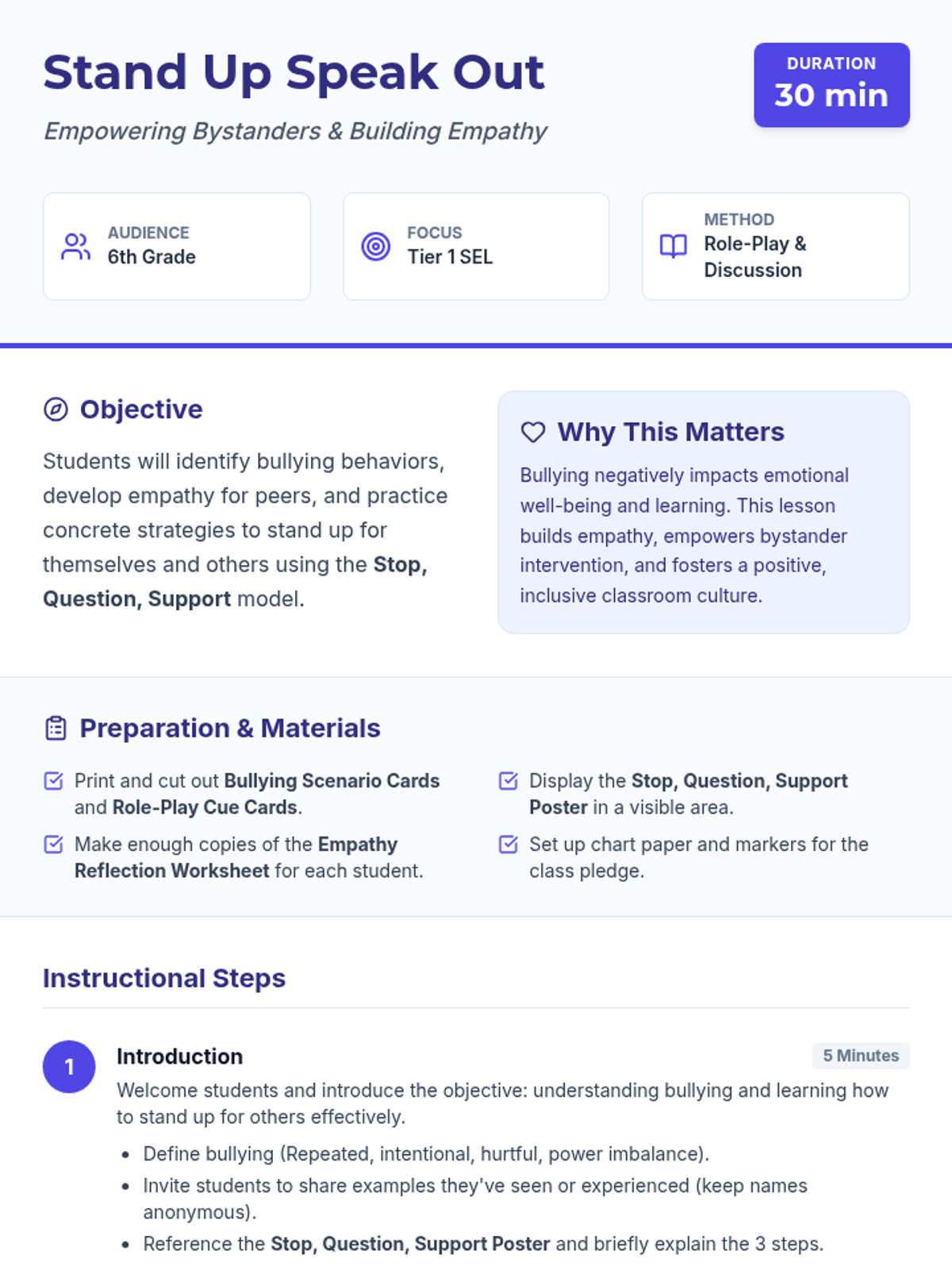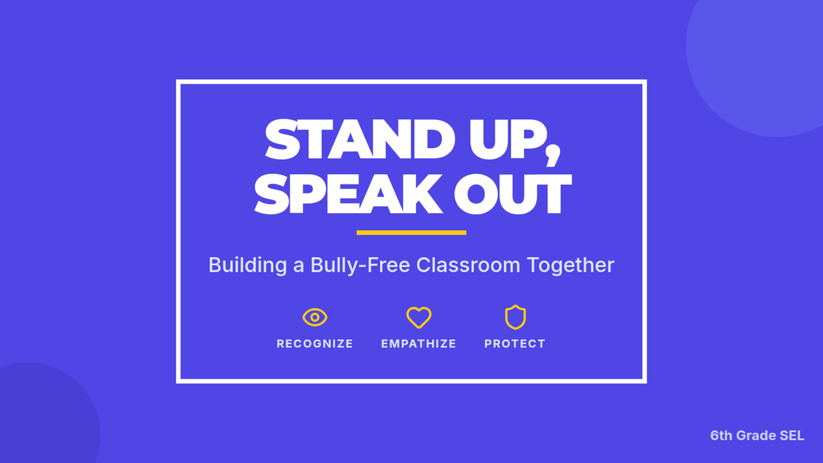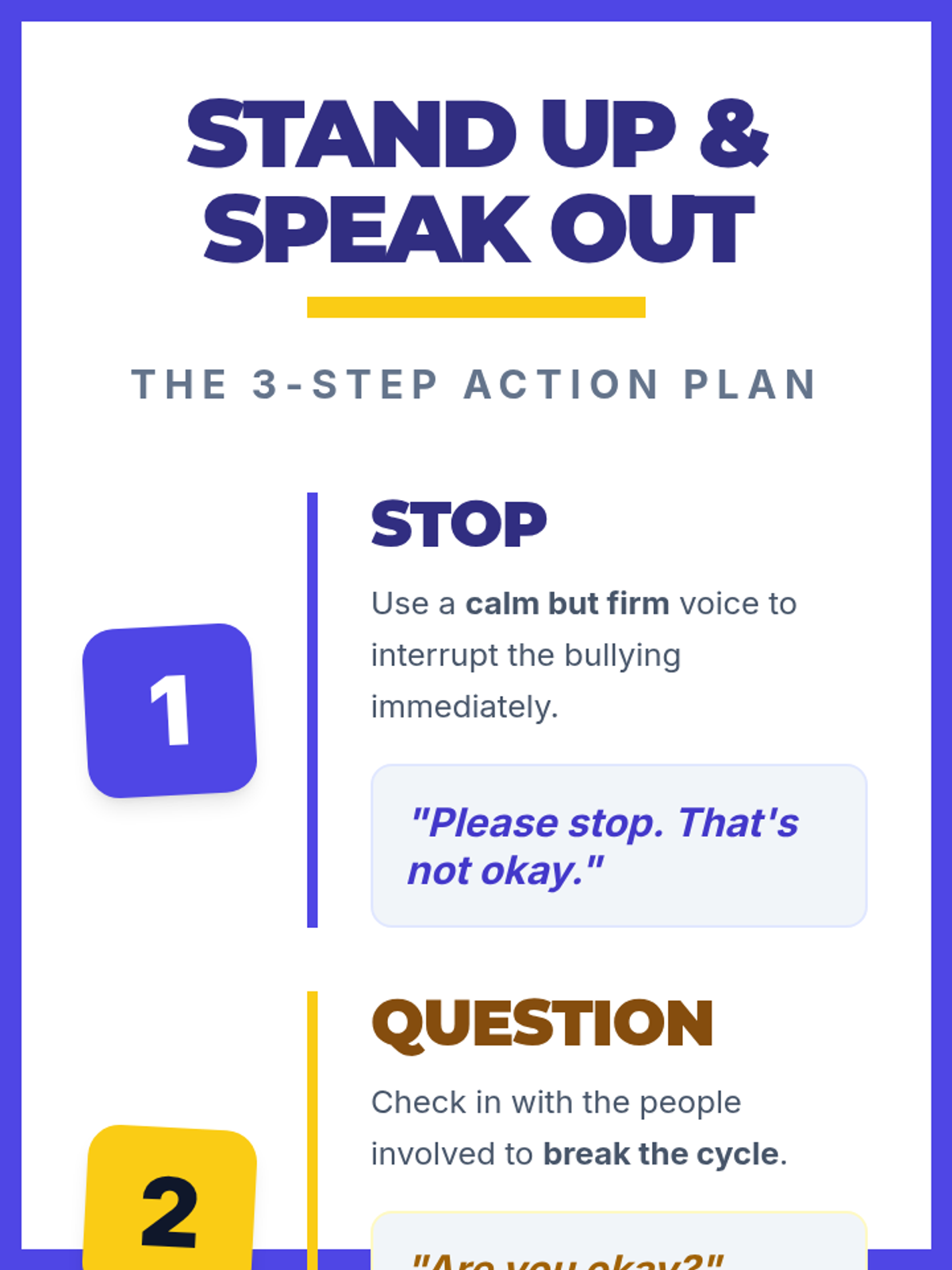 A 30-minute session empowering students to recognize bullying and use the 'Stop, Question, Support' strategy to foster a safe classroom environment.