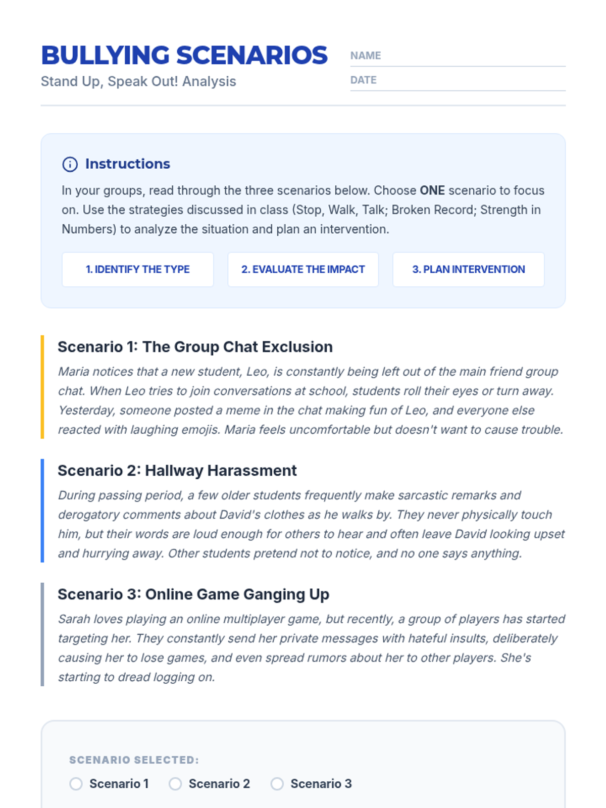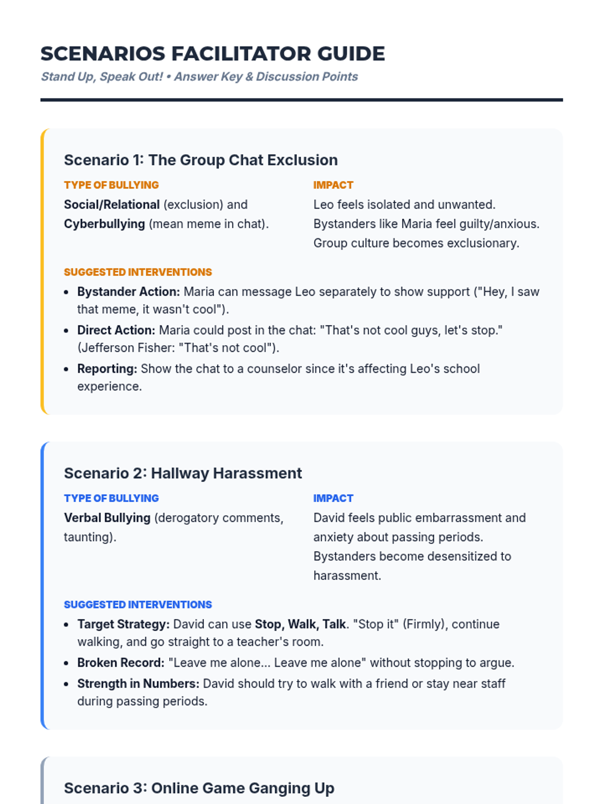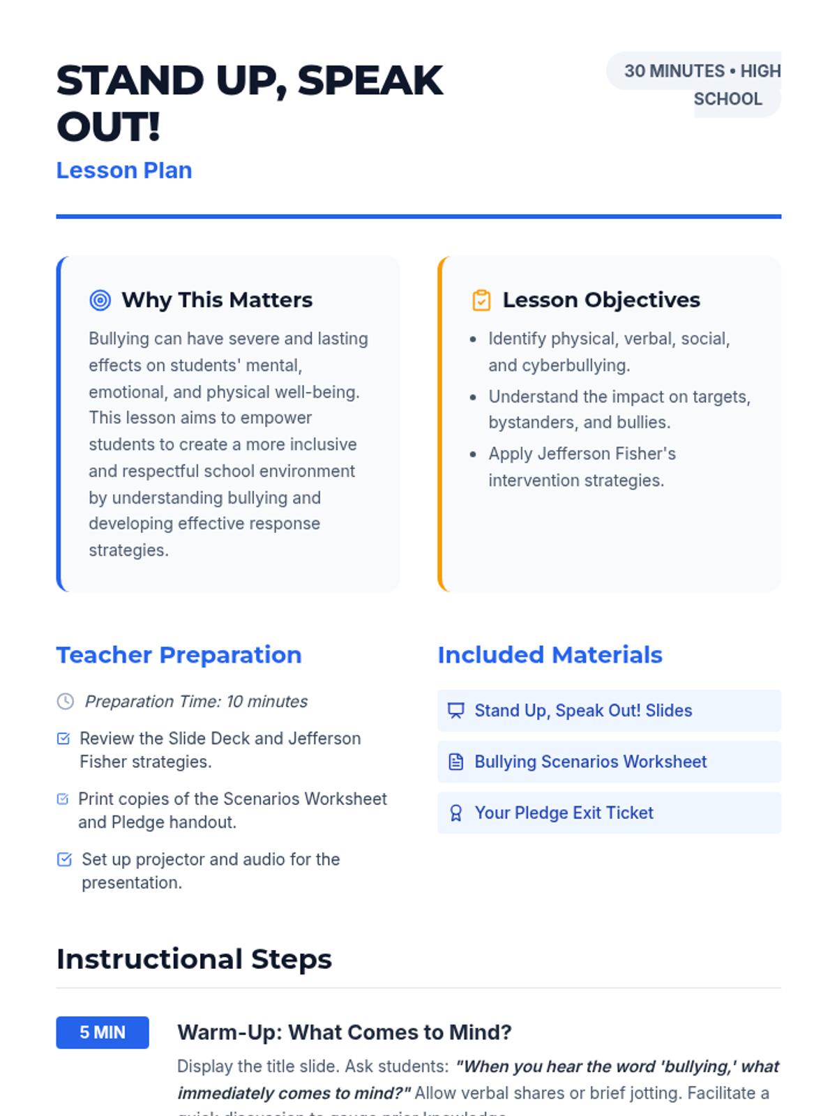 A 30-minute high school lesson focused on identifying bullying types, understanding their impact, and practicing intervention strategies using Jefferson Fisher's techniques.
