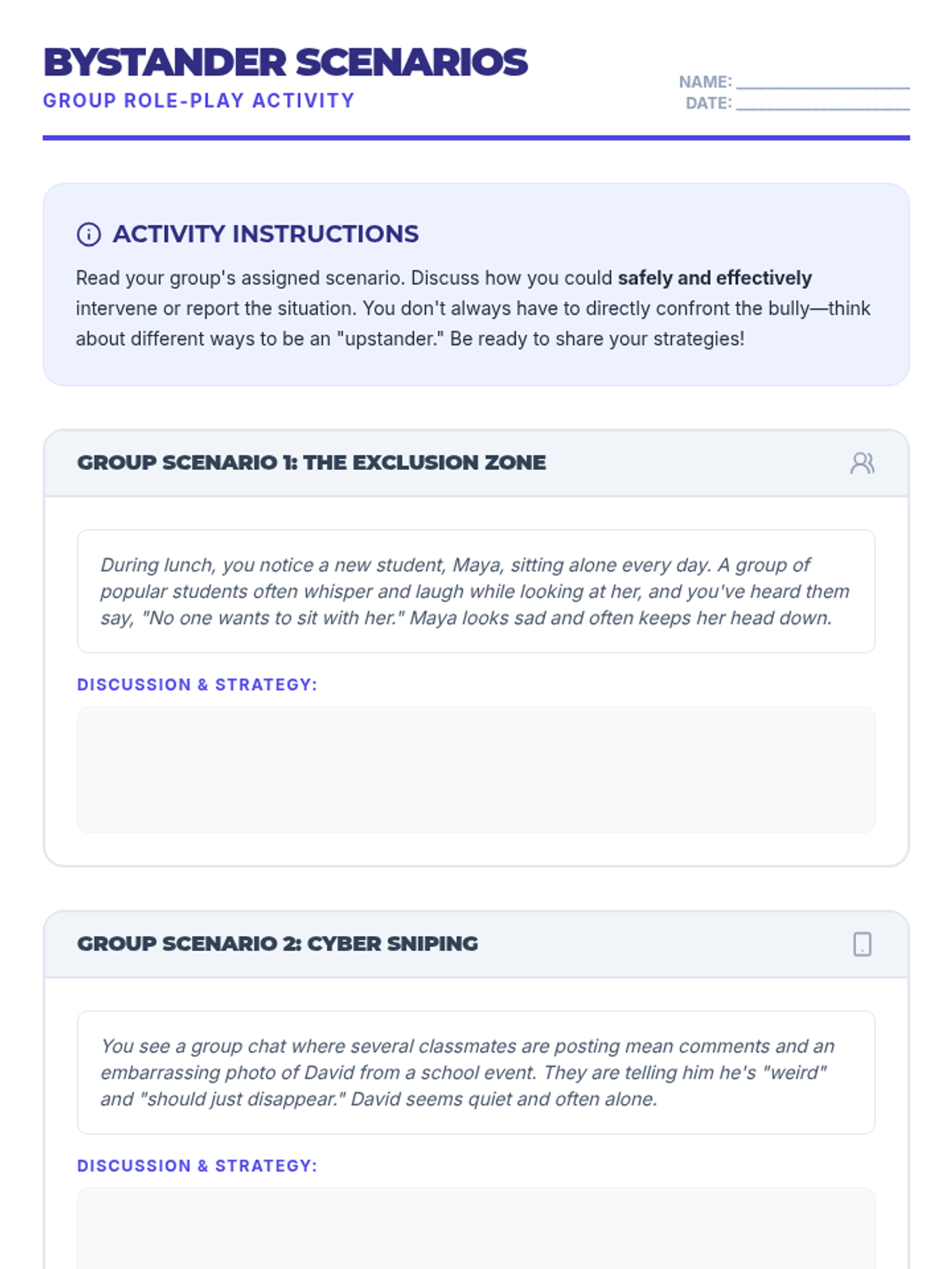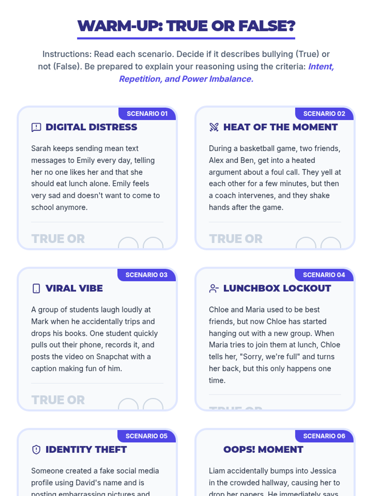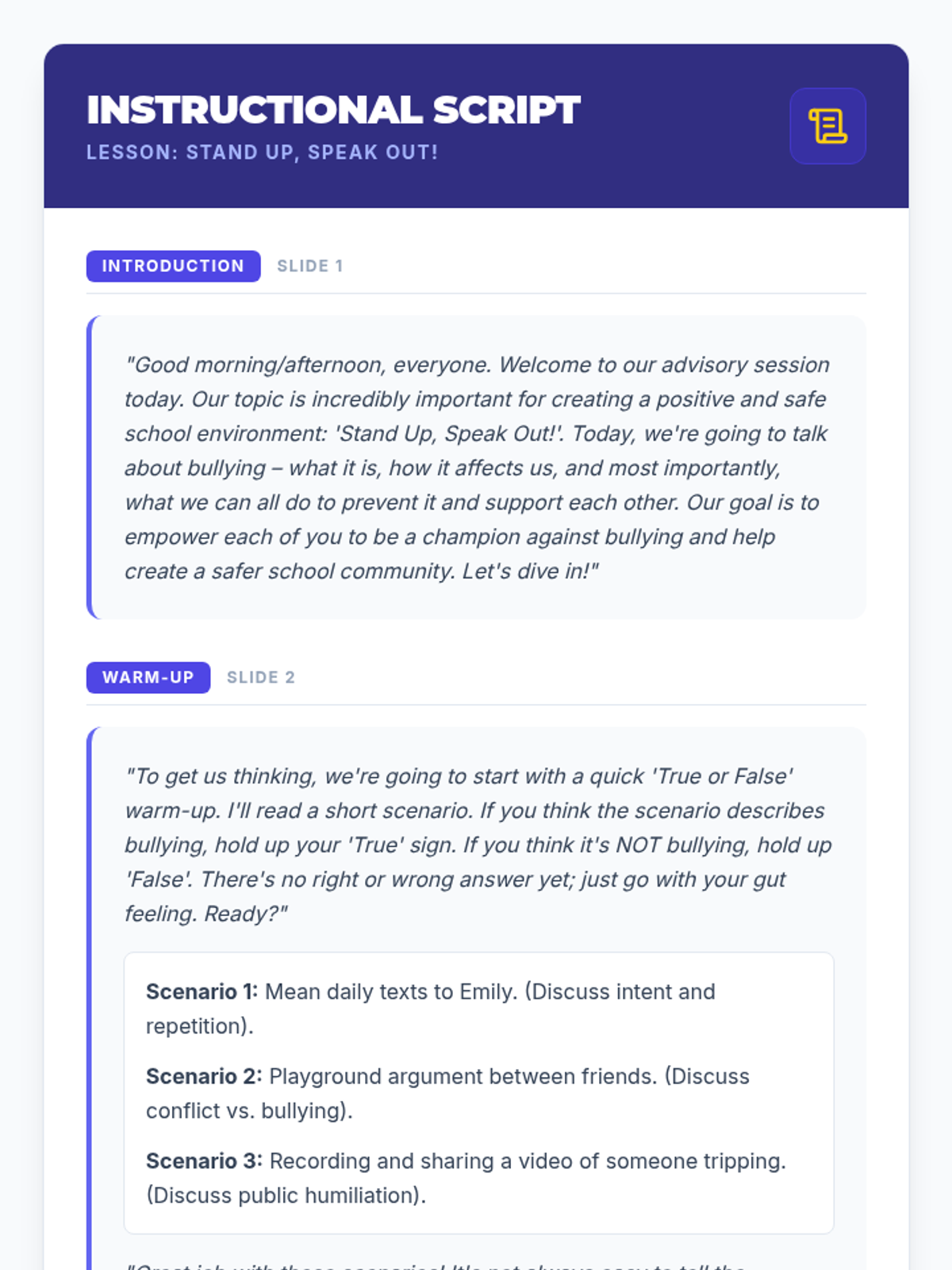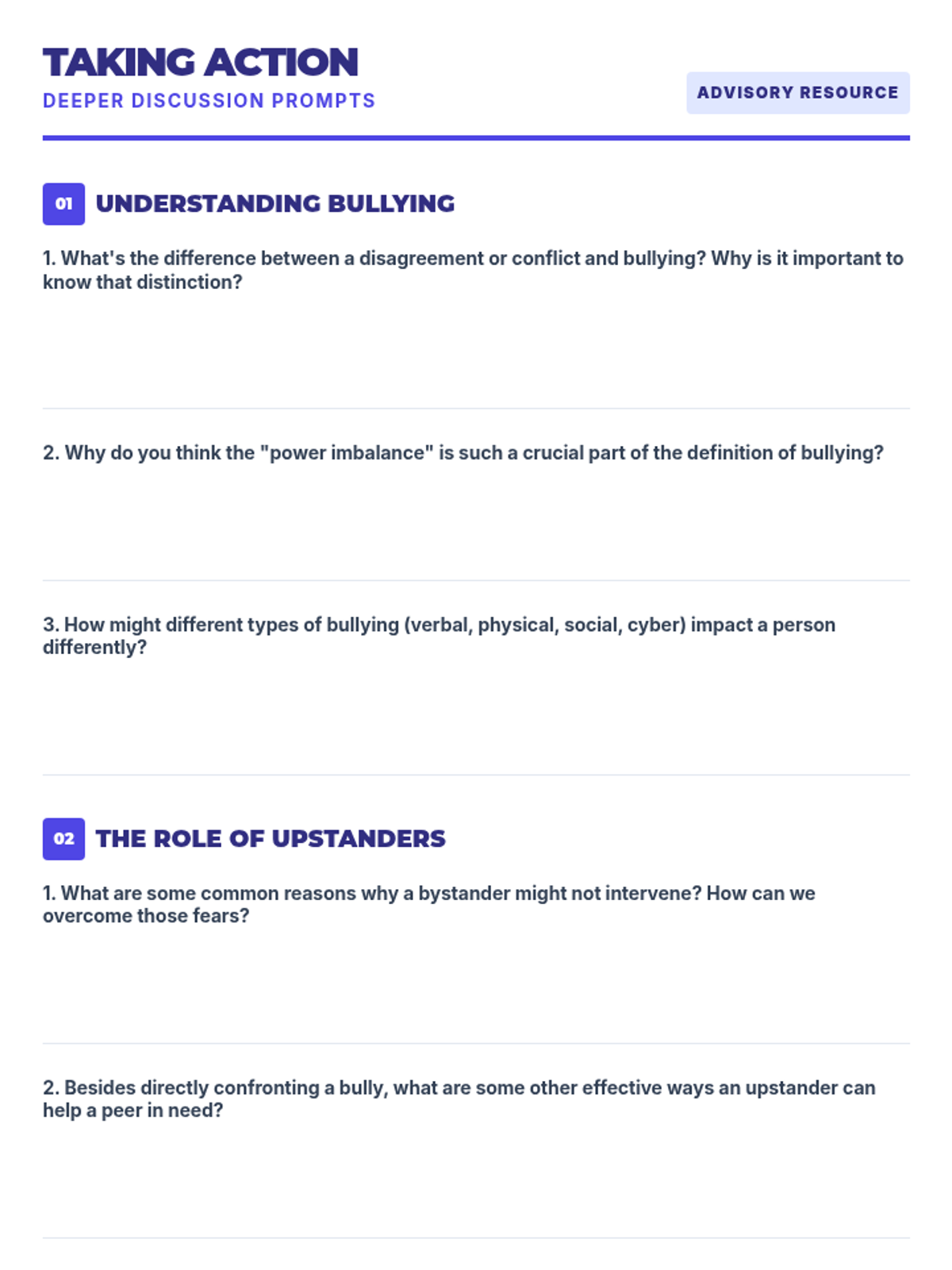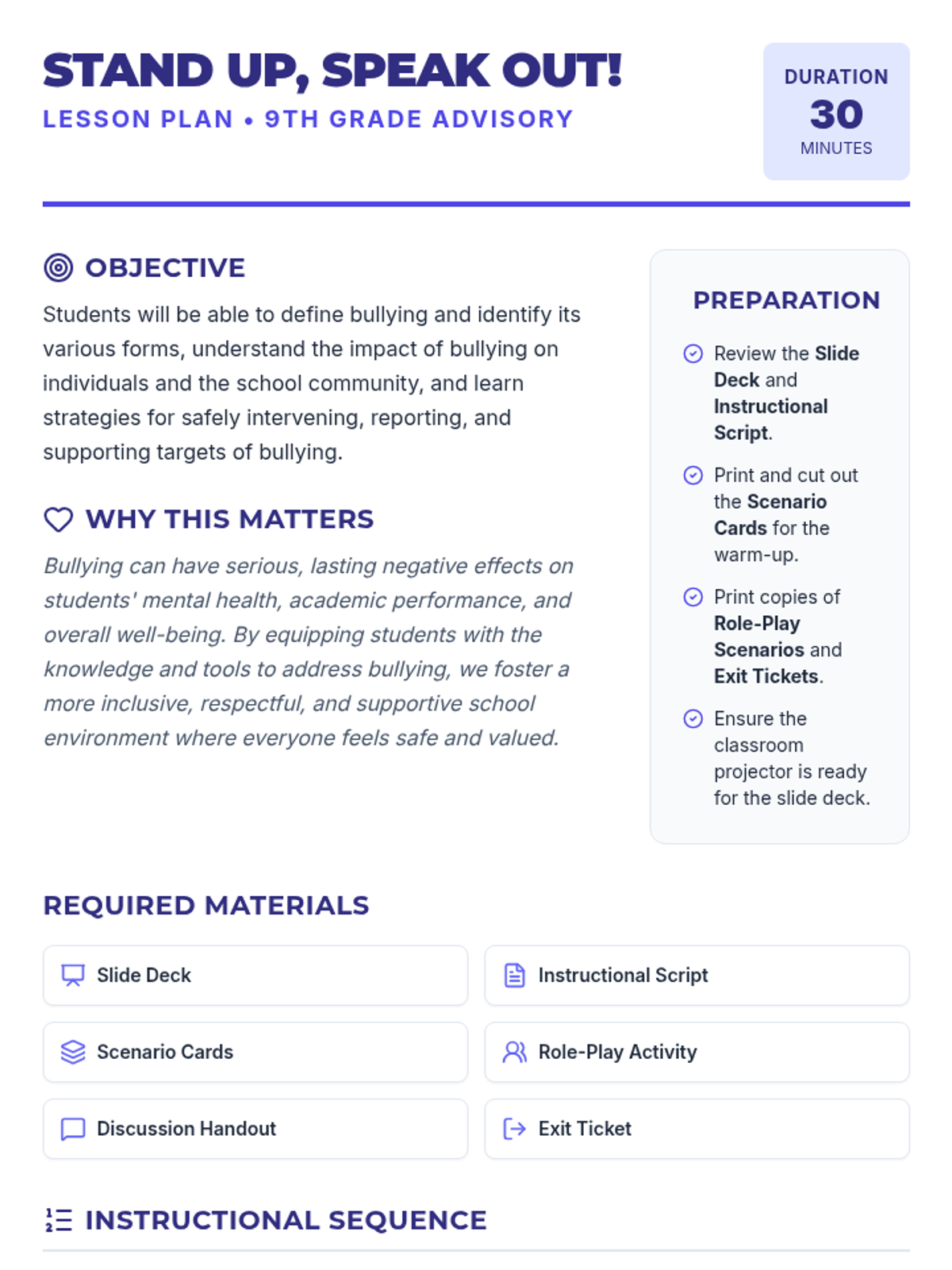 A 30-minute advisory lesson for 9th graders to recognize, respond to, and prevent bullying through empathy and bystander intervention.