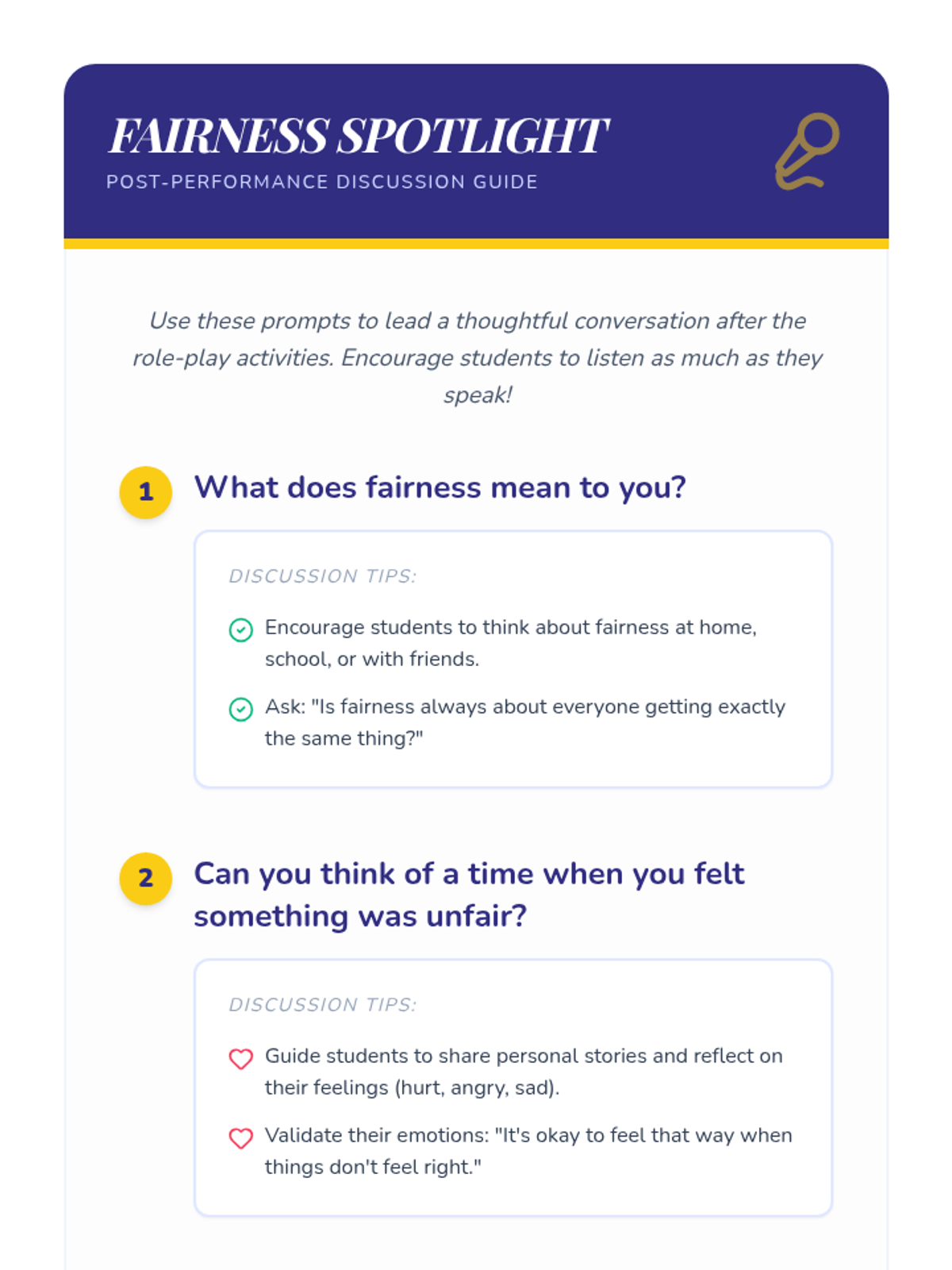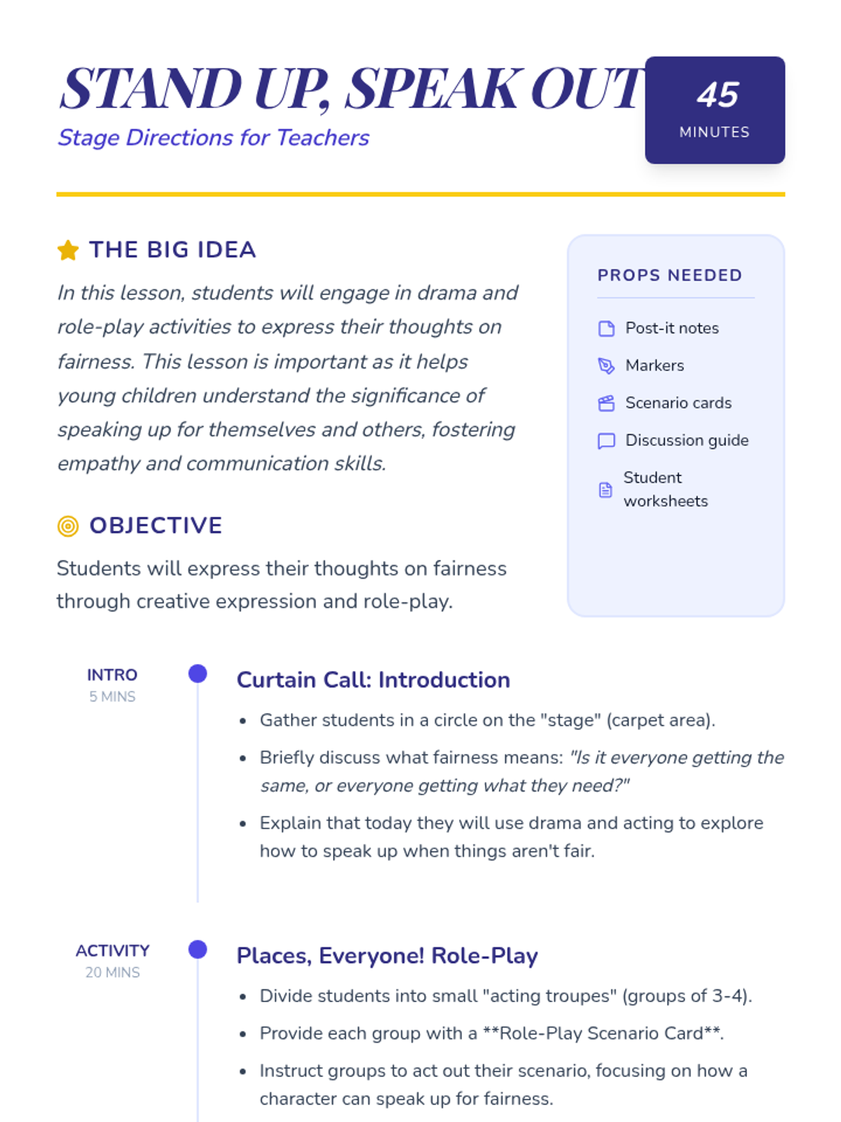 A drama-based lesson where students use role-play to explore concepts of fairness, empathy, and the importance of speaking up for themselves and others.