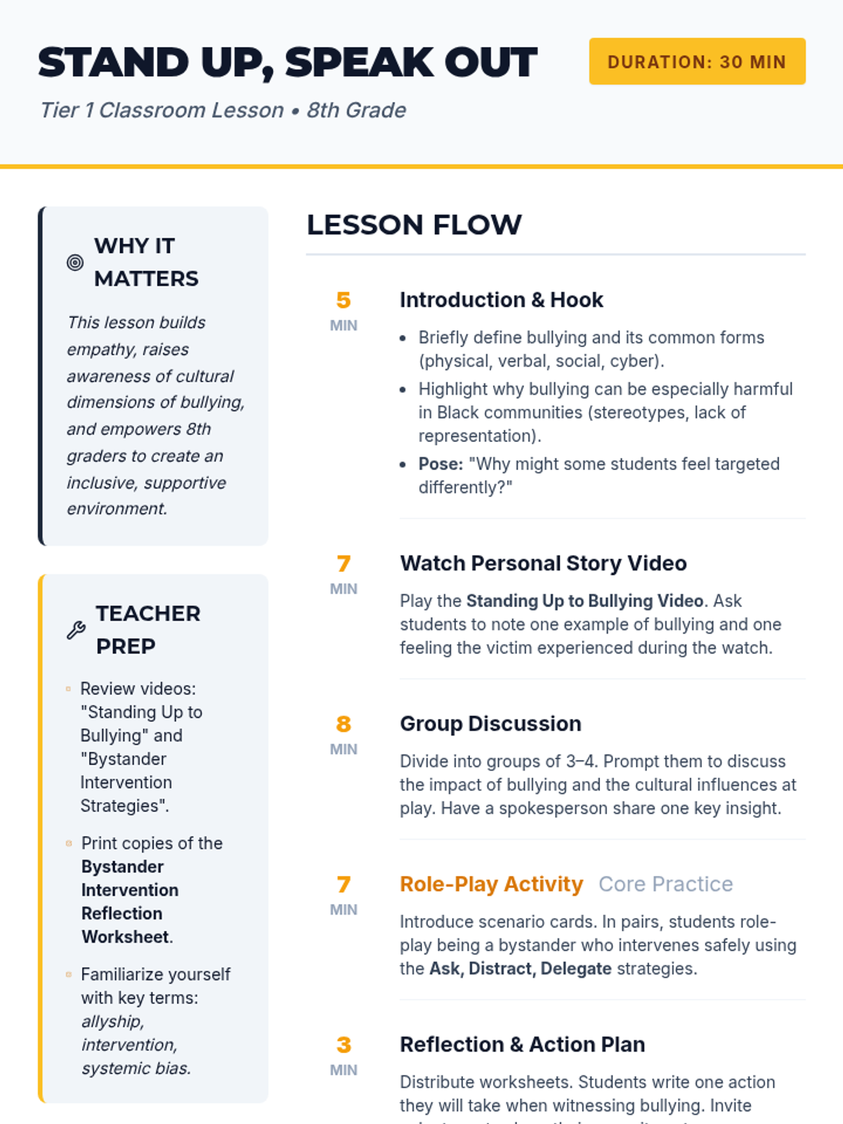 An 8th-grade Tier 1 lesson focused on understanding the impact of bullying, particularly in Black communities, and equipping students with bystander intervention strategies.