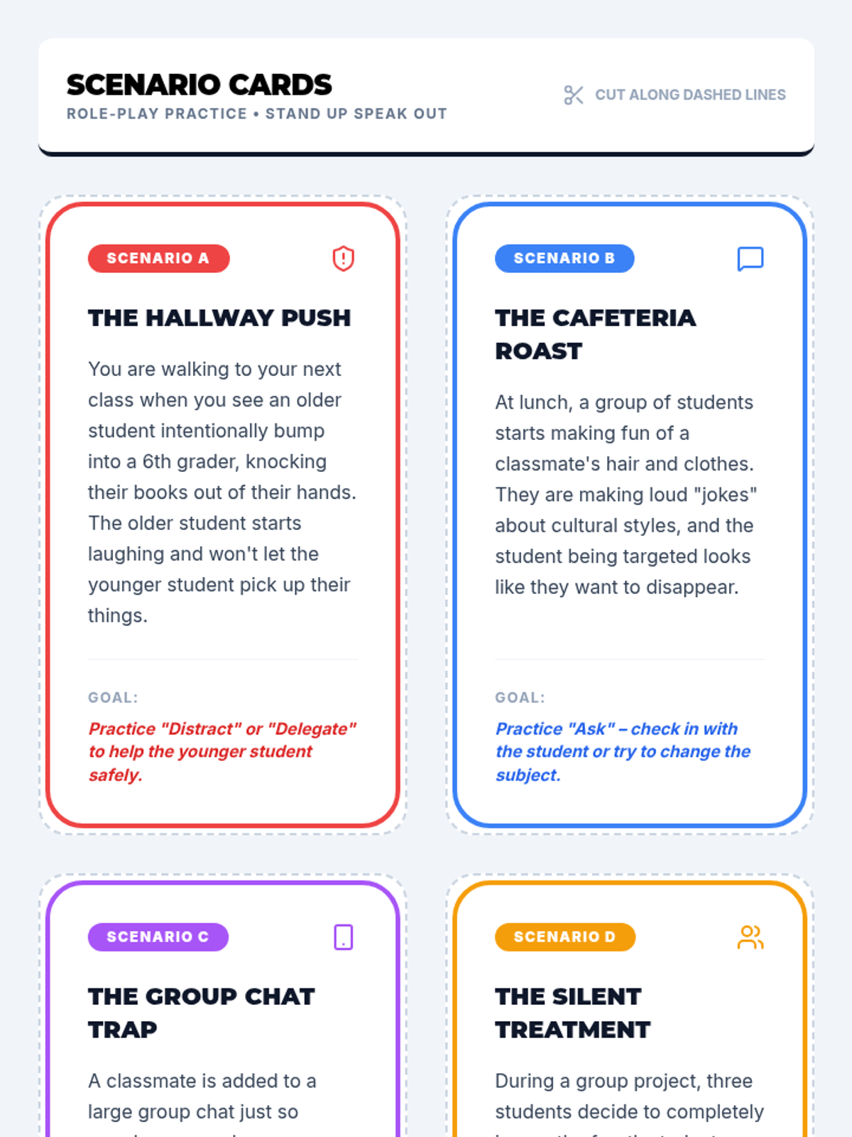 Identifies common 'blockers' like fear and procrastination, and uses role-play and discussion to build 'ninja' defense strategies.
