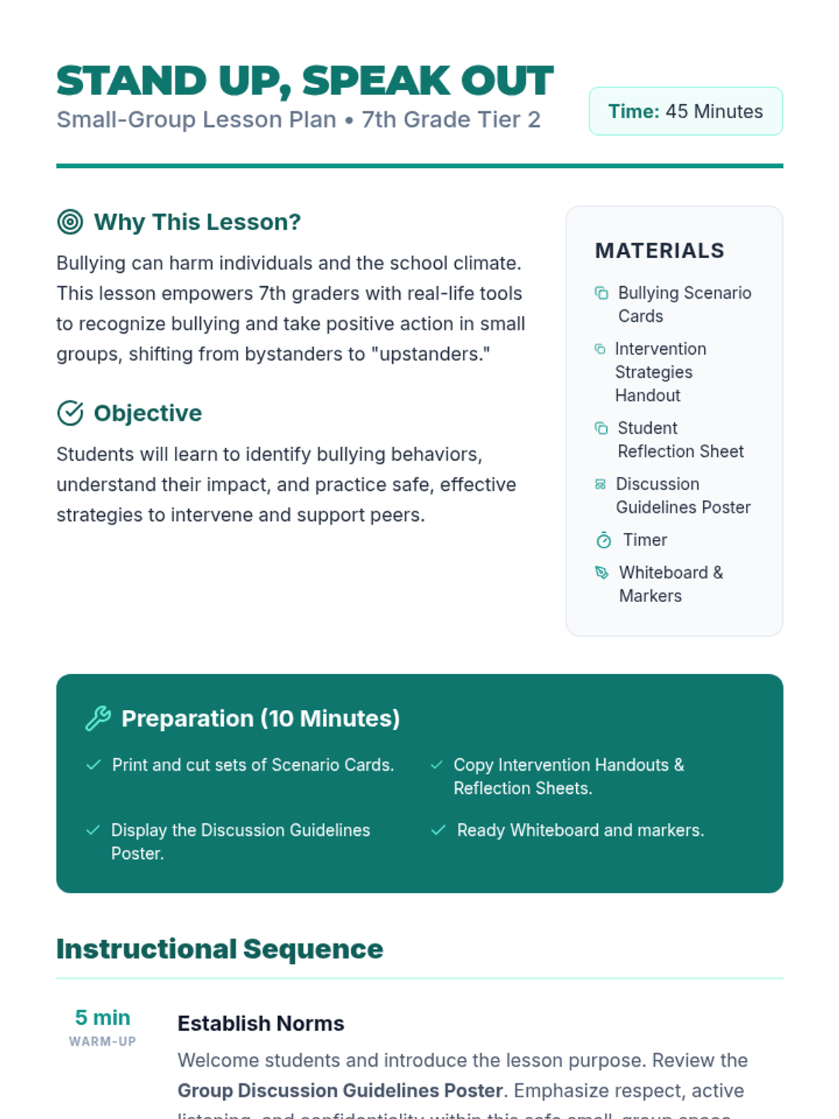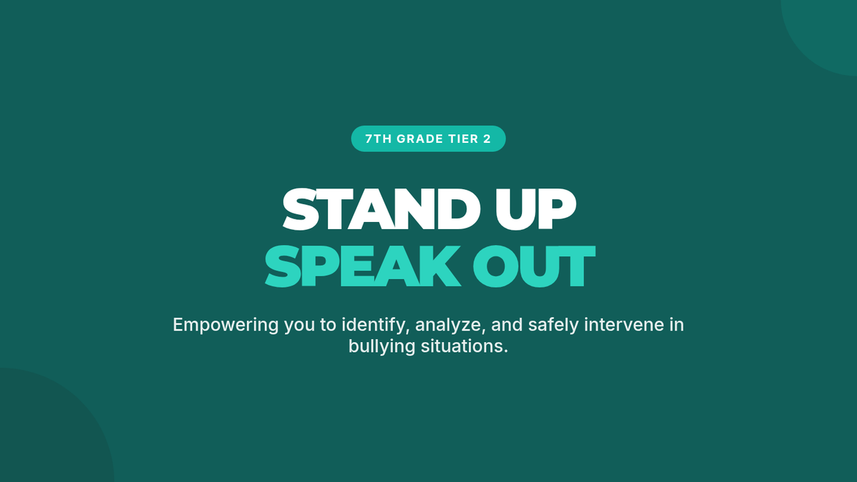 A 45-minute Tier 2 small-group lesson for 7th graders focused on identifying bullying behaviors and practicing safe intervention strategies to build a kinder school community.