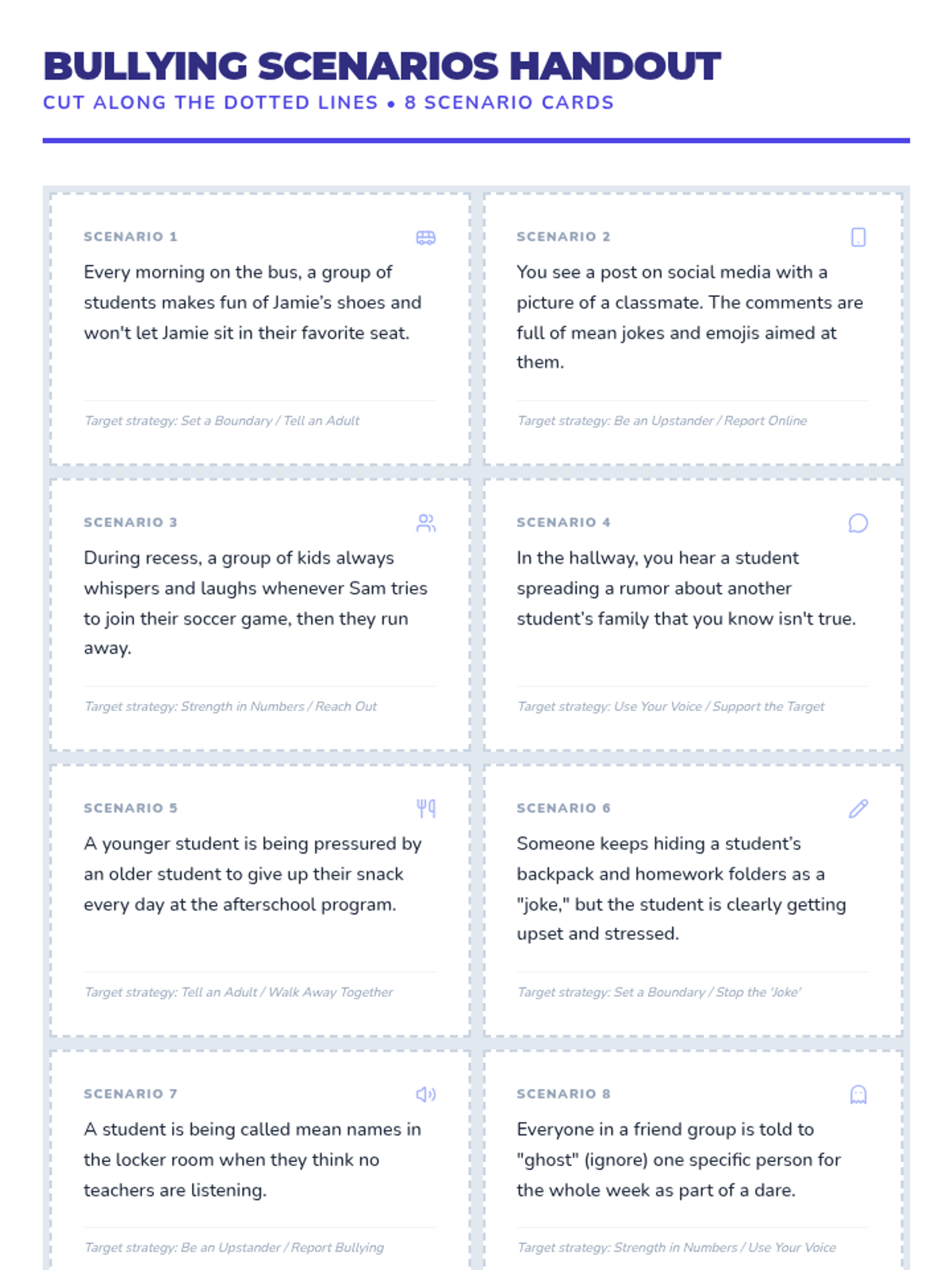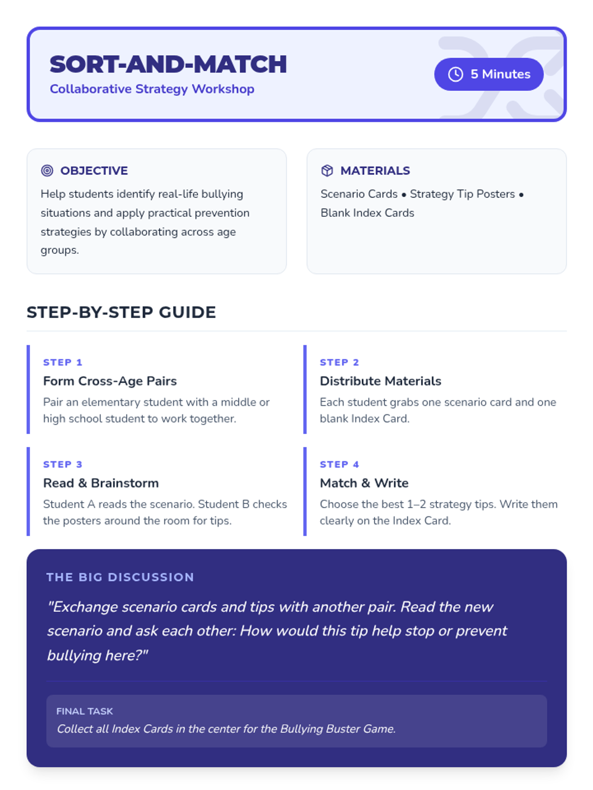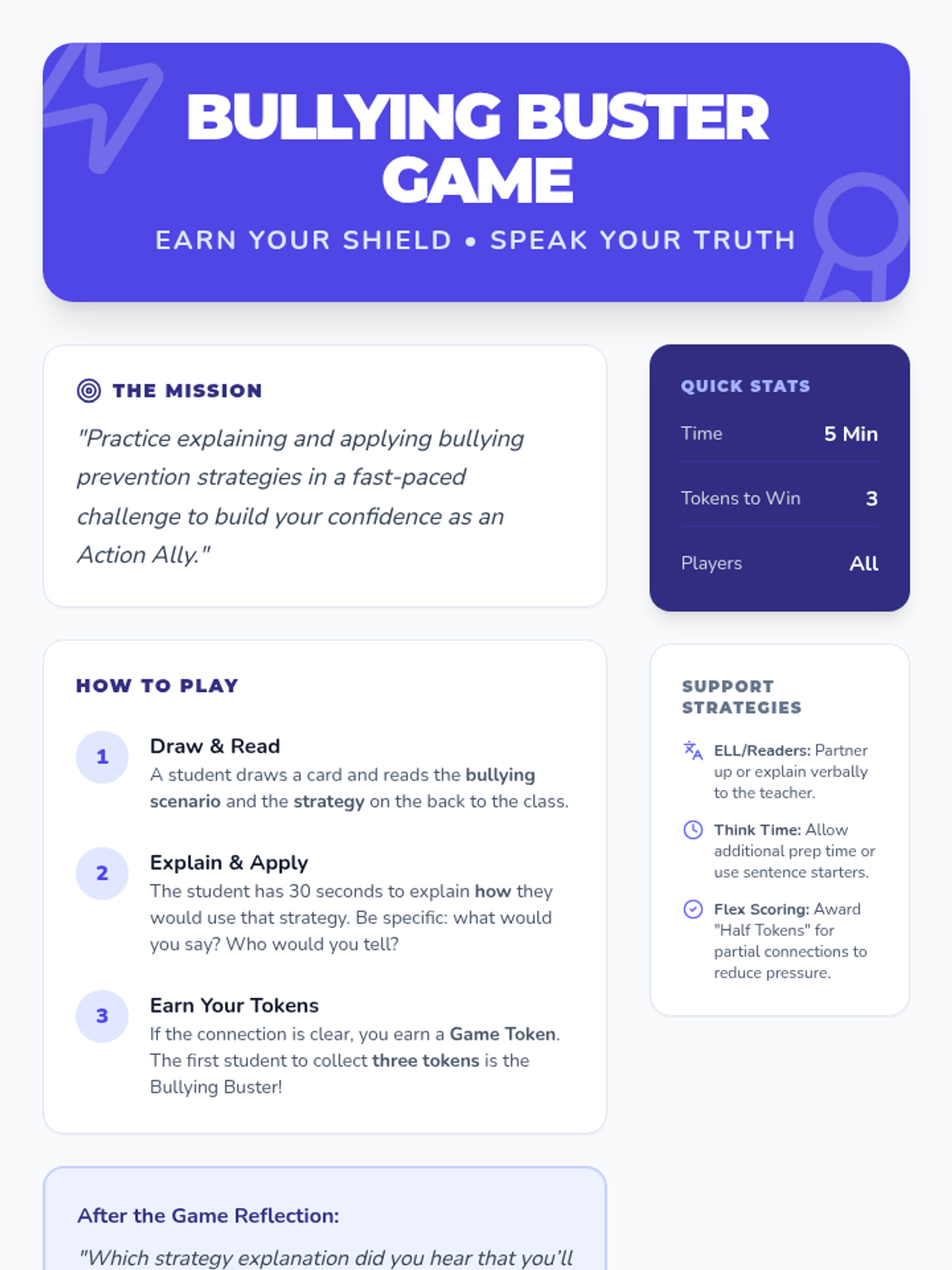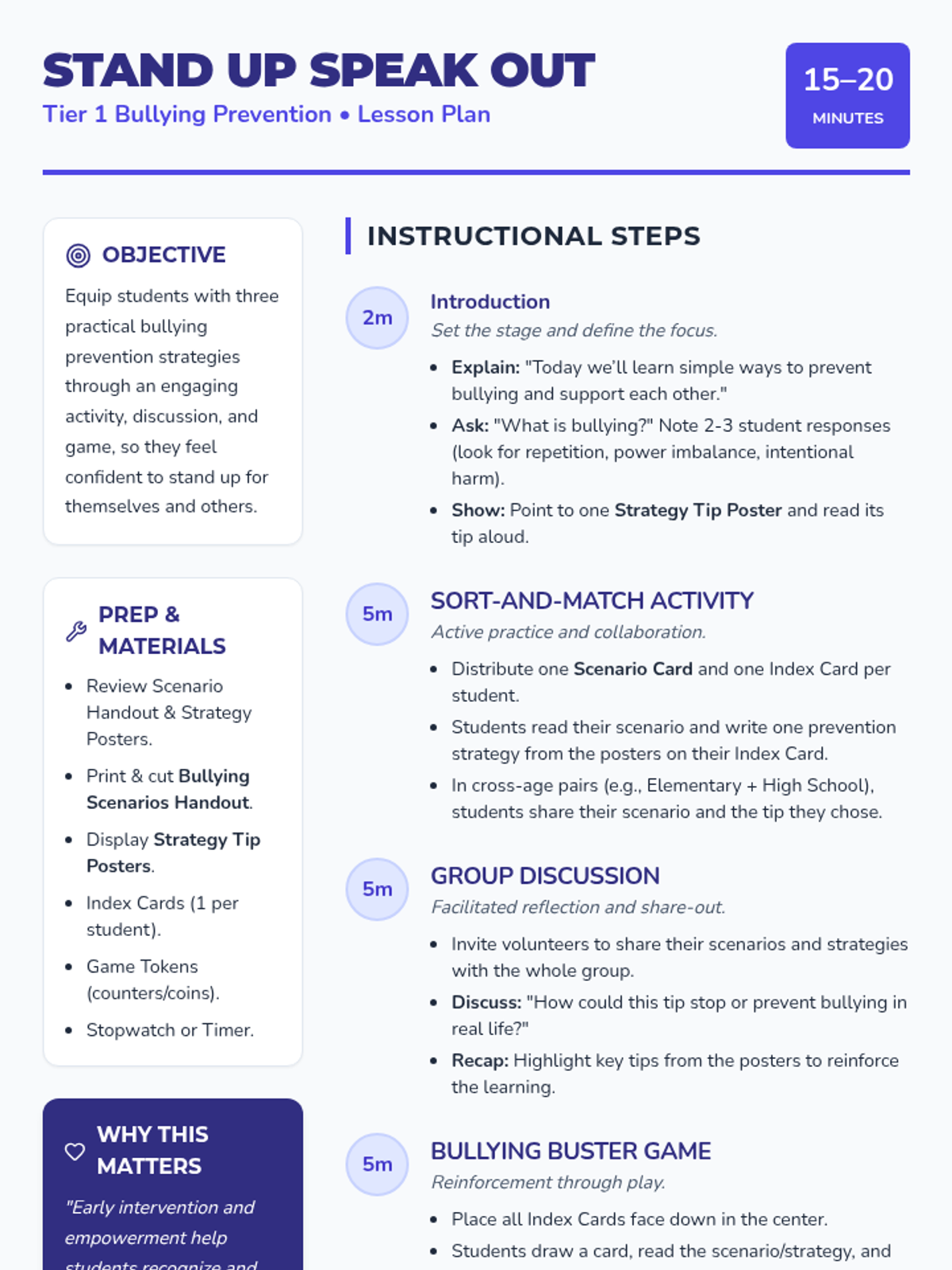 A fast-paced, 15-20 minute lesson designed to empower students of all ages with concrete strategies to prevent bullying and foster a supportive community through interactive games and discussion.