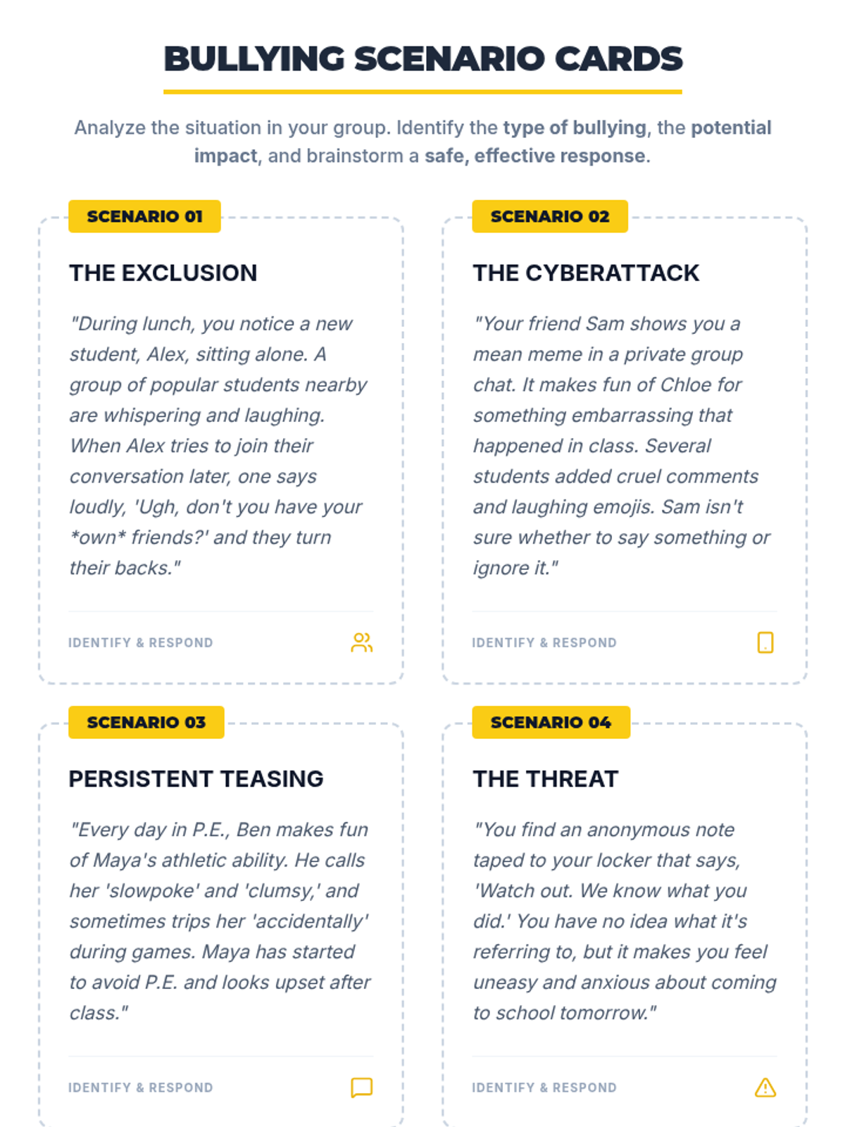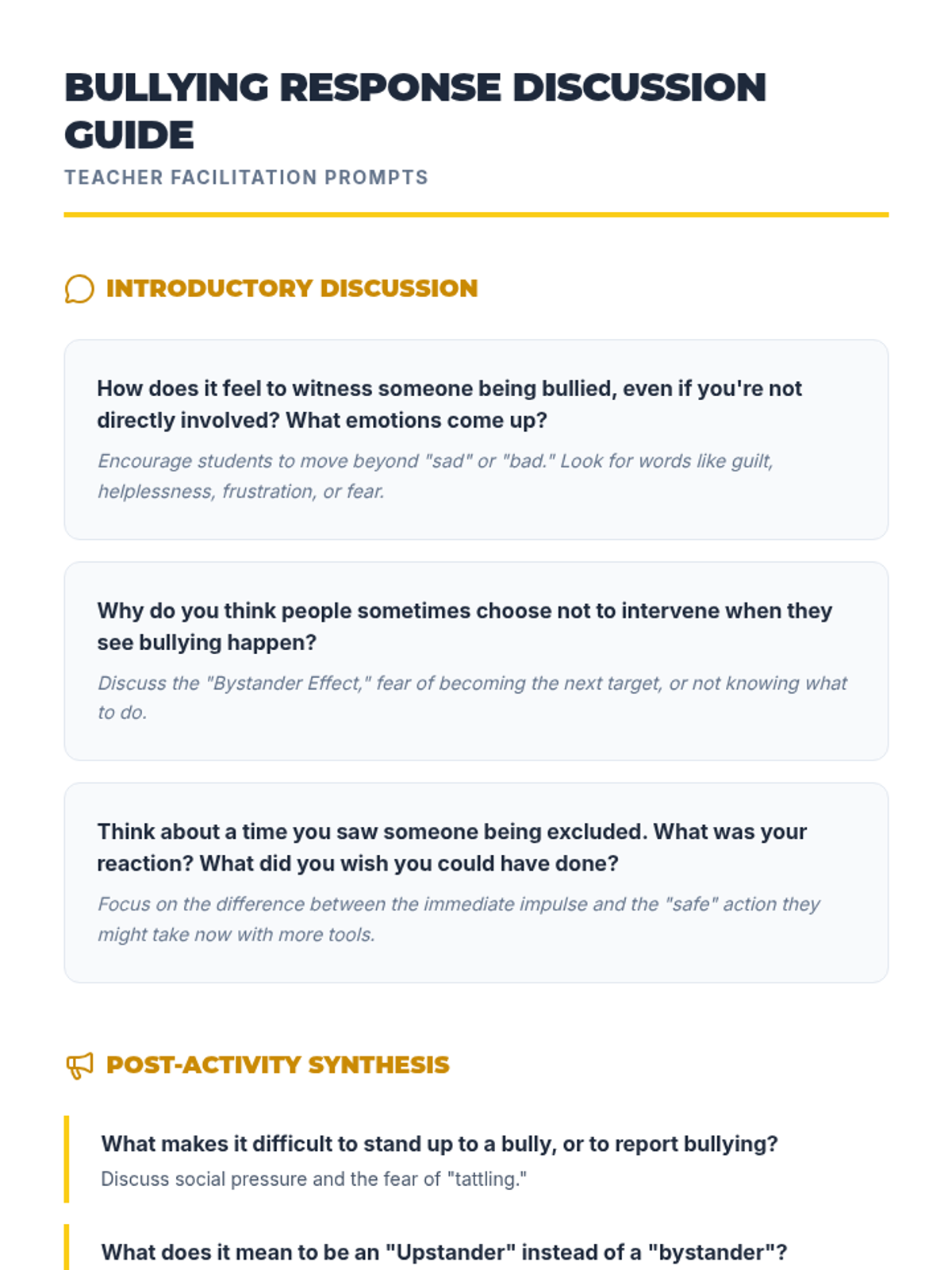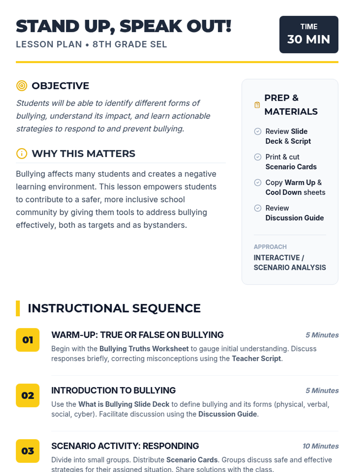 A 30-minute social-emotional learning lesson for 8th-grade students focused on recognizing, responding to, and preventing bullying to foster a safe school environment.