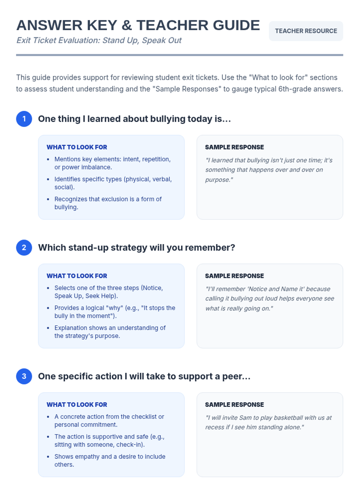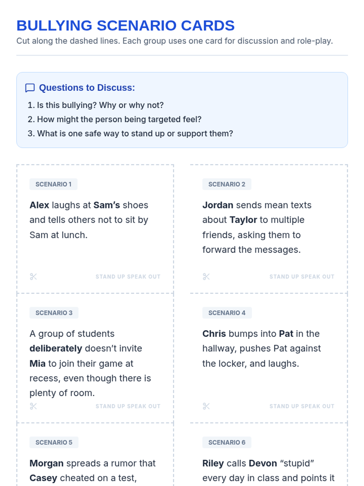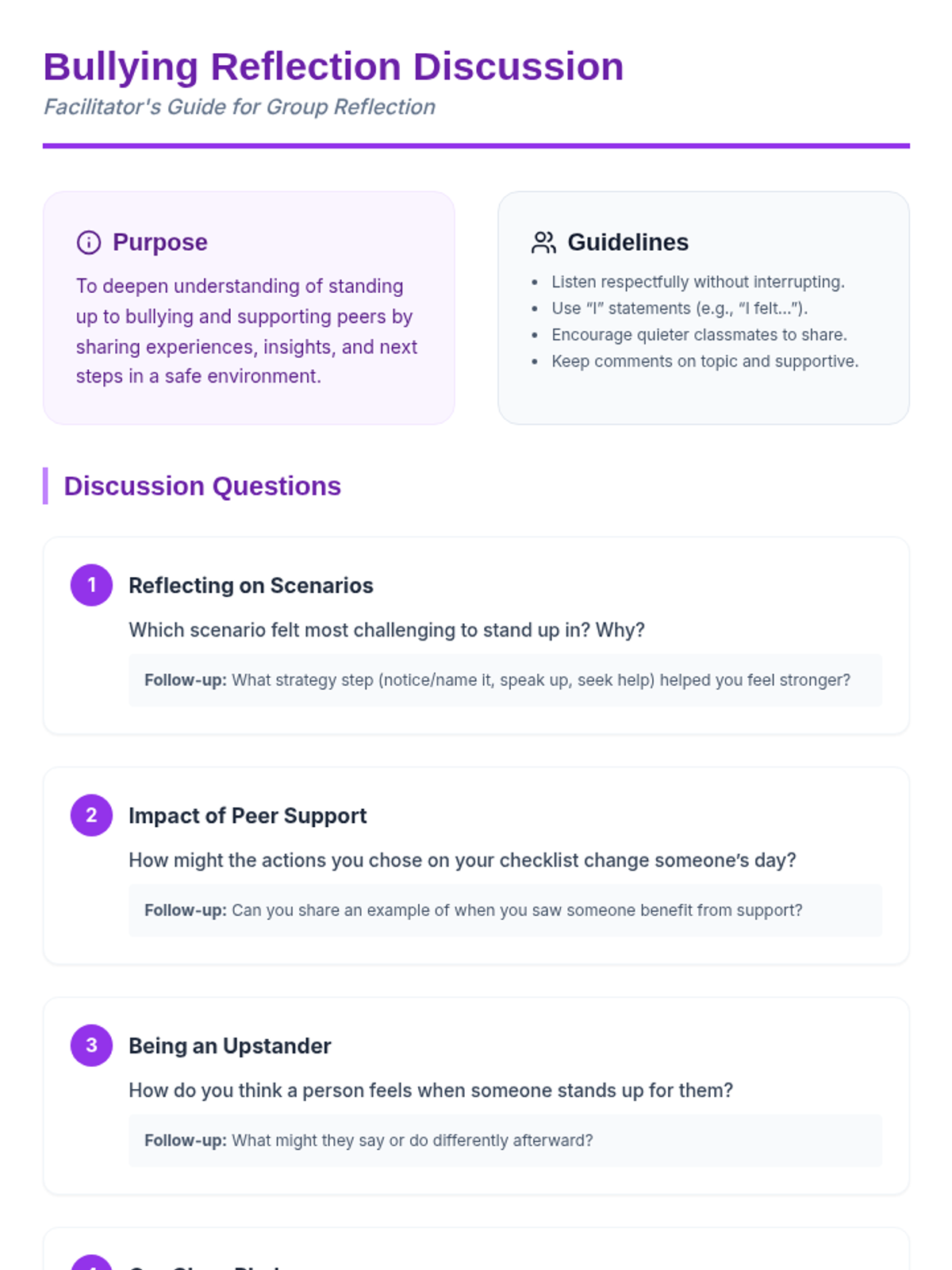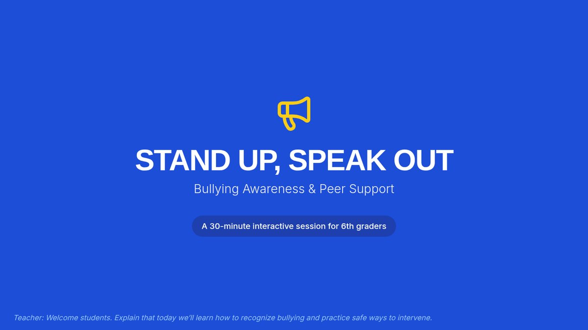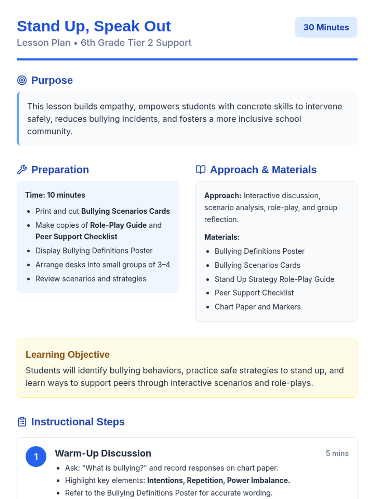 A 30-minute Tier 2 small-group session for sixth graders focused on identifying bullying, practicing intervention strategies, and supporting peers to foster an inclusive school culture.