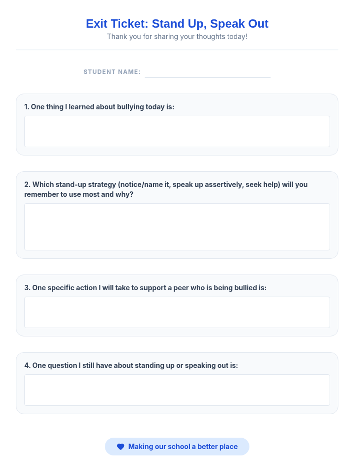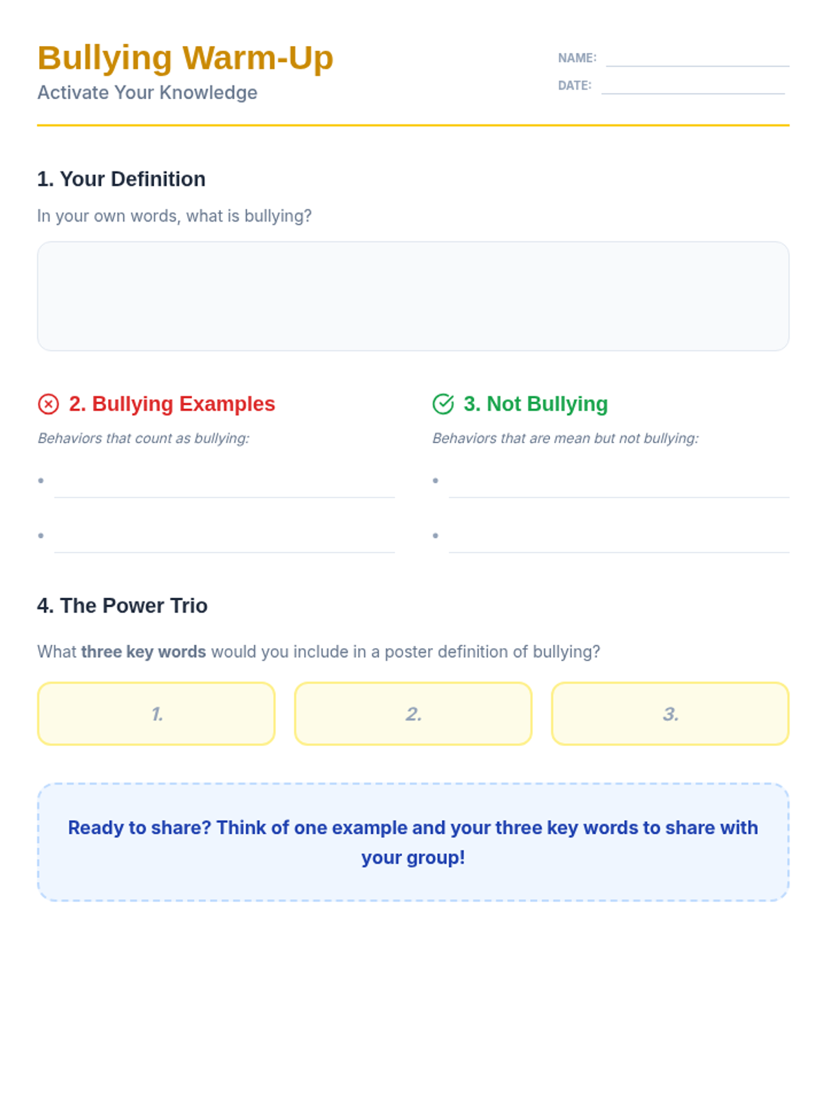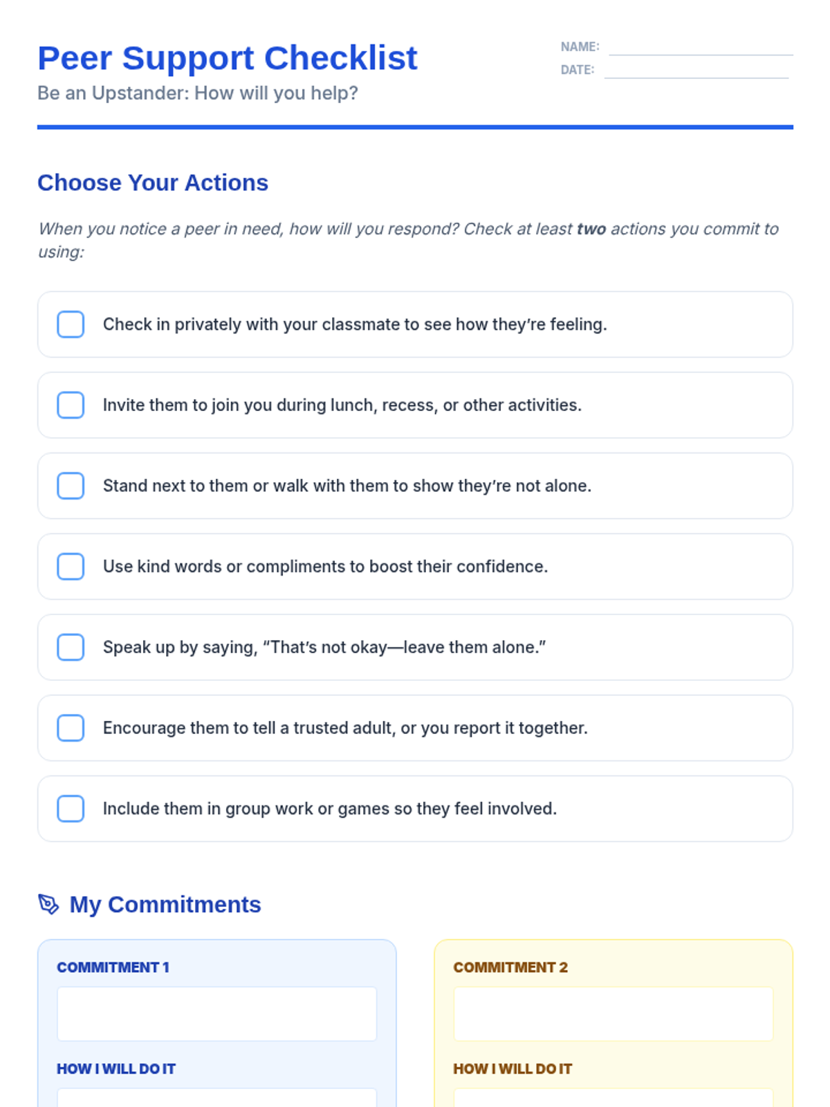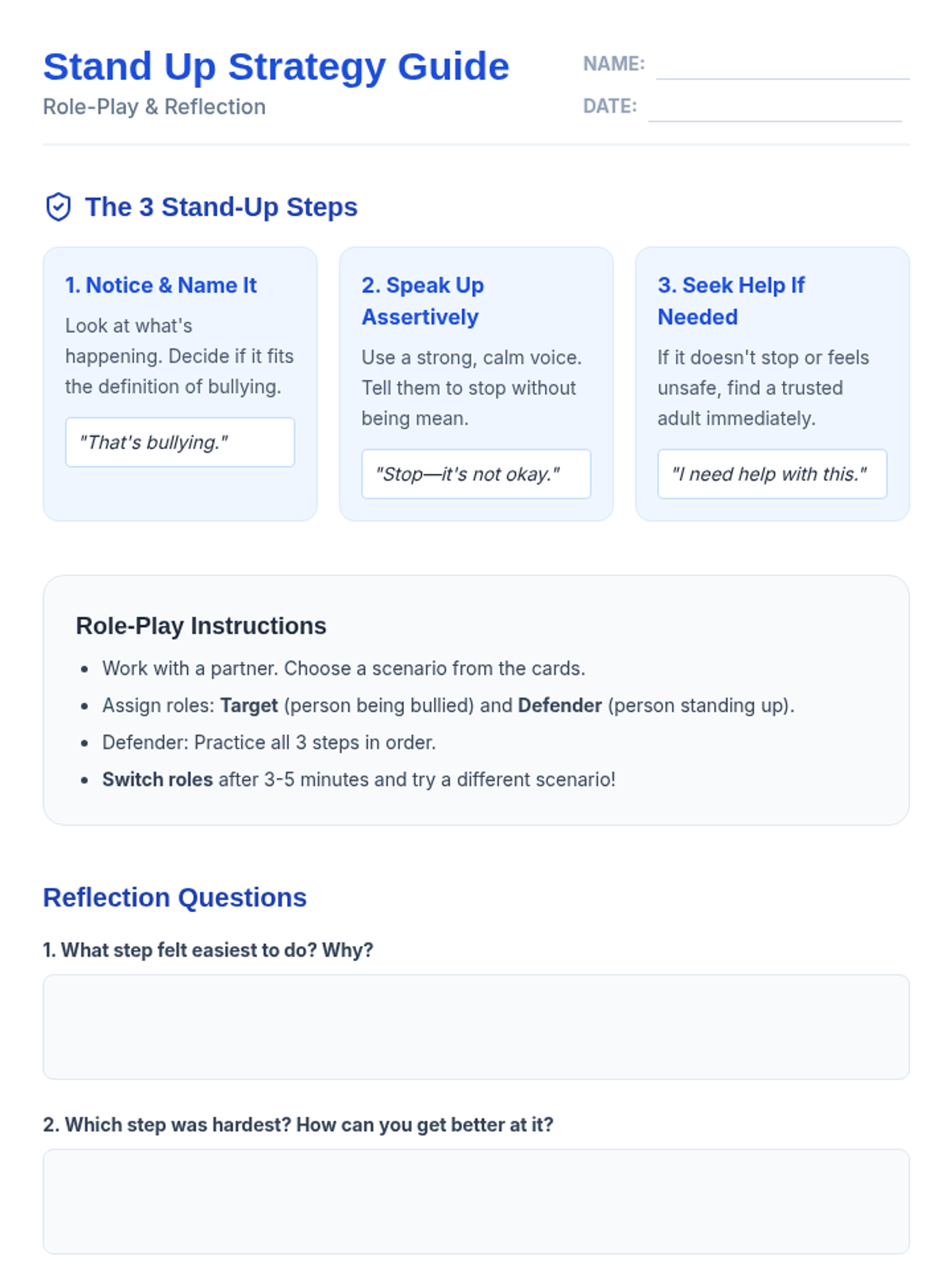 A 30-minute Tier 2 small-group session for sixth graders focused on identifying bullying, practicing intervention strategies, and supporting peers to foster an inclusive school culture.