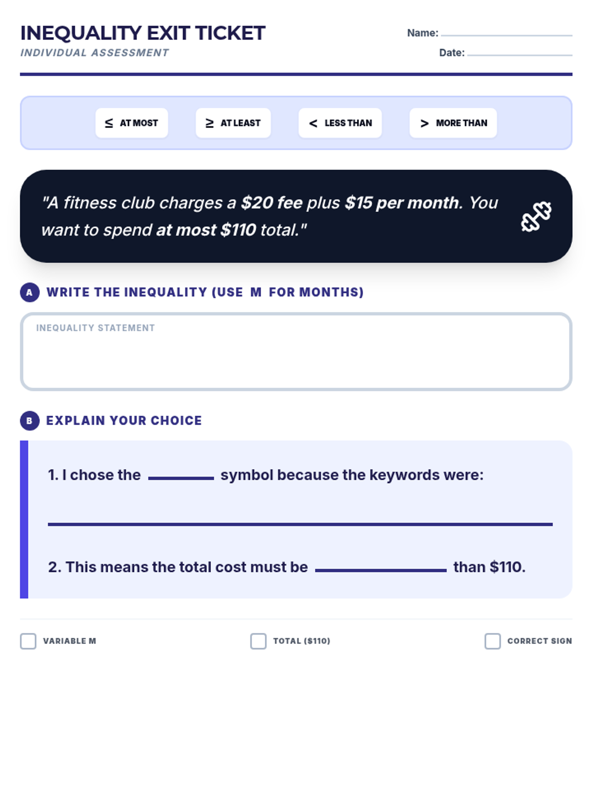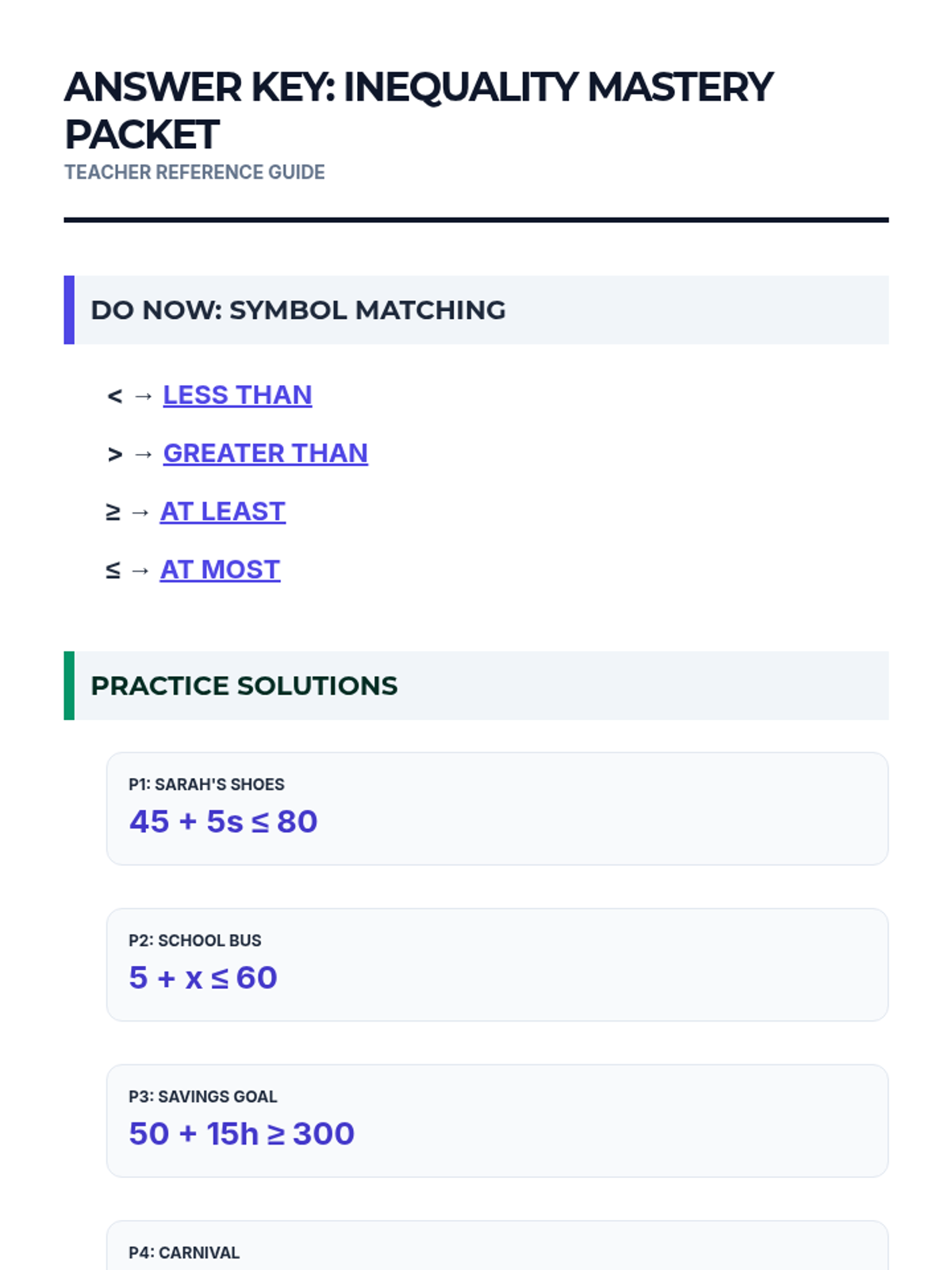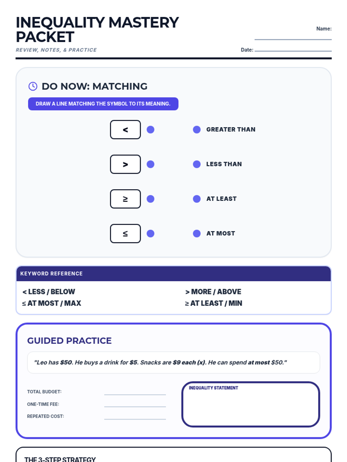 A scaffolded practice lesson for 9th and 10th-grade special education students to reinforce writing linear inequalities from word problems. The lesson includes a review of keyword signals, guided translation steps, and independent practice with real-world scenarios.