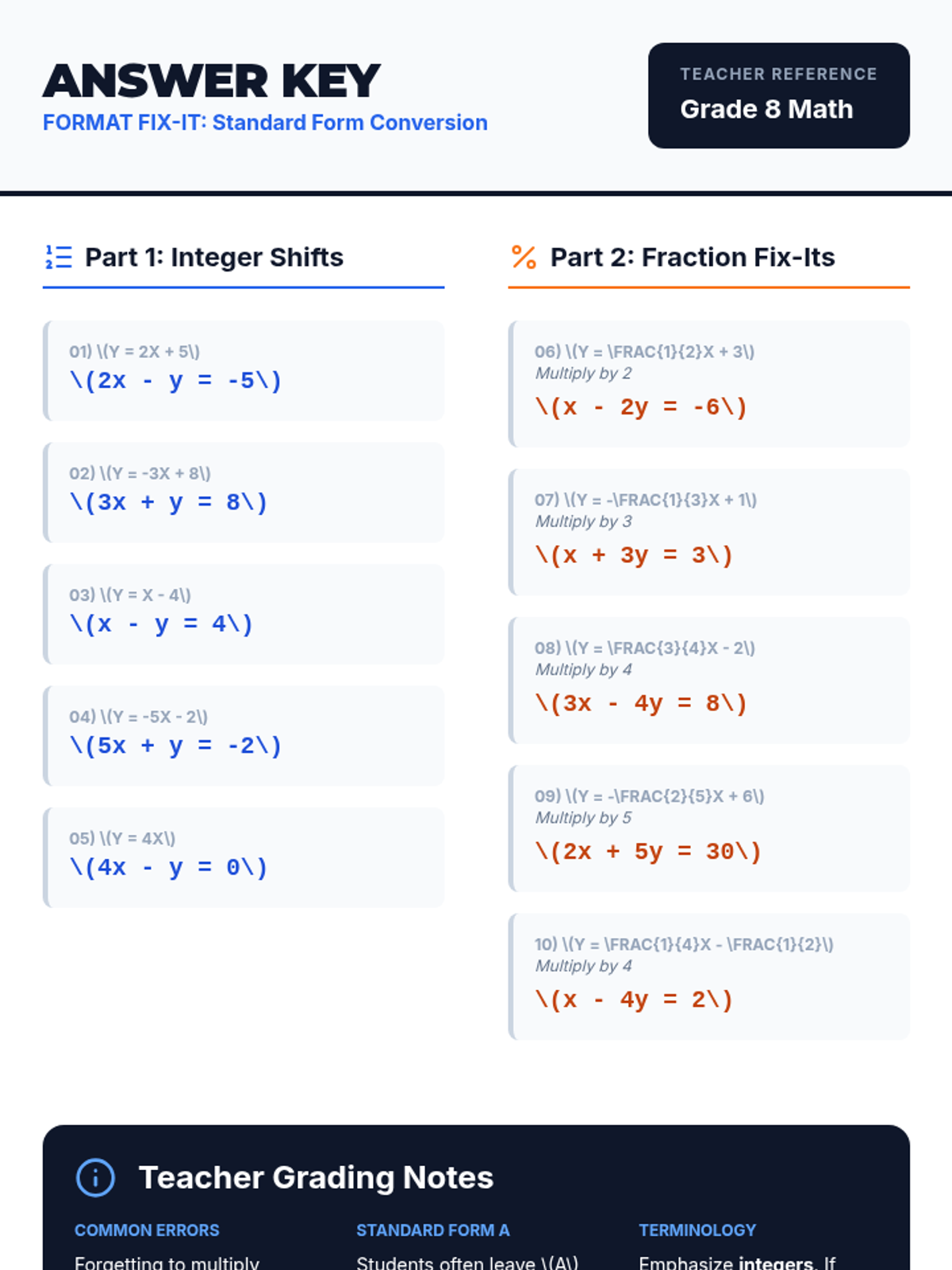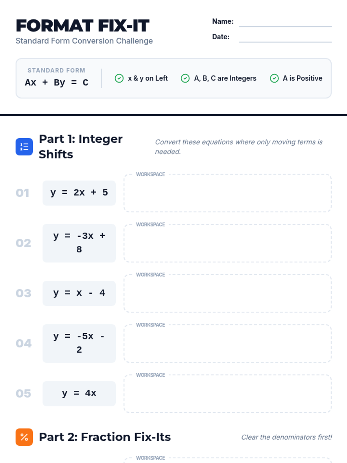 Students will learn to identify and convert linear equations into Standard Form ($Ax + By = C$) by applying three specific rules: placing variables on one side, ensuring integer coefficients, and maintaining a positive leading coefficient.