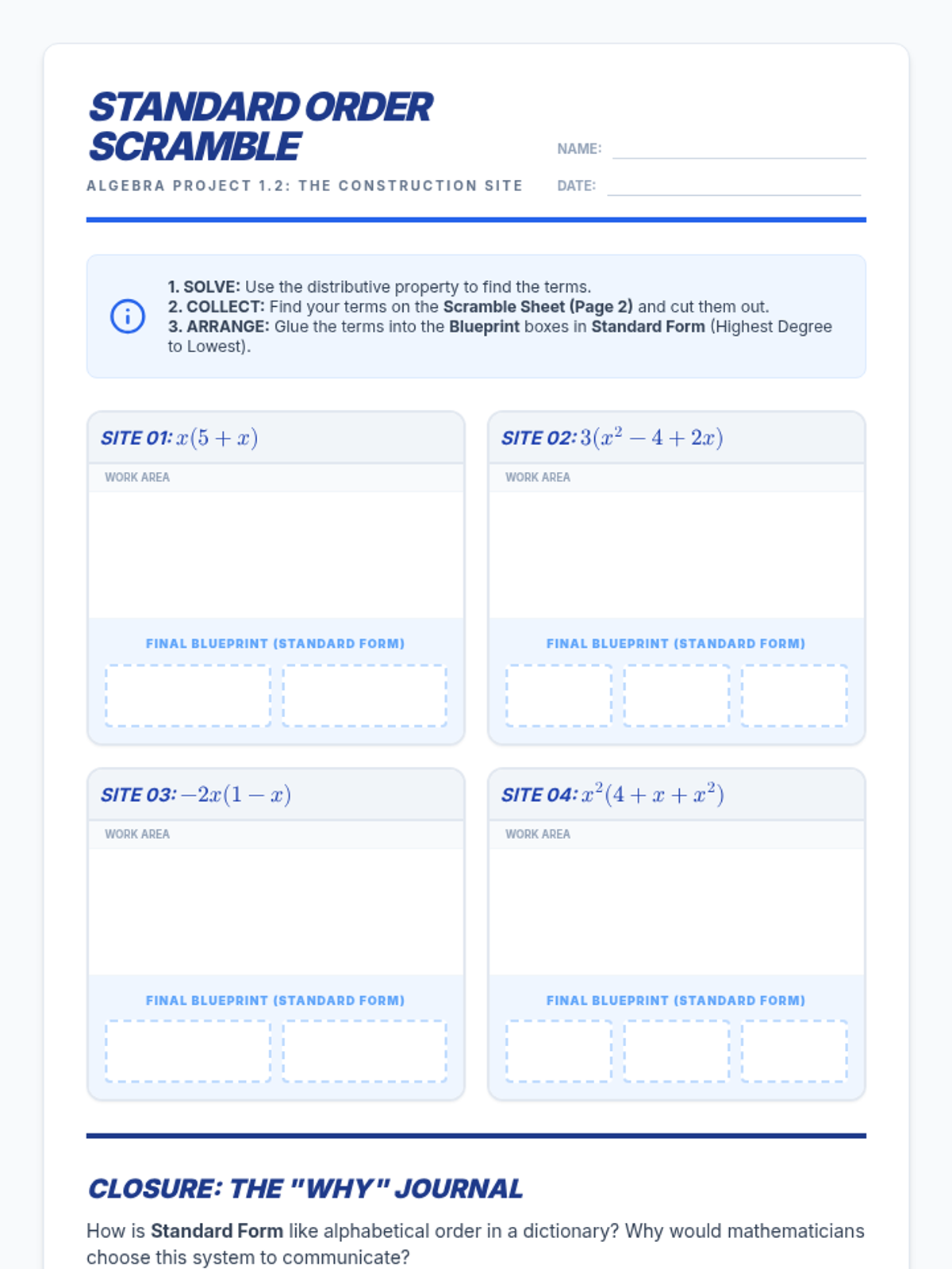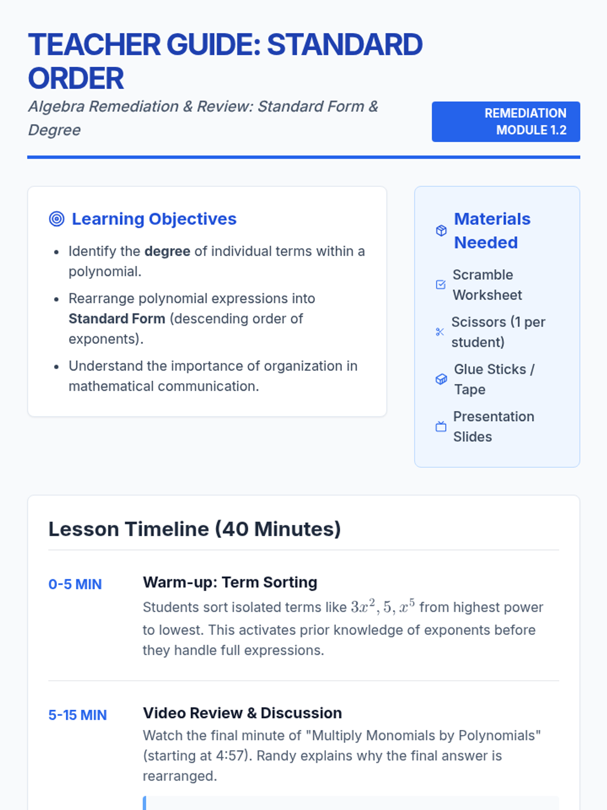 A remedial algebra lesson focused on mastering polynomial standard form and term degree through a tactile 'scramble' activity and video-based discussion. Students learn to recognize exponents as the 'rank' of terms and practice organizing expressions for better mathematical communication.