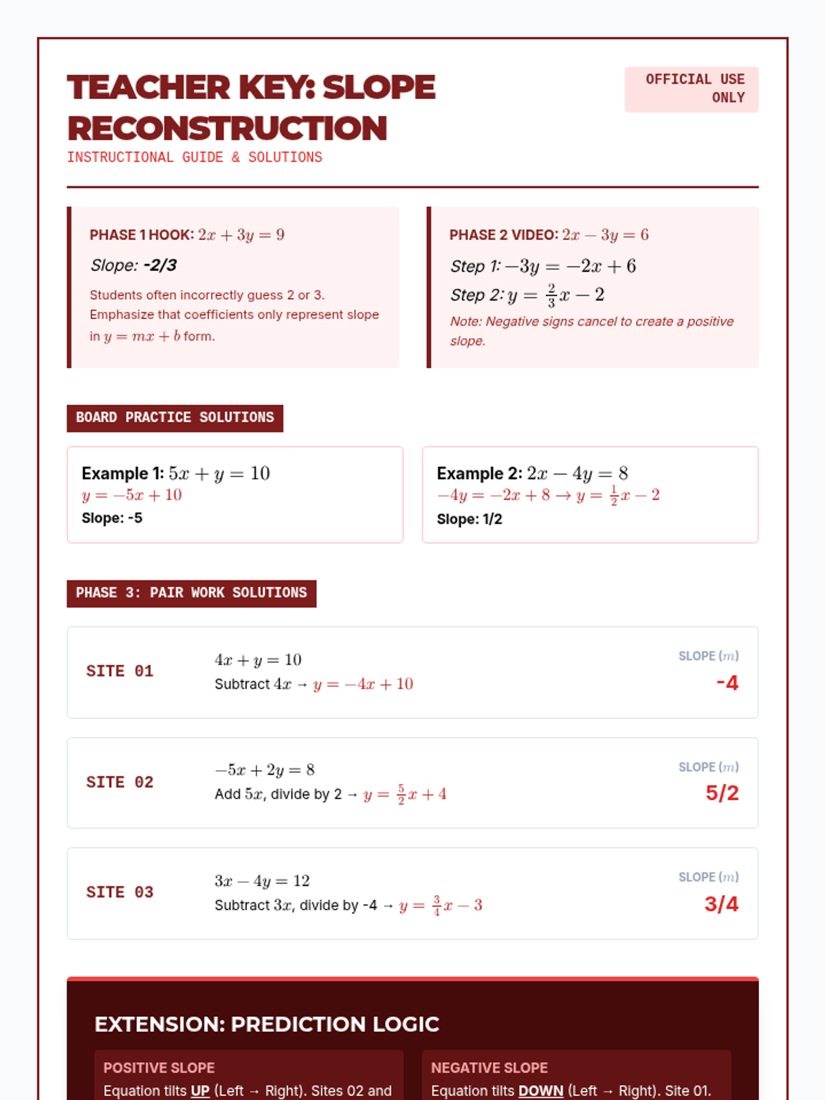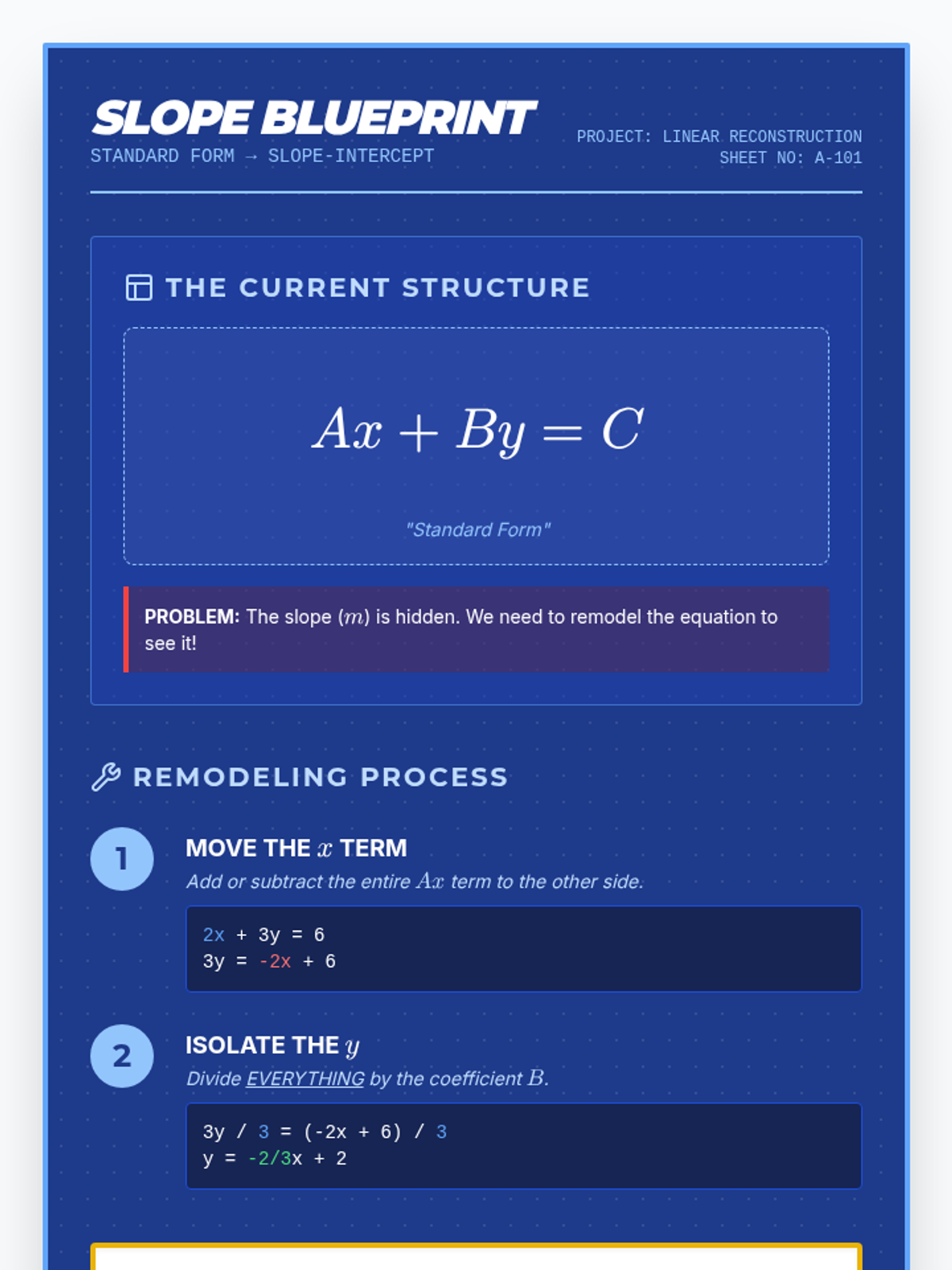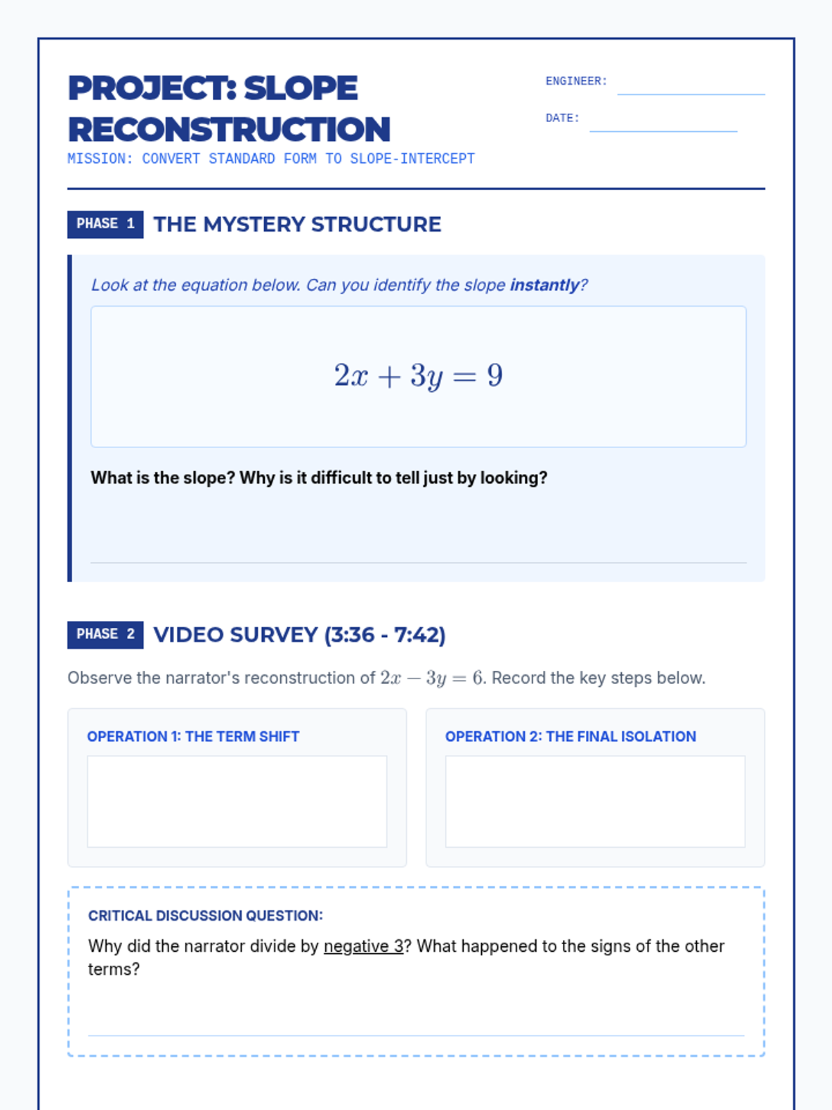 Students learn to convert linear equations from Standard Form ($Ax + By = C$) to Slope-Intercept Form ($y = mx + b$) through a focused video analysis and step-by-step algebraic manipulation. The lesson emphasizes isolating the y-variable and identifying the slope as the coefficient of x.